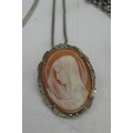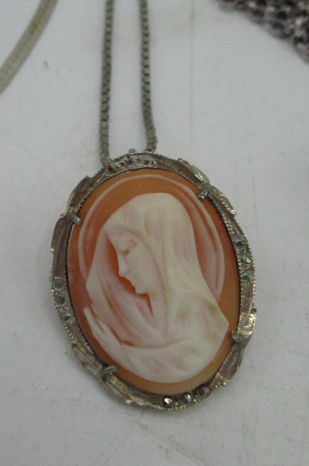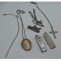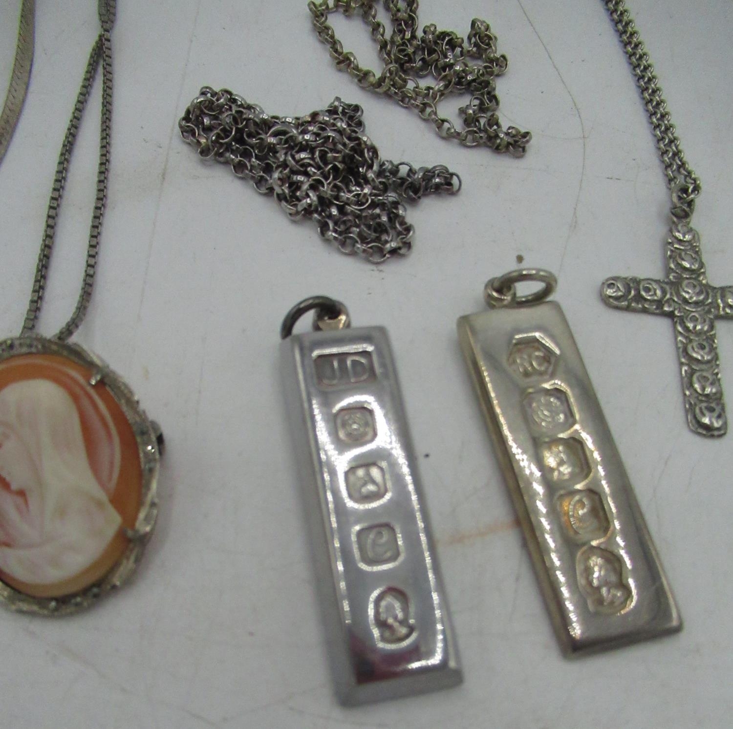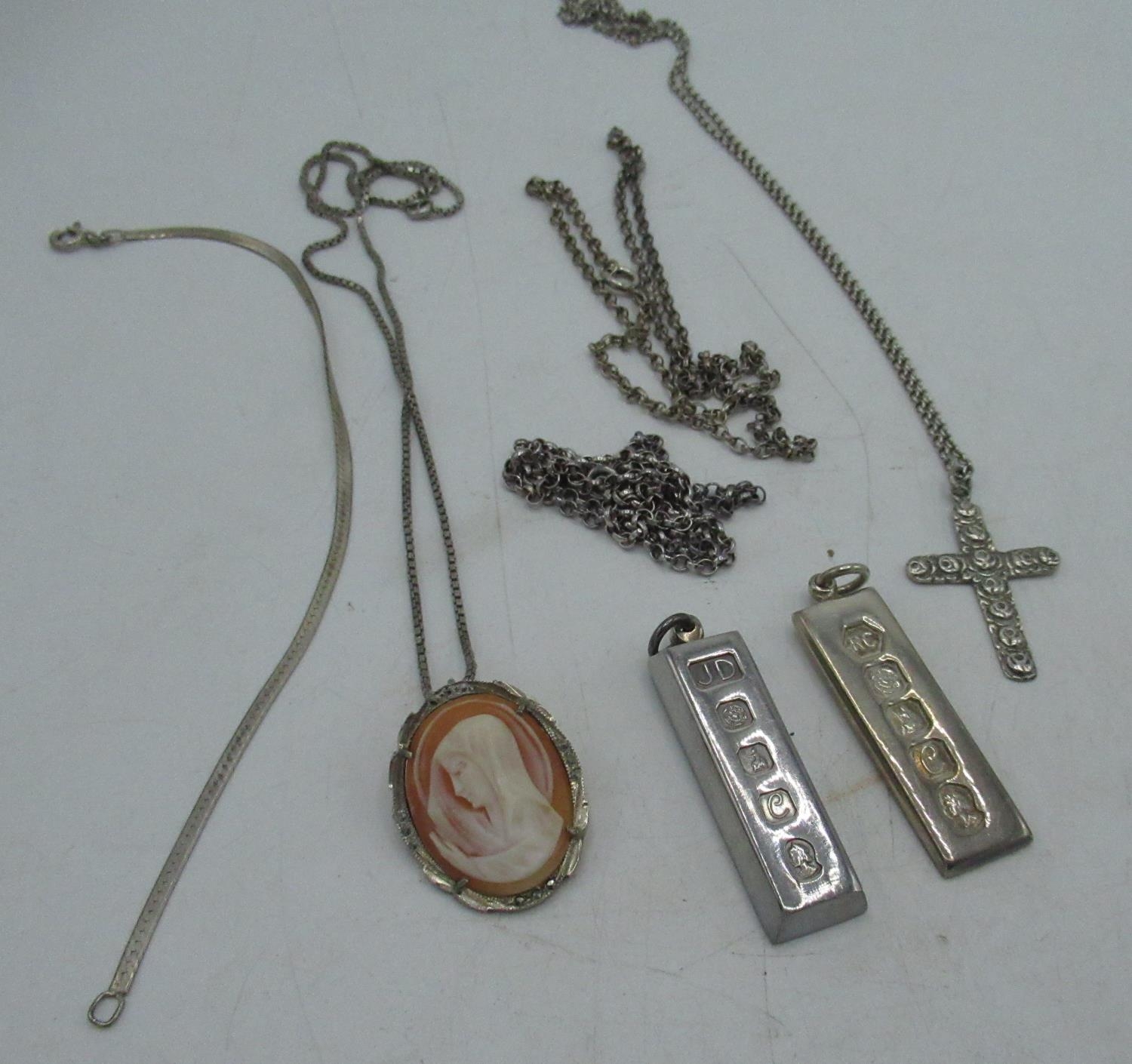 Two hallmarked Sterling silver ingot pendants by JD and RC, Sheffield, 1977, a snake chain bracelet stamped 925, a cross pendant stamped Sterling on a silver chain, a cameo pendant/brooch (AF) in a silver mount stamped 800, on a box chain necklace, and two Sterling silver belcher chain necklaces, gross 2.41ozt (7)