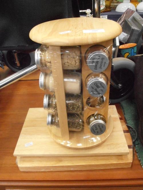 TWO CHOPPING BOARD ALONG WITH SPICES AND HERBS IN A RACK