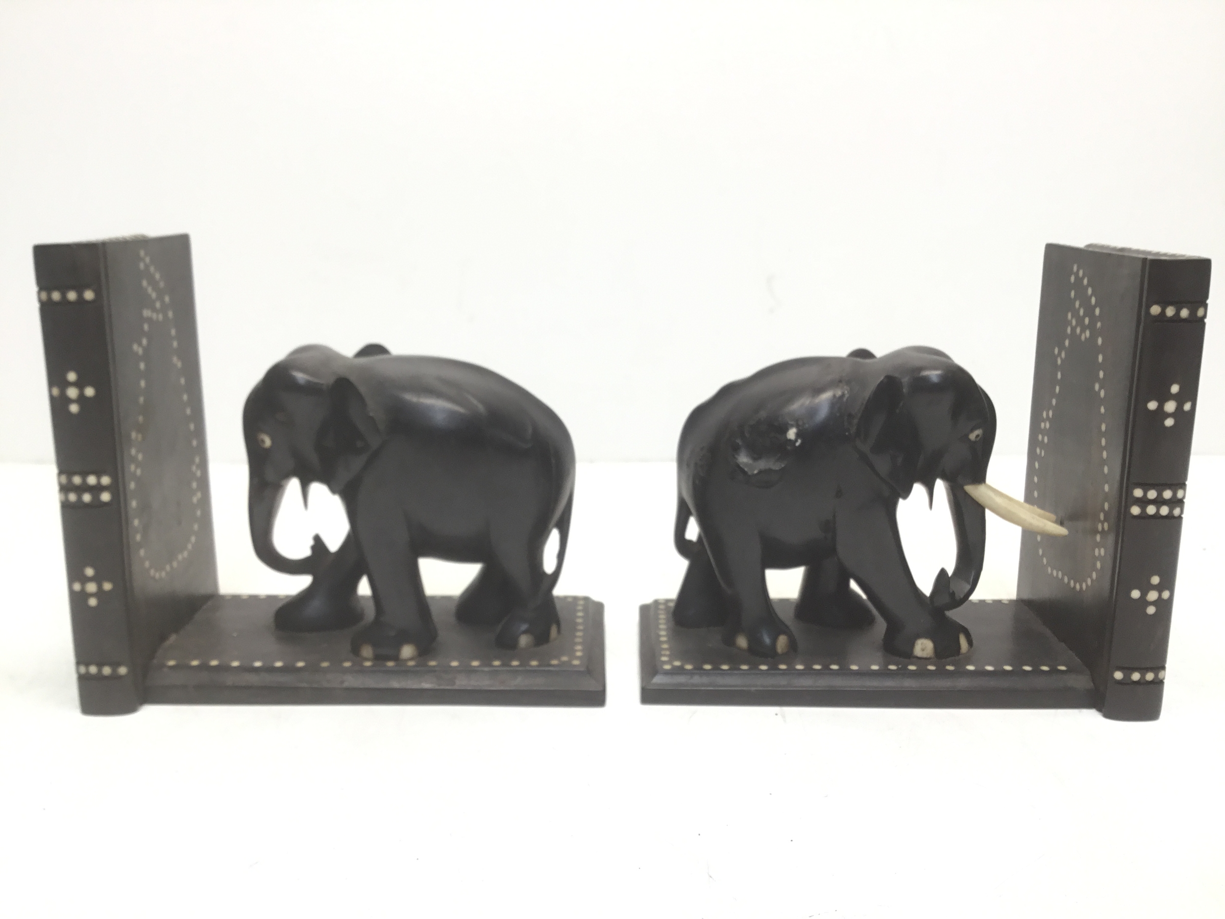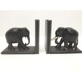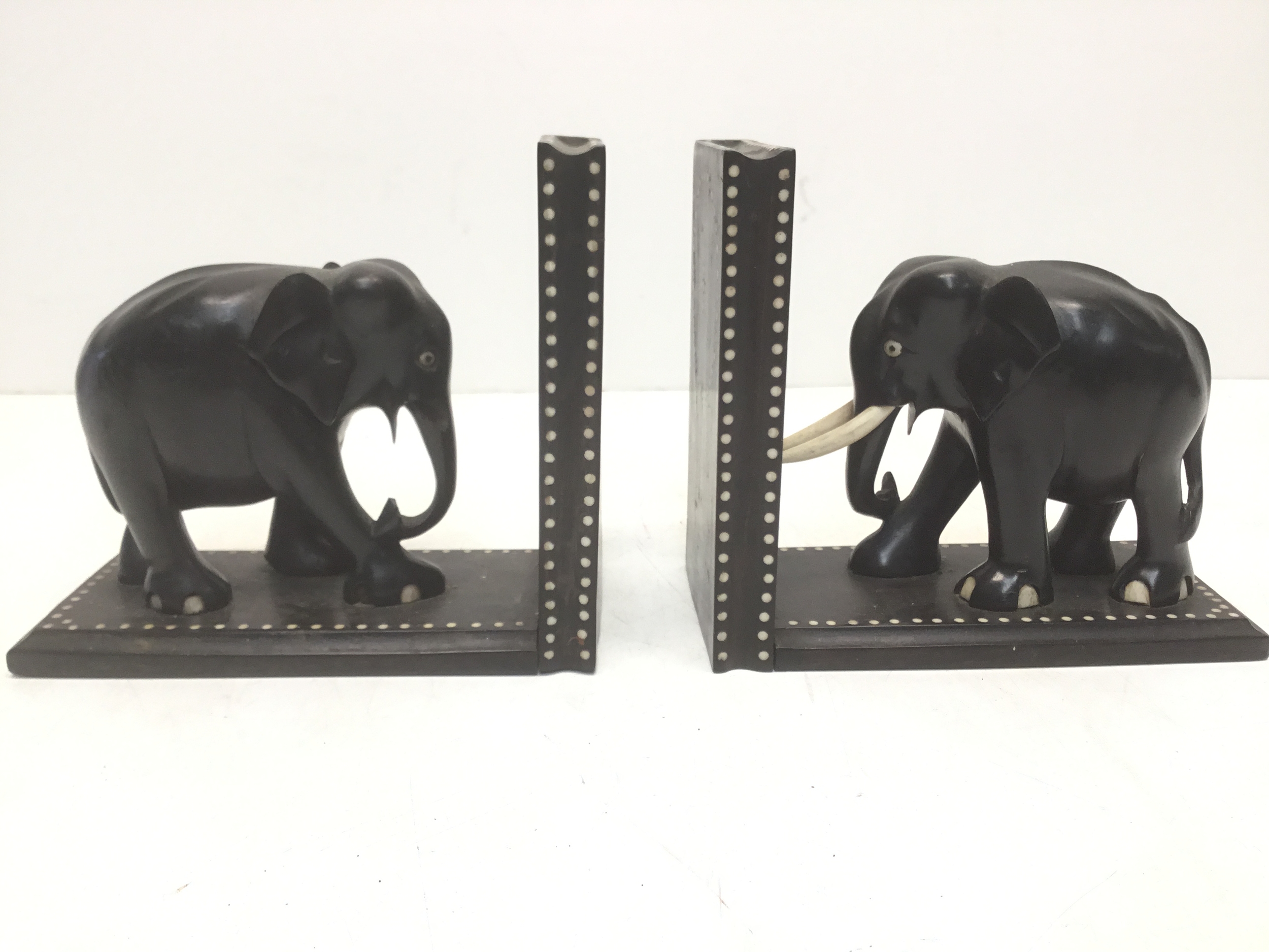 A pair of black ebonised elephant bookends with faux ivory inserts (slight damage)