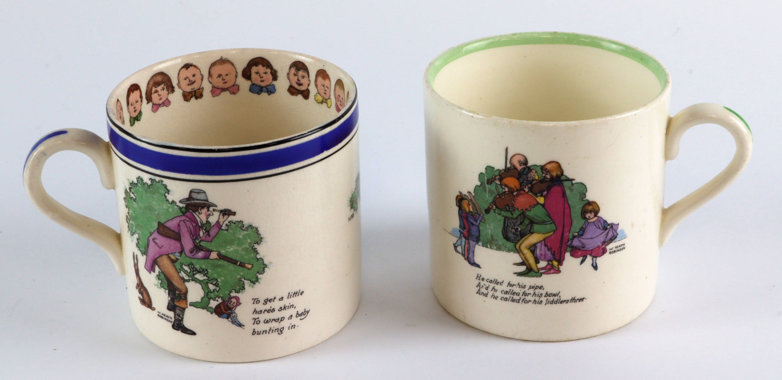 Mugs. Two W. Heath Robinson Nursery Child's mugs, made by Midwinter, circa 1932-41, one has Childrens' faces round the rim