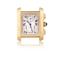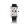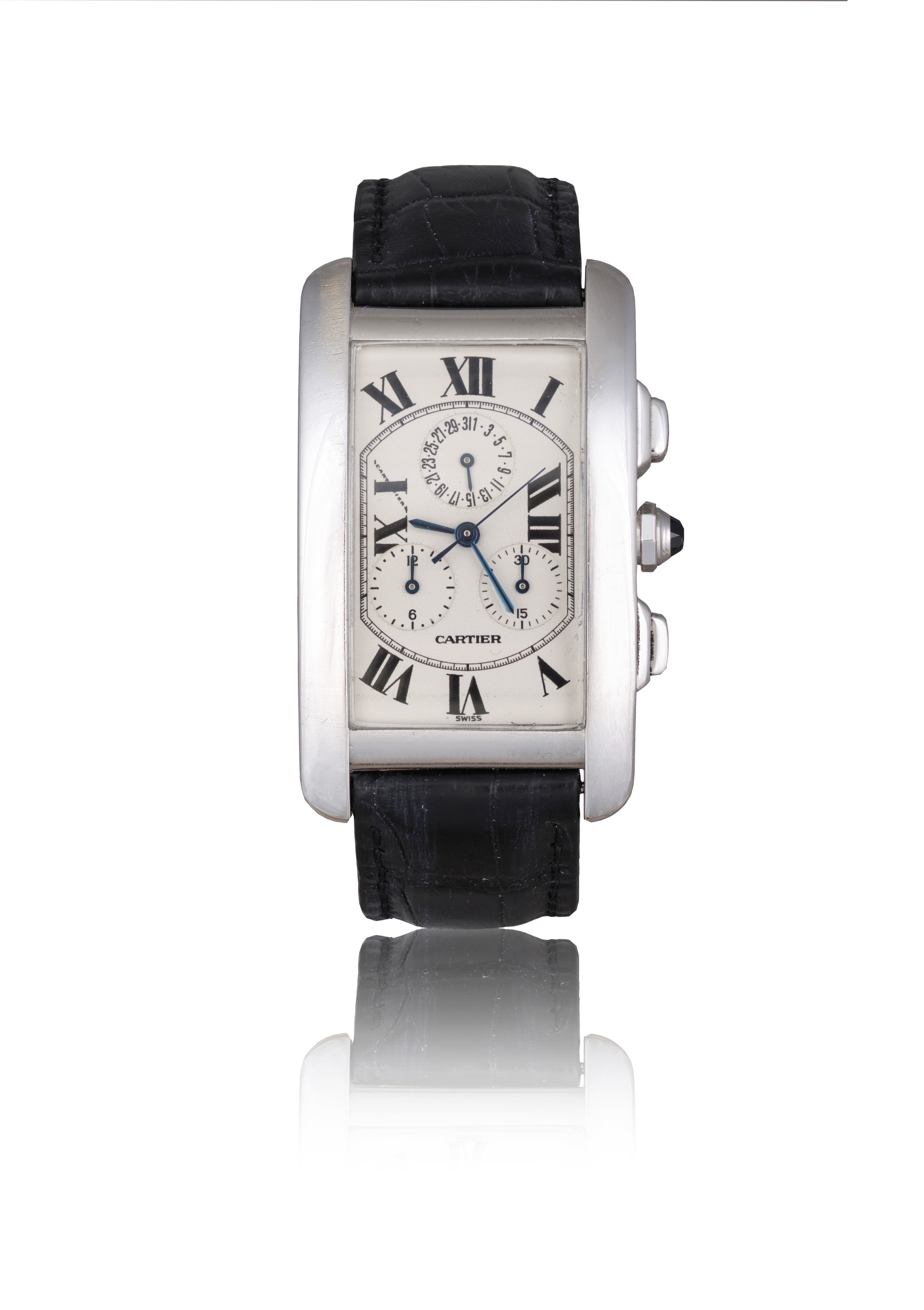 CARTIER TANK CINTRÉE, REF. 2570, 18K WHITE GOLD WRISTWATCH An elegant and refined 18K white gold wristwatch by Cartier Circa: 2000s Dial: Silvered dial with black Roman numerals, chemin de fer minute track, three subsidiary dials, blued steel hands Movement: Quartz, Cartier calibre 212P Case: 18K white gold curved rectangular case, ref. 257013CD, snap caseback secured by screws Size: 26 x 45 mm approx. Bracelet/Strap: Later black leather strap with Cartier 18K white gold pin buclke. Gross Weight: 60 g approx. Signature: Dial, case and movement signed