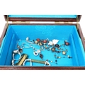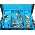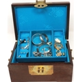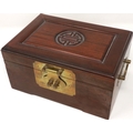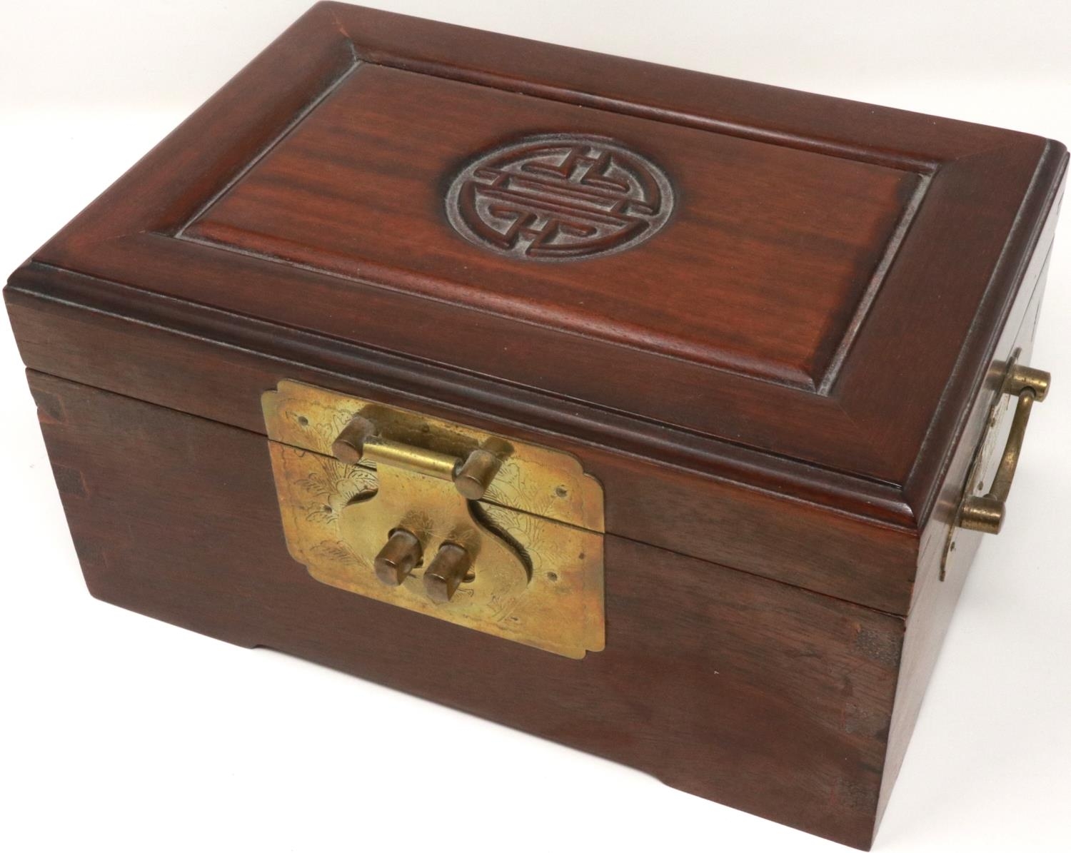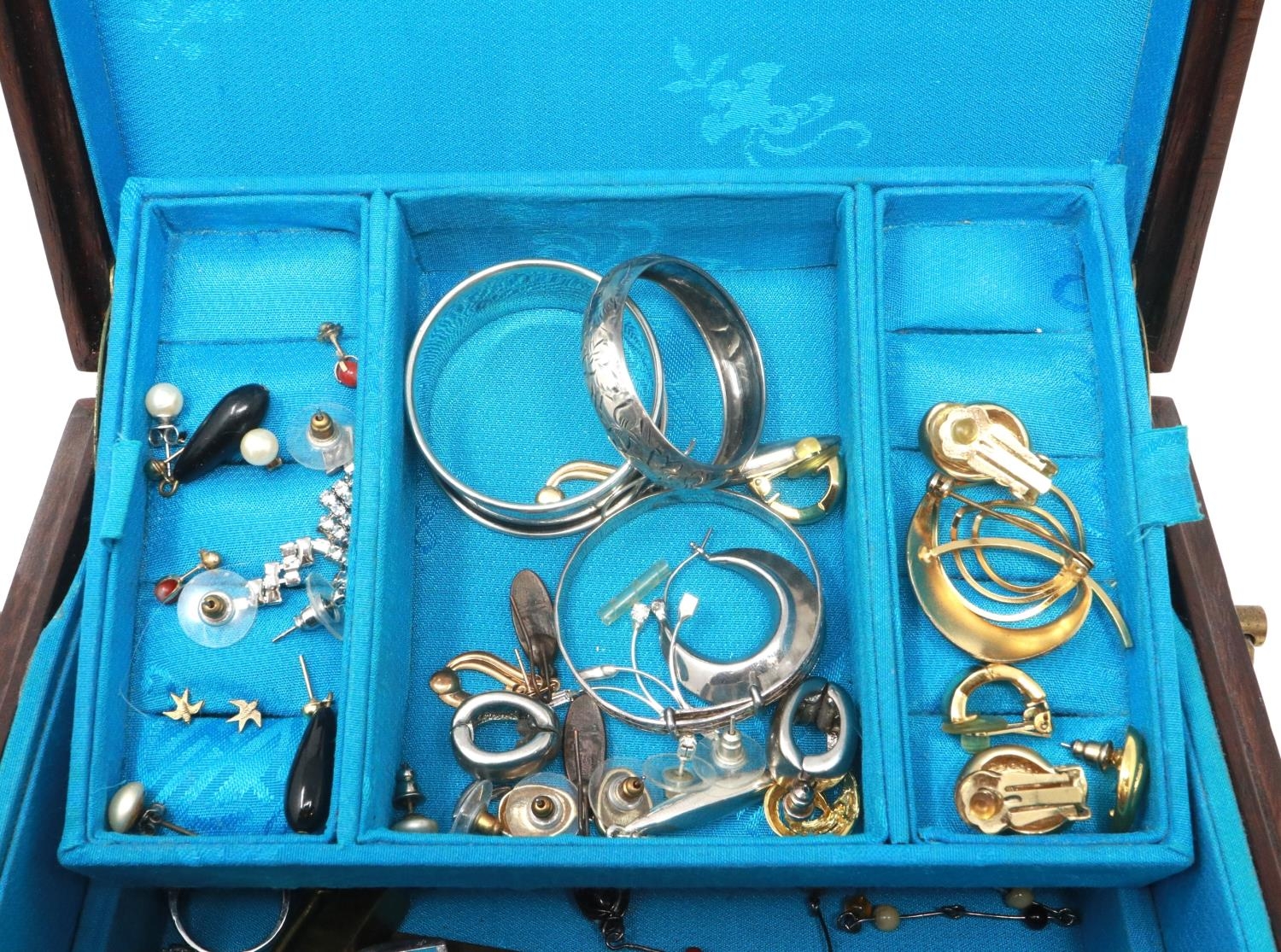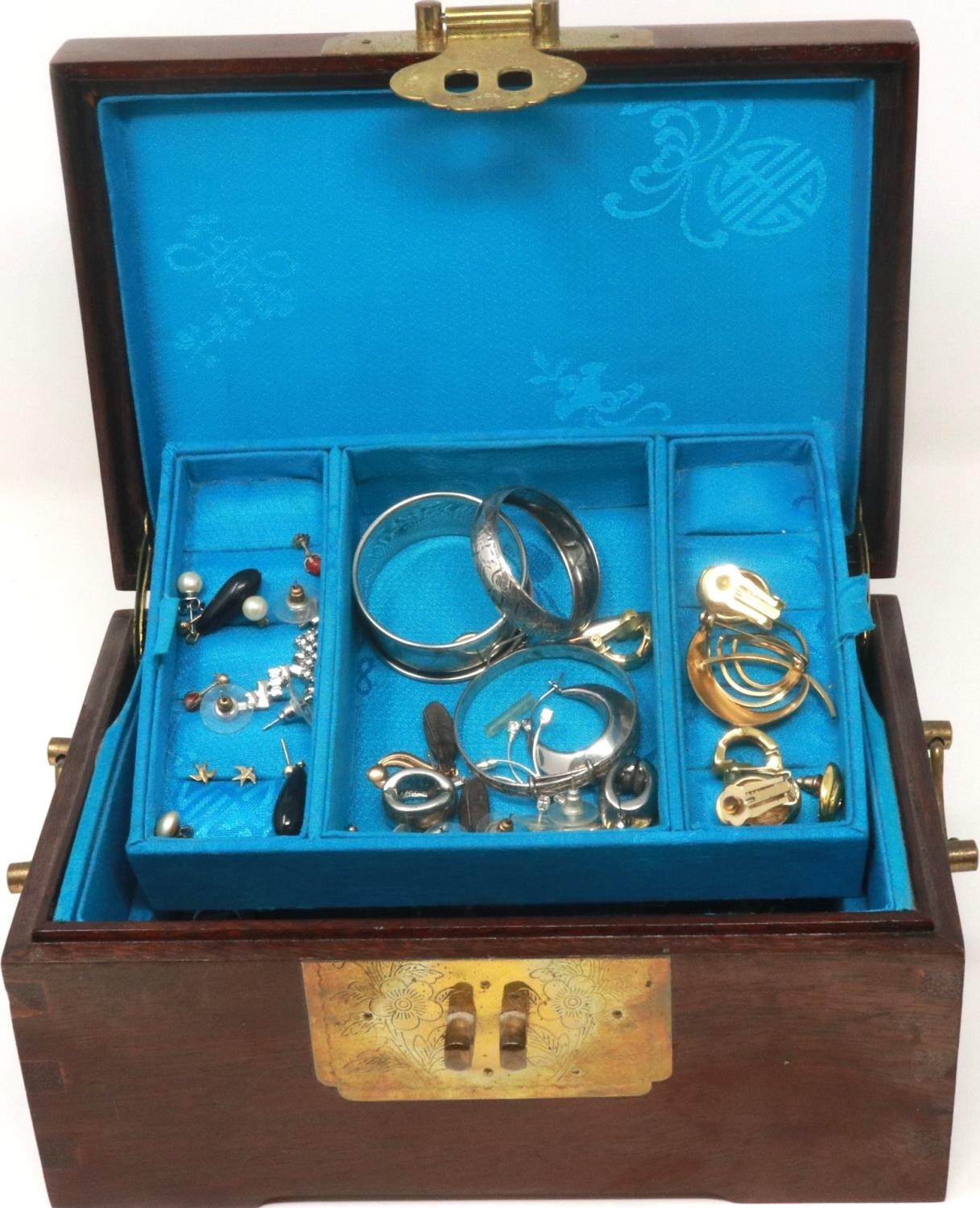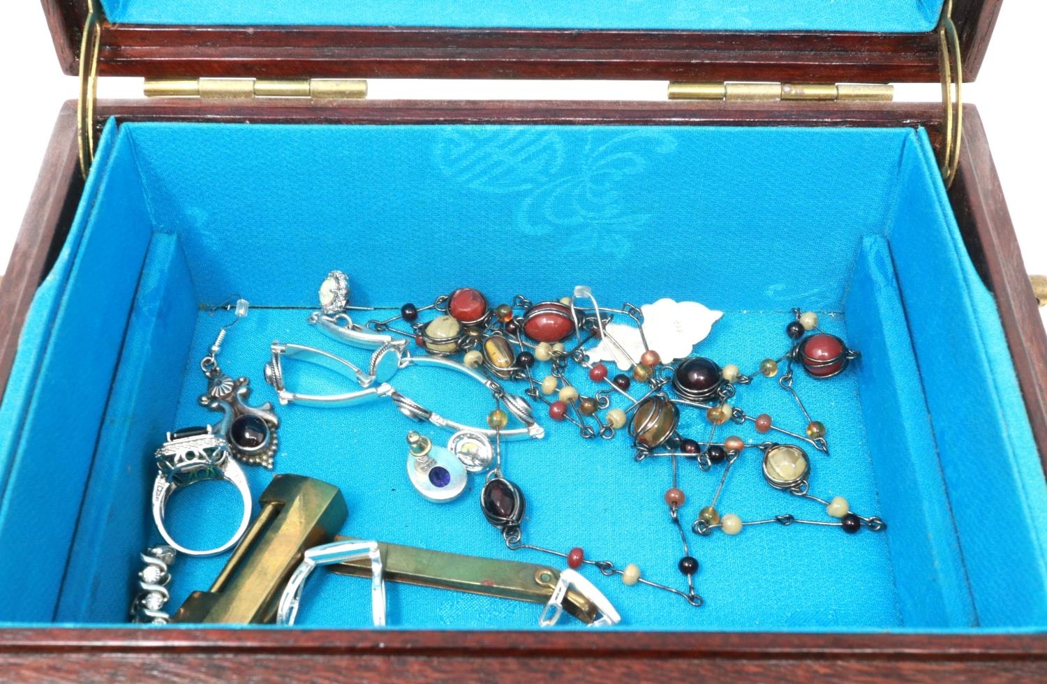 Oriental hardwood jewellery box with mainly silver jewellery contents. P&P Group 1 (£14+VAT for the first lot and £1+VAT for subsequent lots)