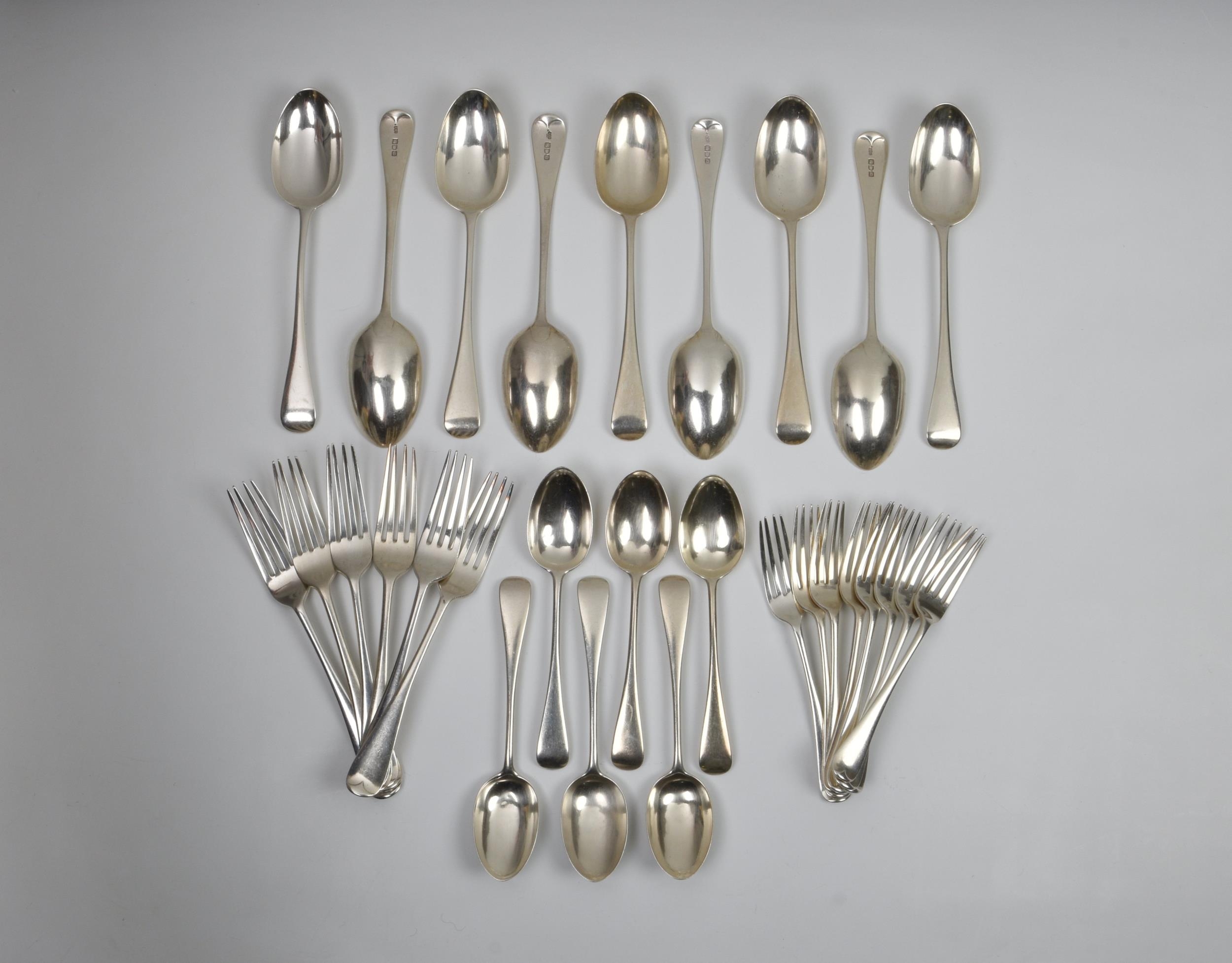 A collection of Victorian silver Old English pattern flatware, Spink & Son, London, 1897, comprising of nine table spoons,8¾in. (22.3cm.) long, six dinner forks, eight starter forks, six dessert spoons, weight 57.3 tr.oz. (29). * Light surface wear only, a couple overstruck, good.