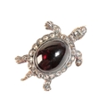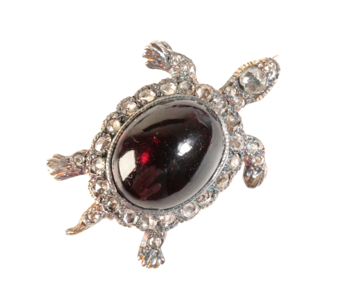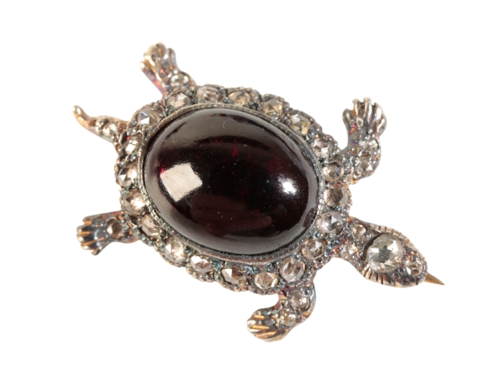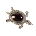 A GARNET AND DIAMOND TORTOISE BROOCH, the cabochon garnet collet-set within a framed body of old-cut diamonds, set on unmarked yellow metal, the reverse with pin fastener.