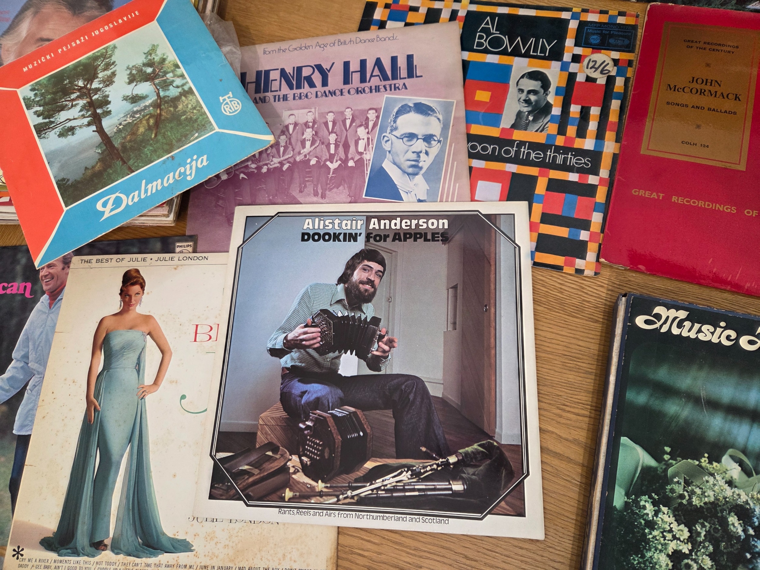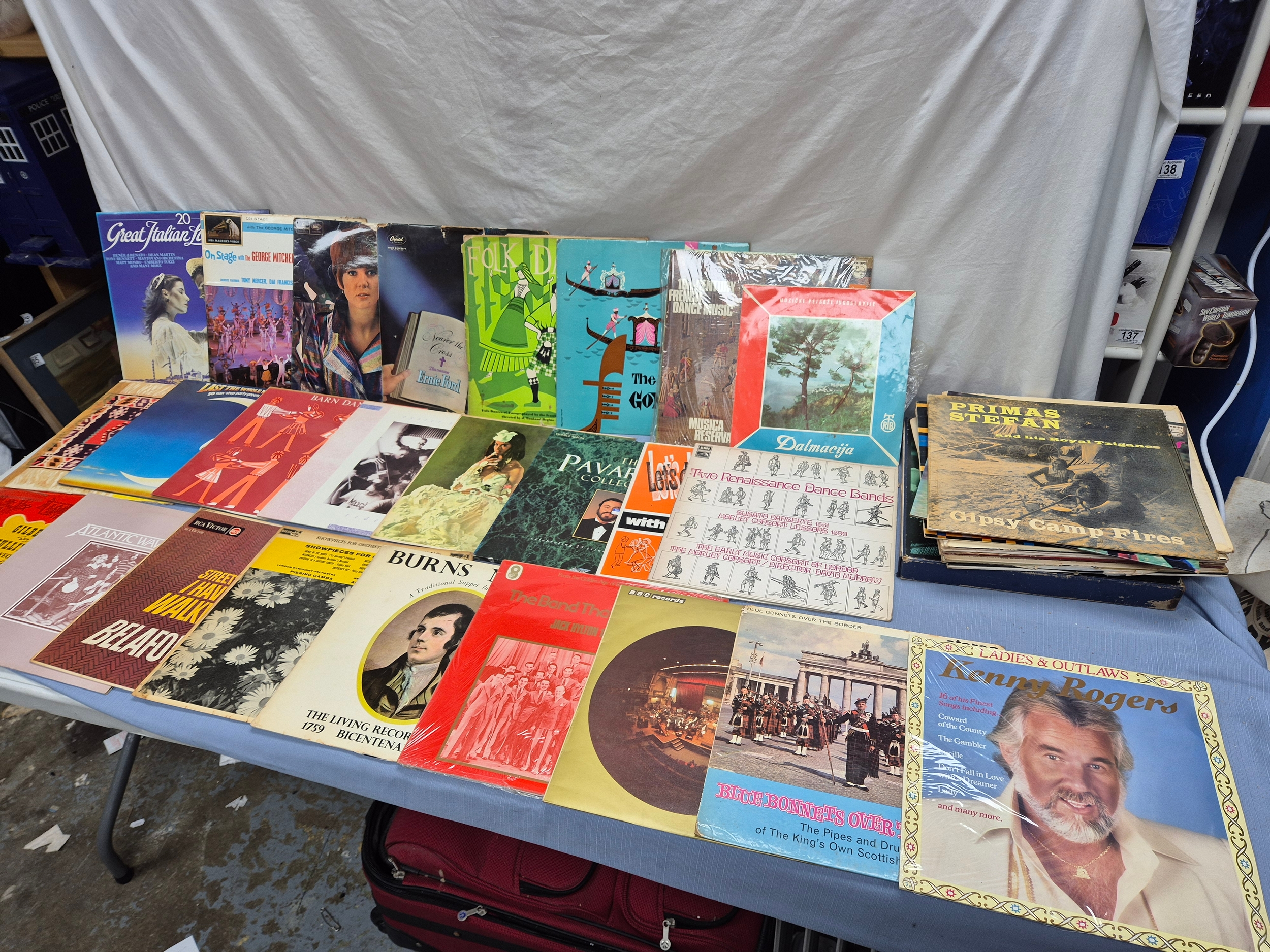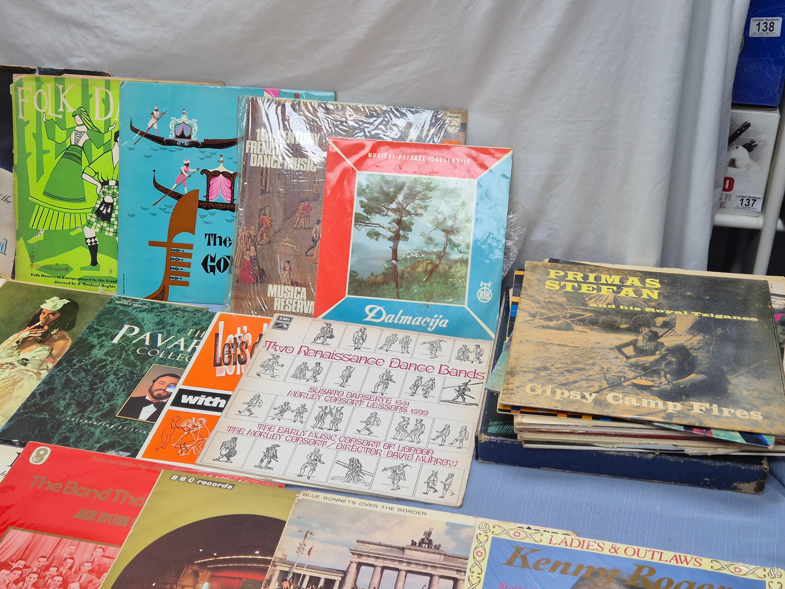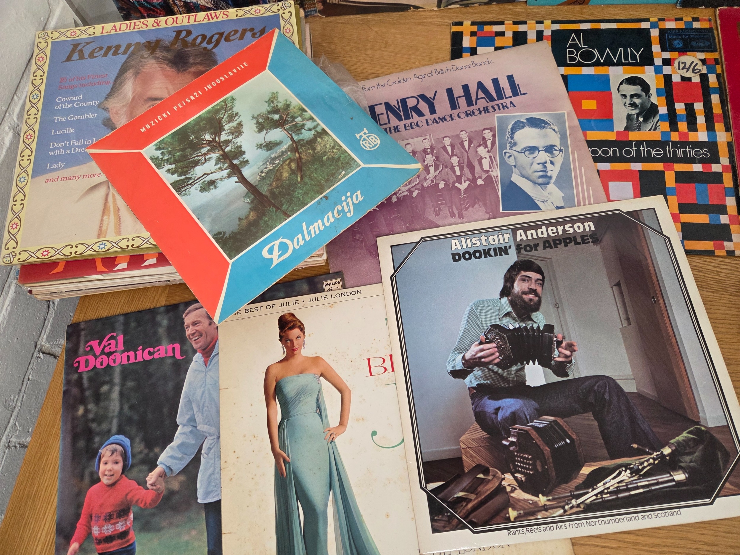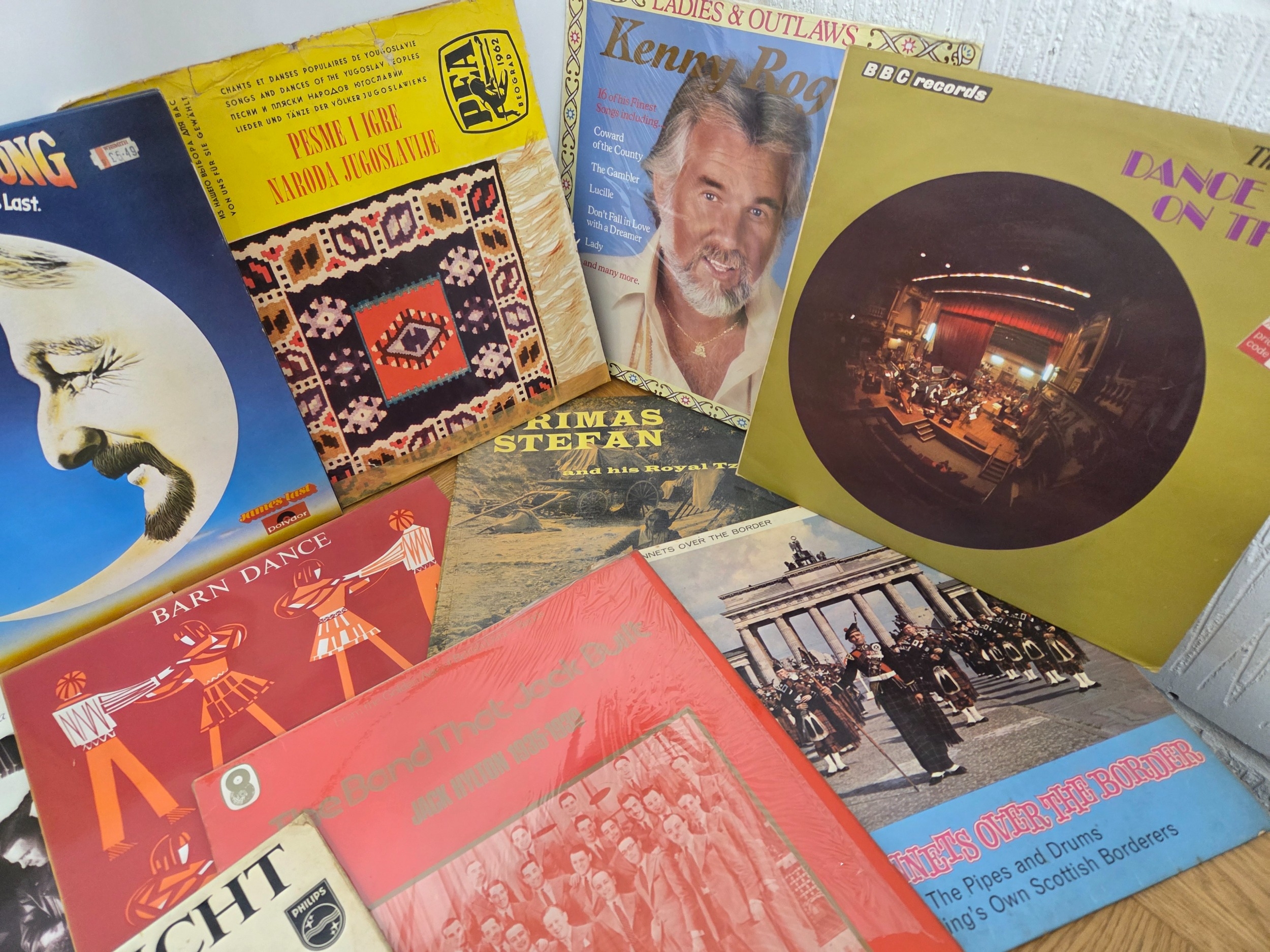 Collection of vinyl records including Kenny Rogers, Primas Stefan, and various folk music albums.