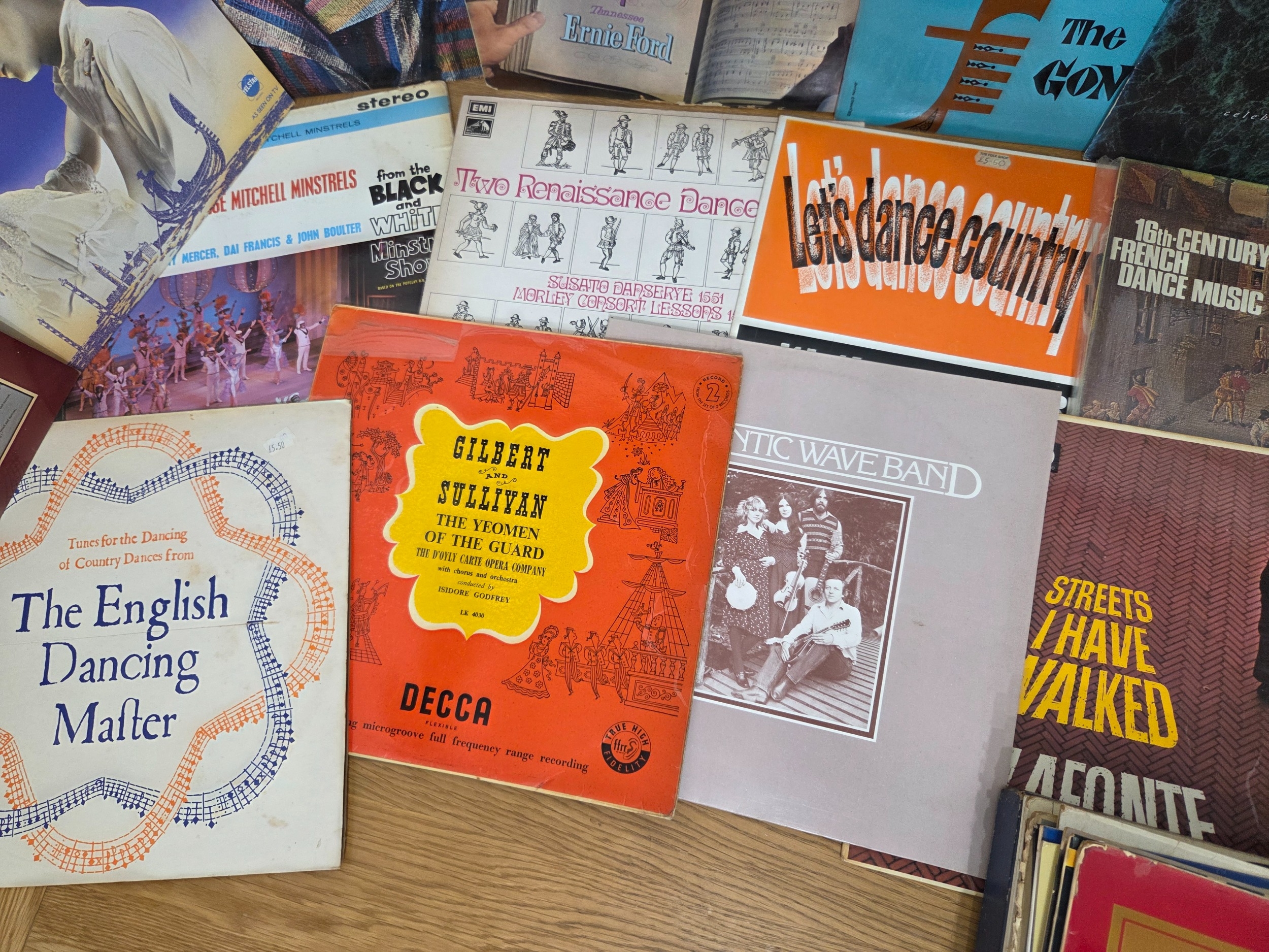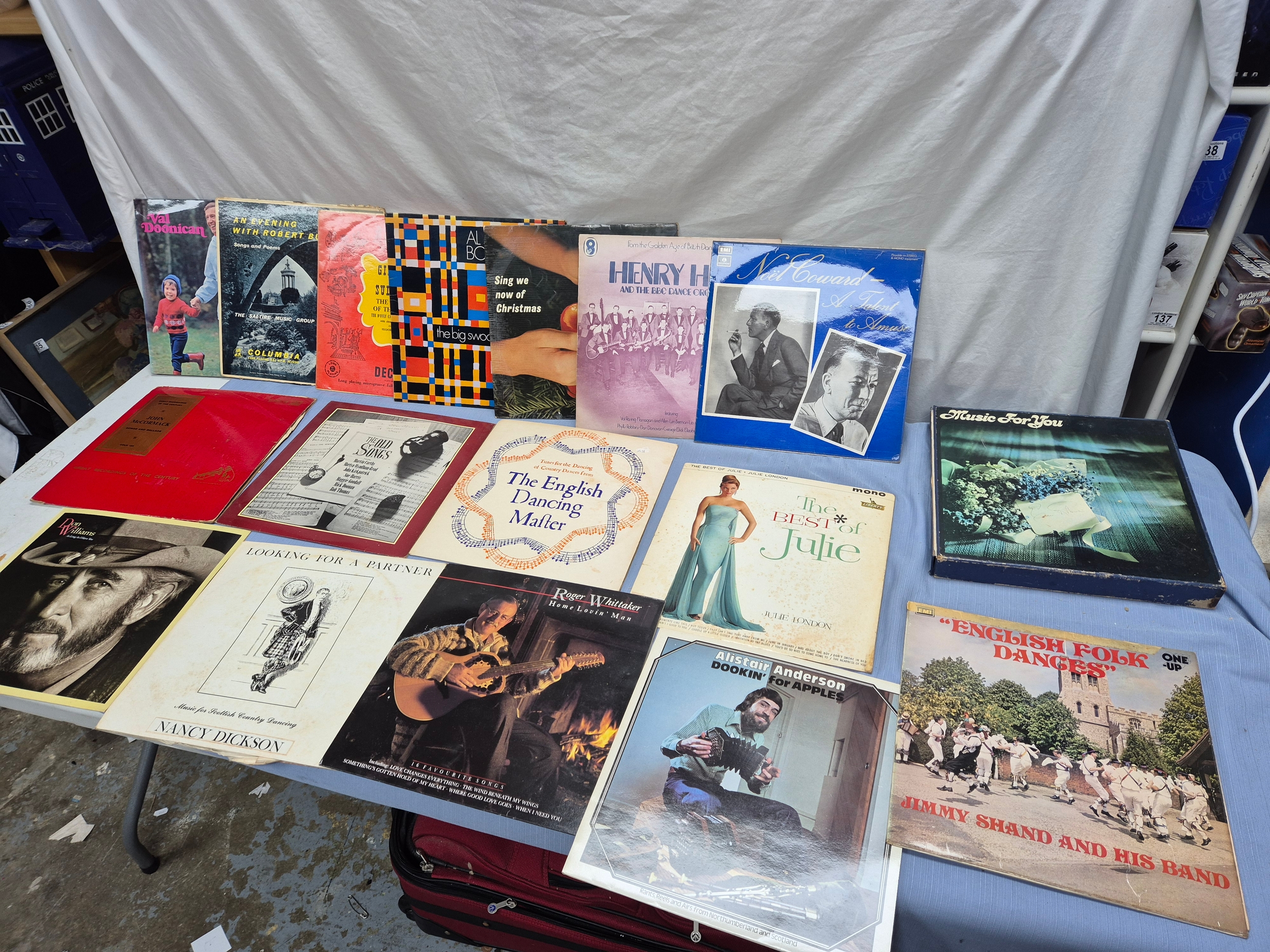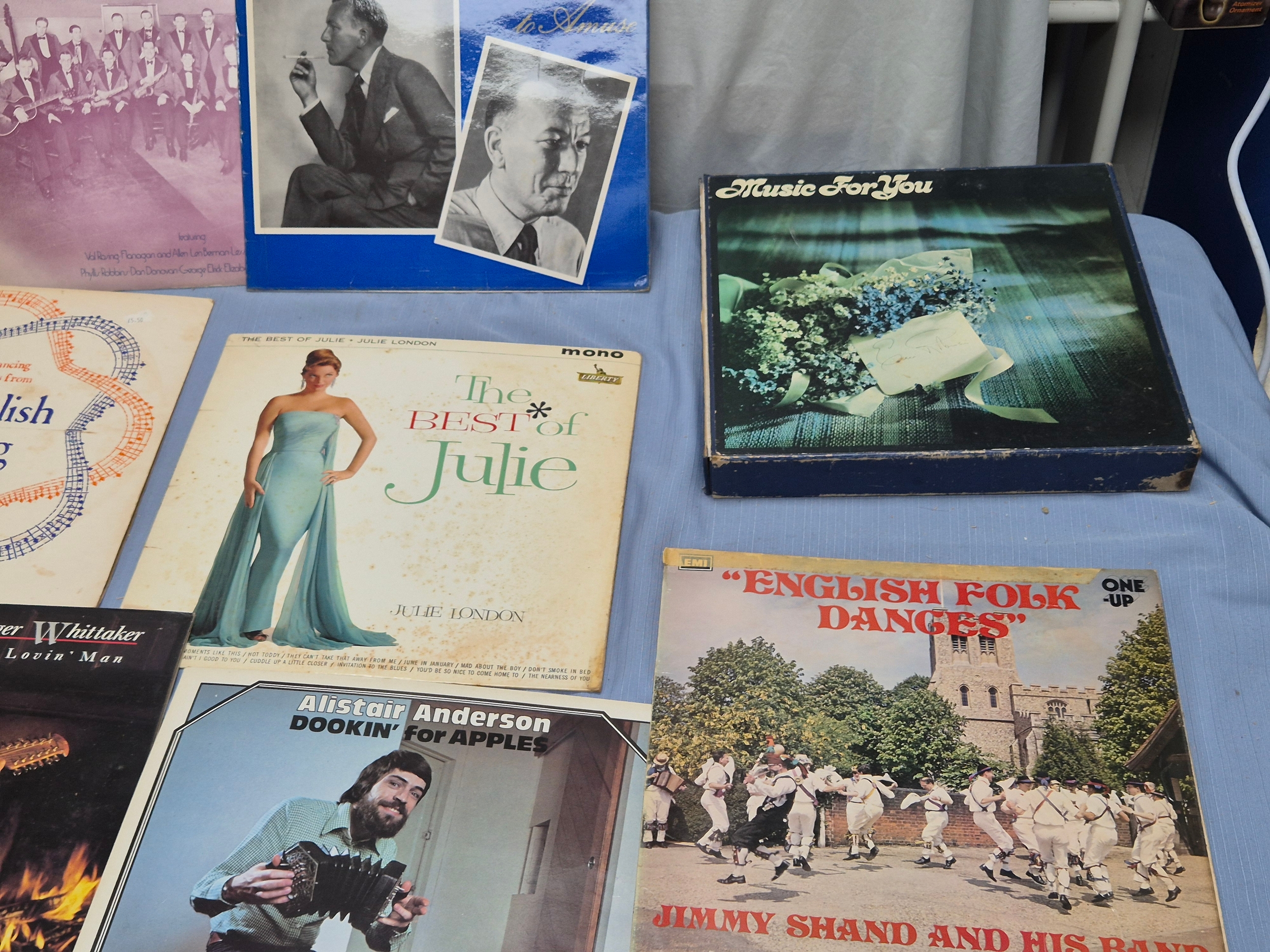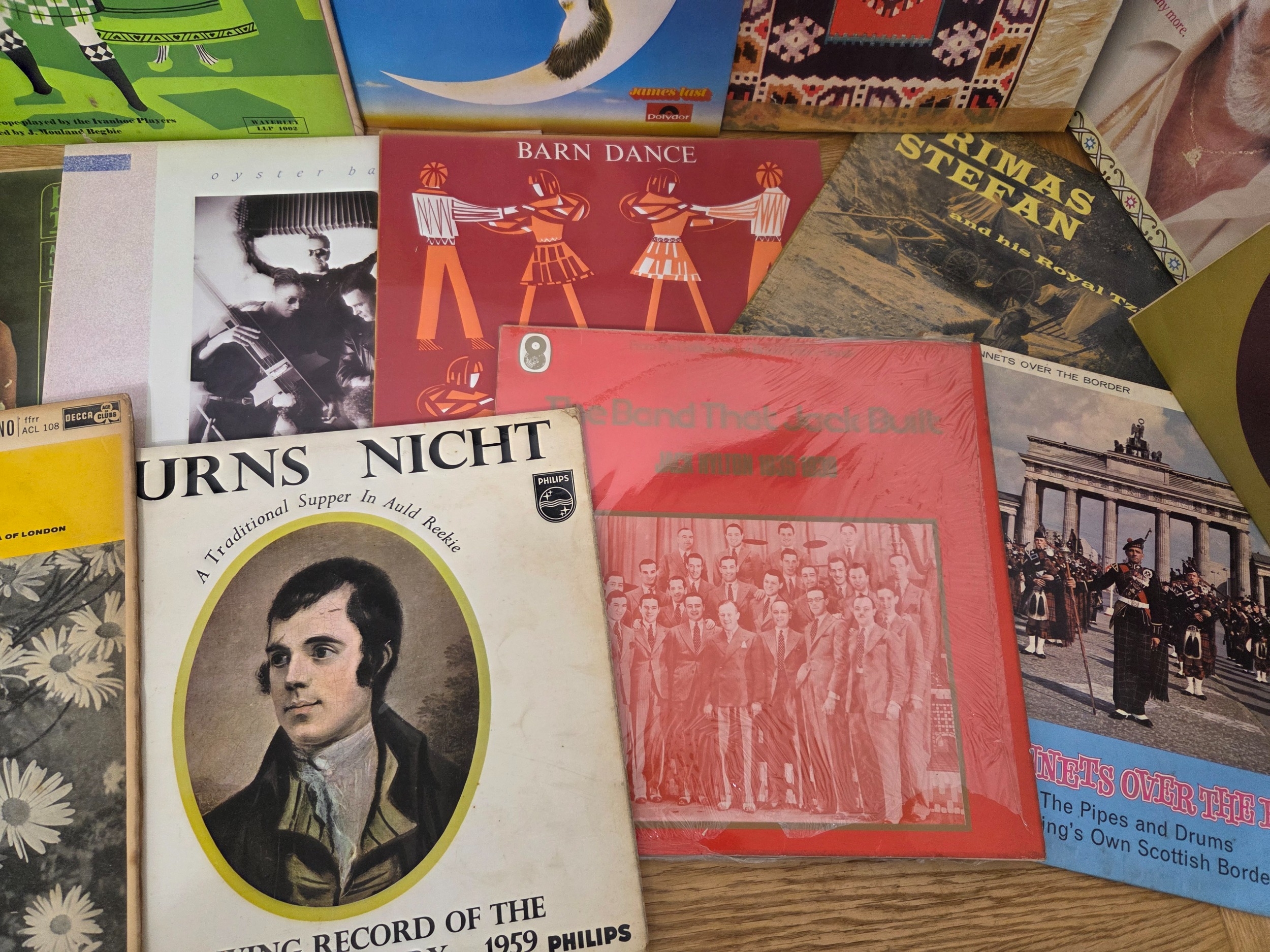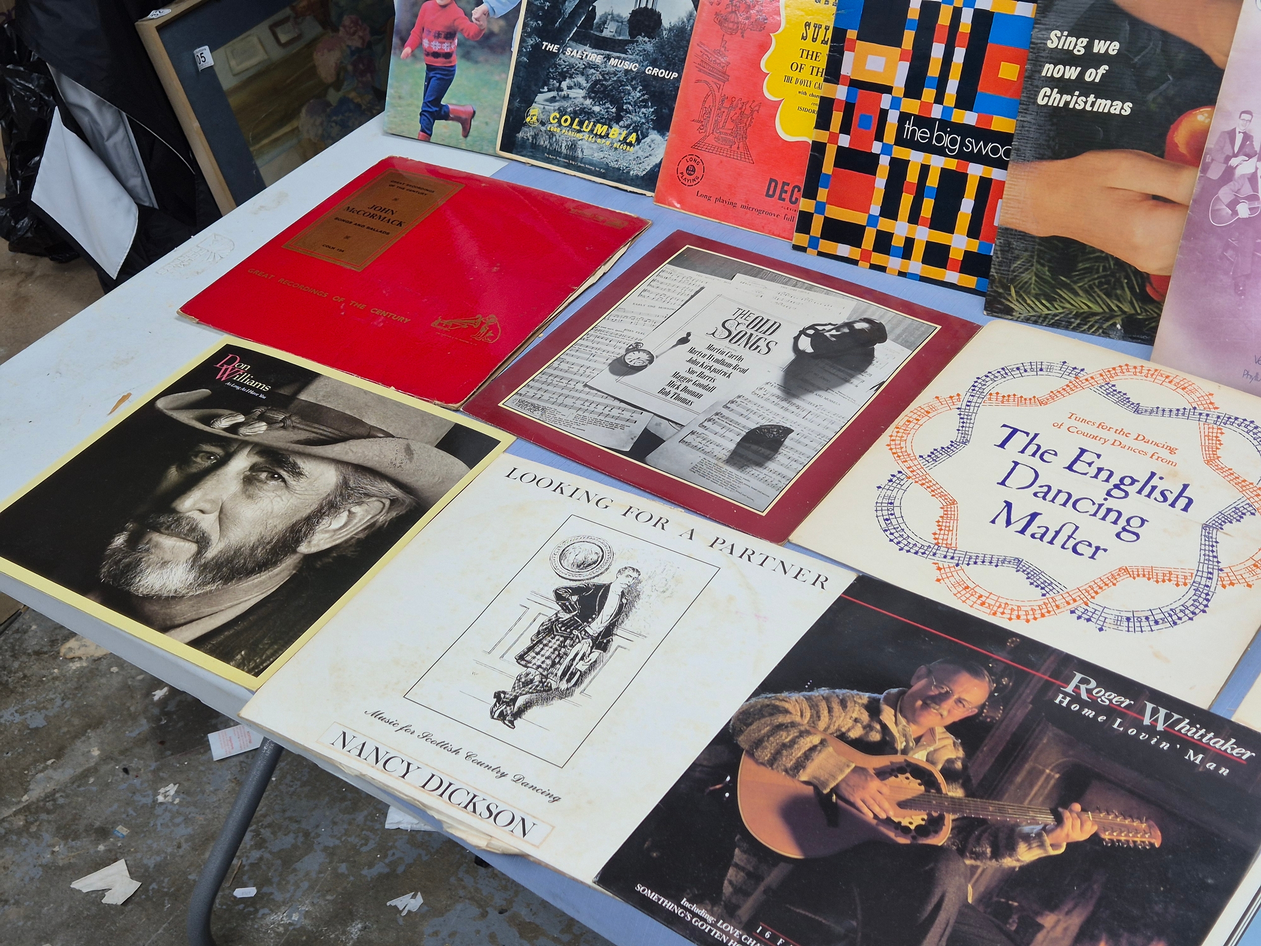 Collection of vinyl records including Kenny Rogers, Primas Stefan, and various folk music albums.