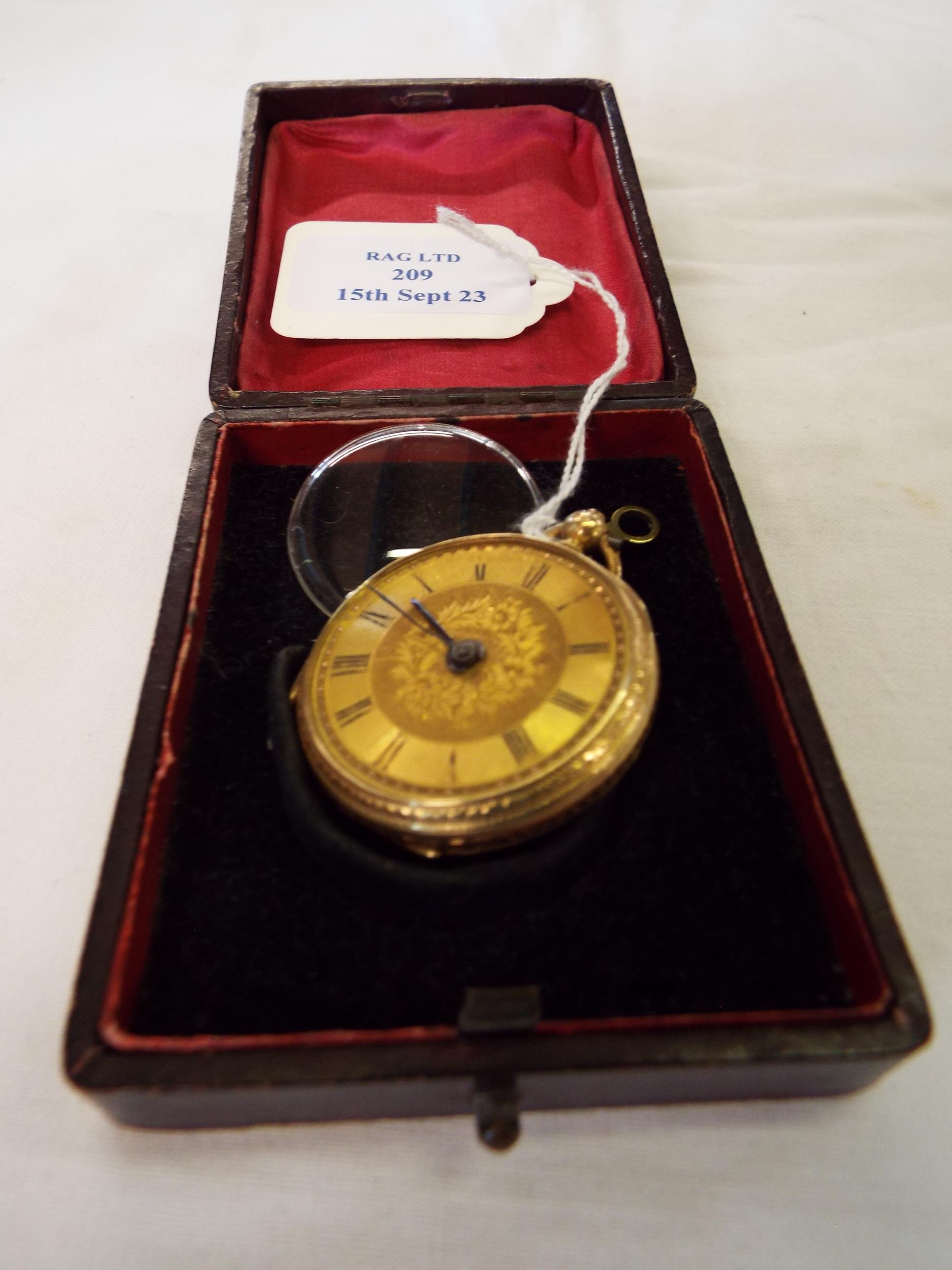 An 18ct gold ladies fob watch with engraved dial Roman numerals