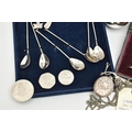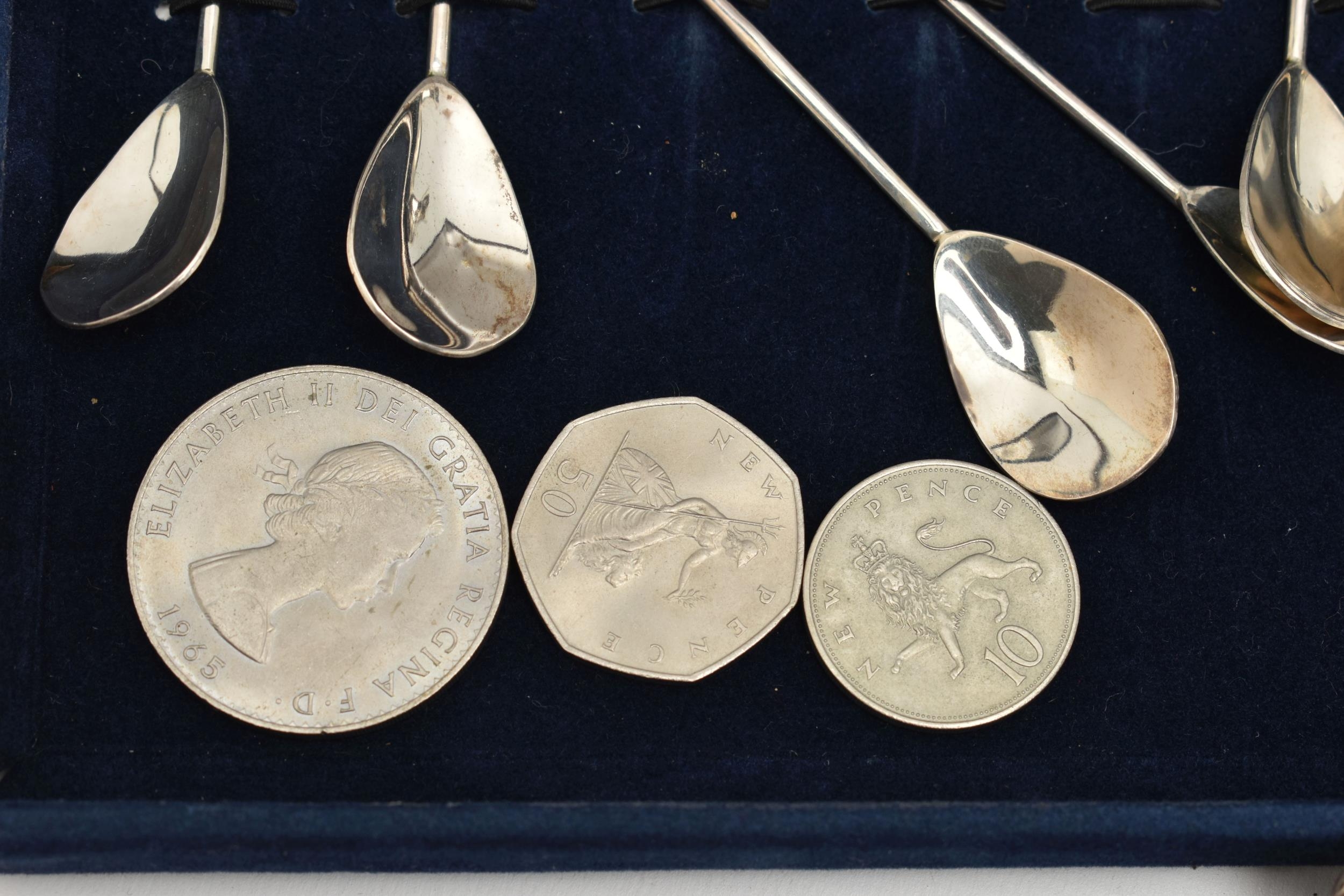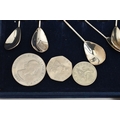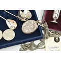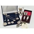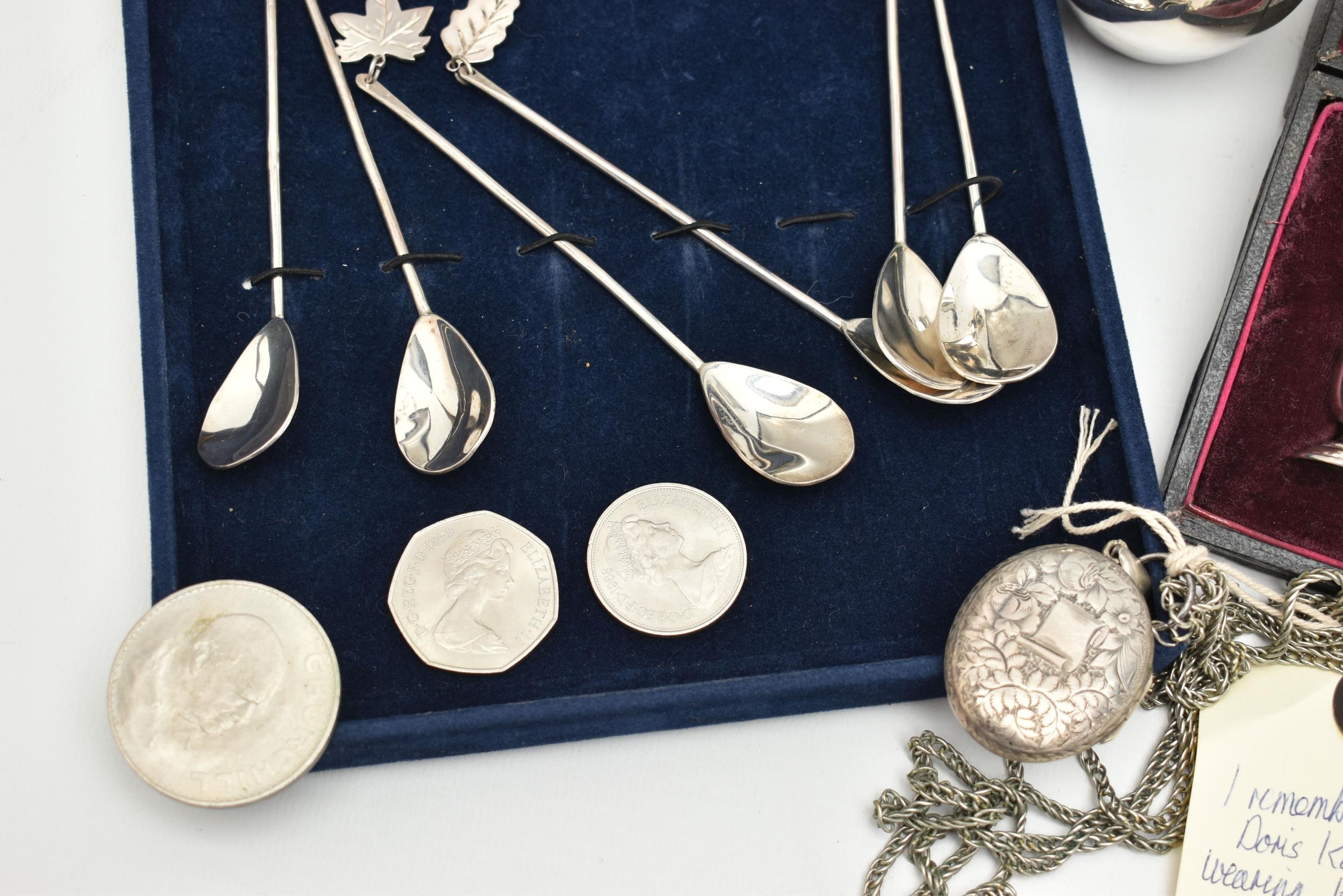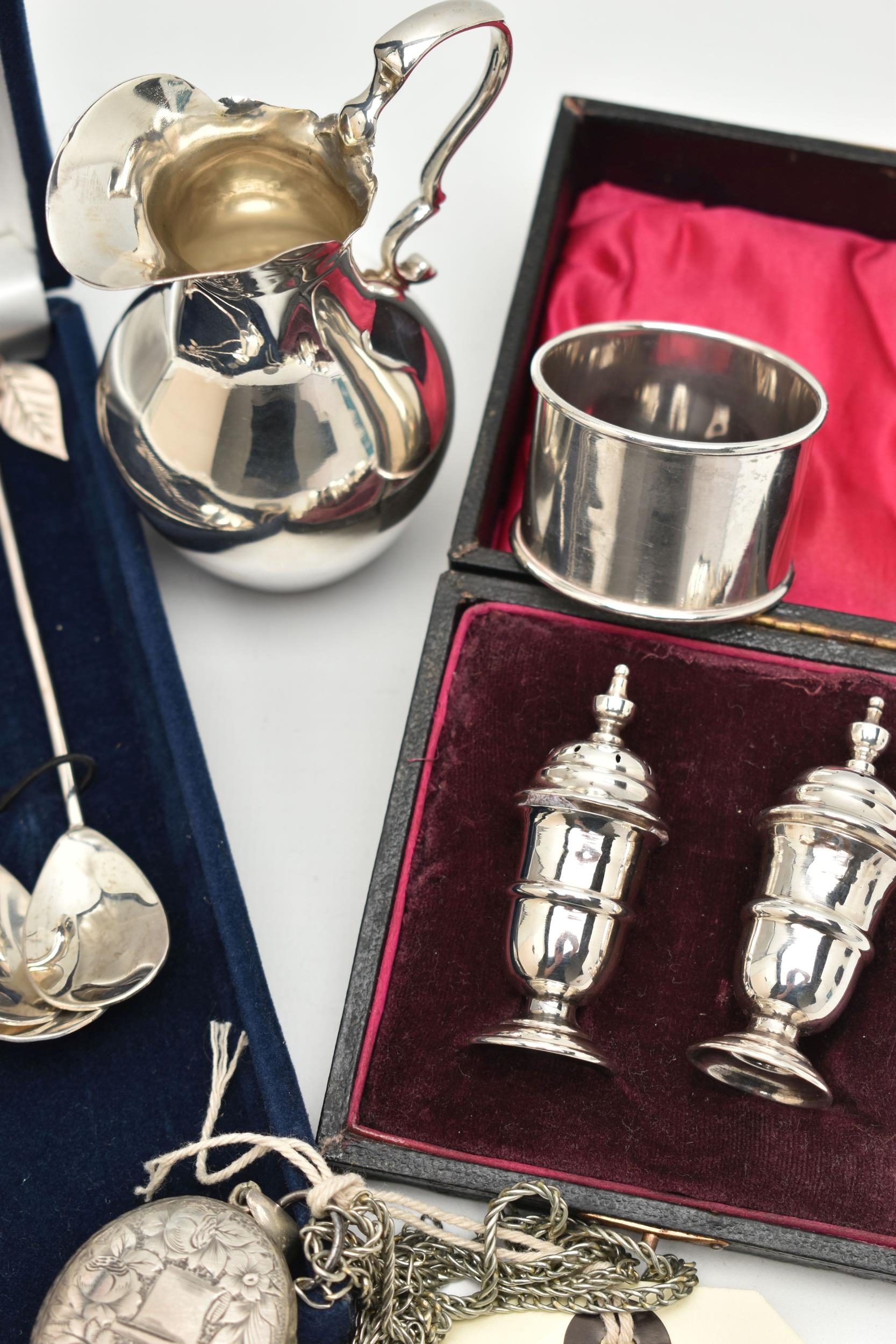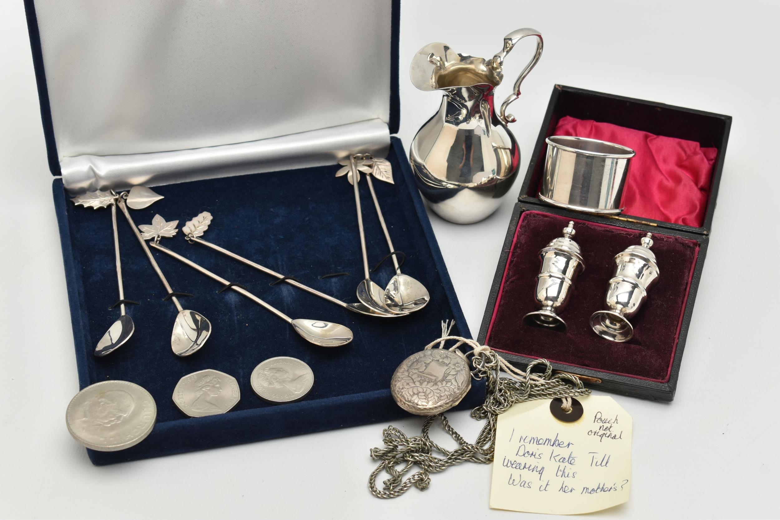 ASSORTED SILVER ITEMS, to include a cased set of spoons, each fitted with a leaf charm to the terminals, hallmarked 'Merriman Silver Ltd' Sheffield, a silver polished jug, hallmarked 'Robert Pringle & Sons' Chester, a single napkin ring hallmarked Birmingham, a cased set of miniature pepperettes, each hallmarked 'Robert Pringle & Sons' Birmingham, approximate gross weight 157.1 grams, 5.05 ozt, together with a white metal oval, floral detailed locket fitted with a tapered bail, suspended from a white metal chain, unmarked, a 1969 Fifty Pence coin, a 1968 Ten Pence coin, and a Winston Churchill commemorative coin