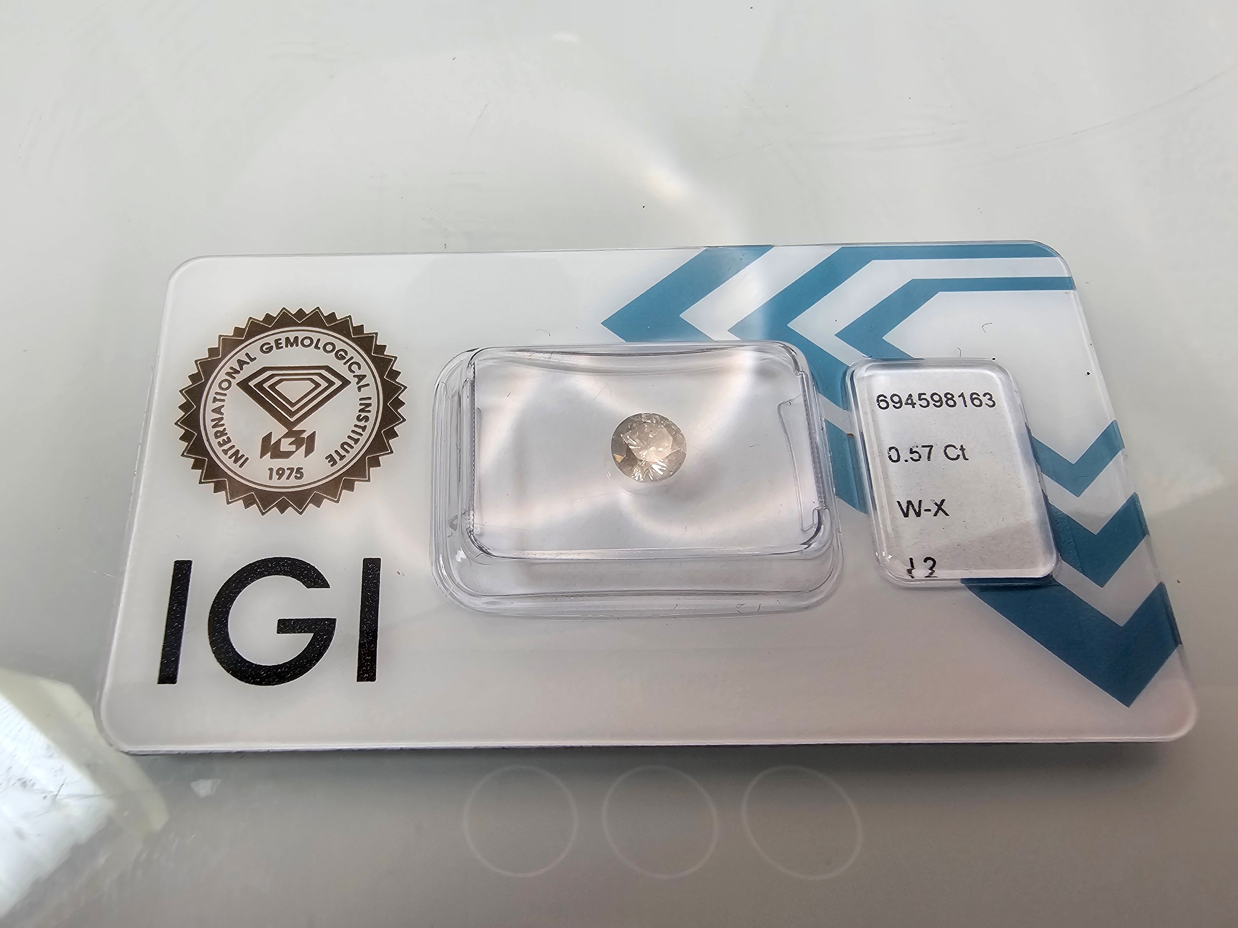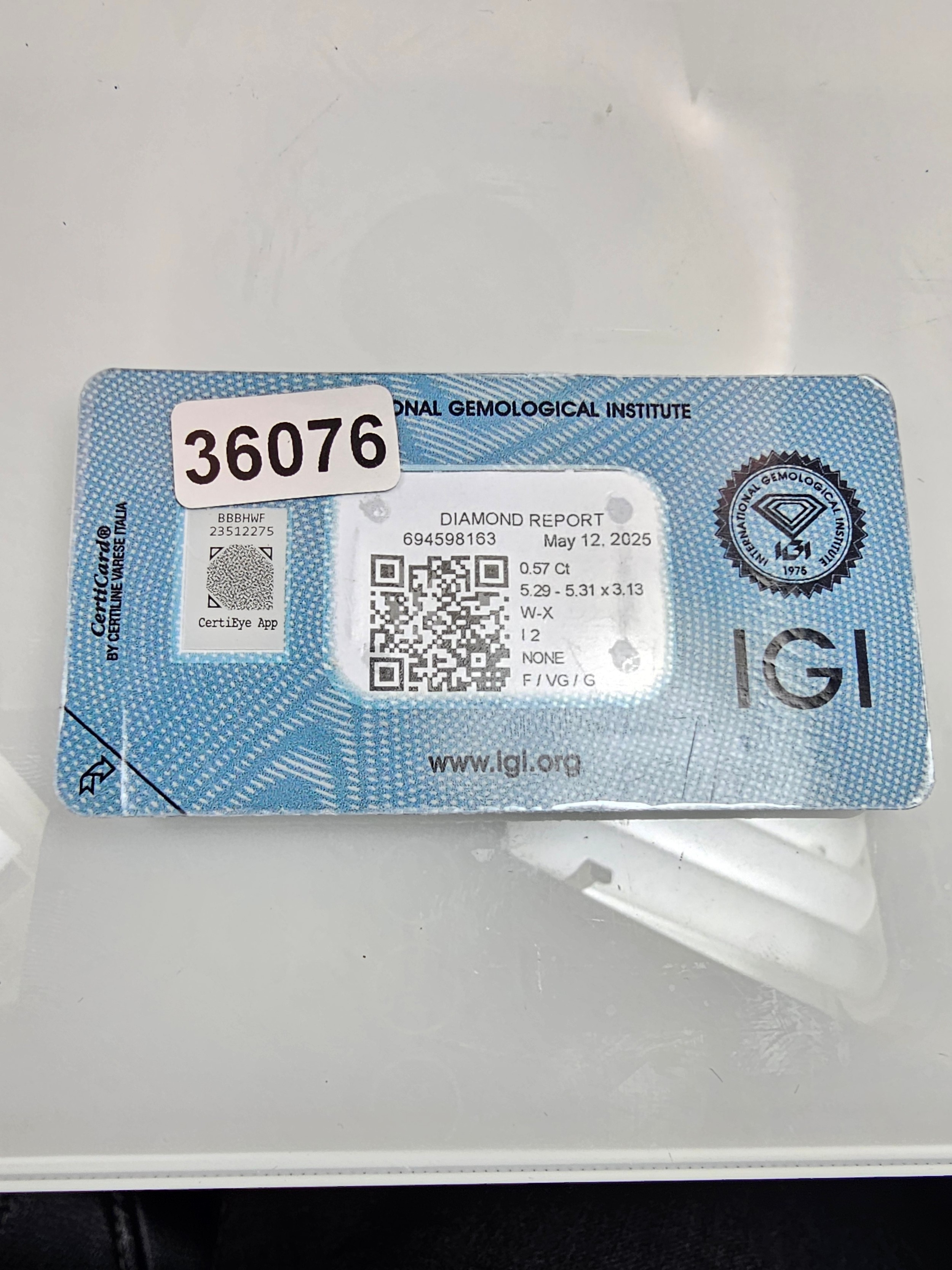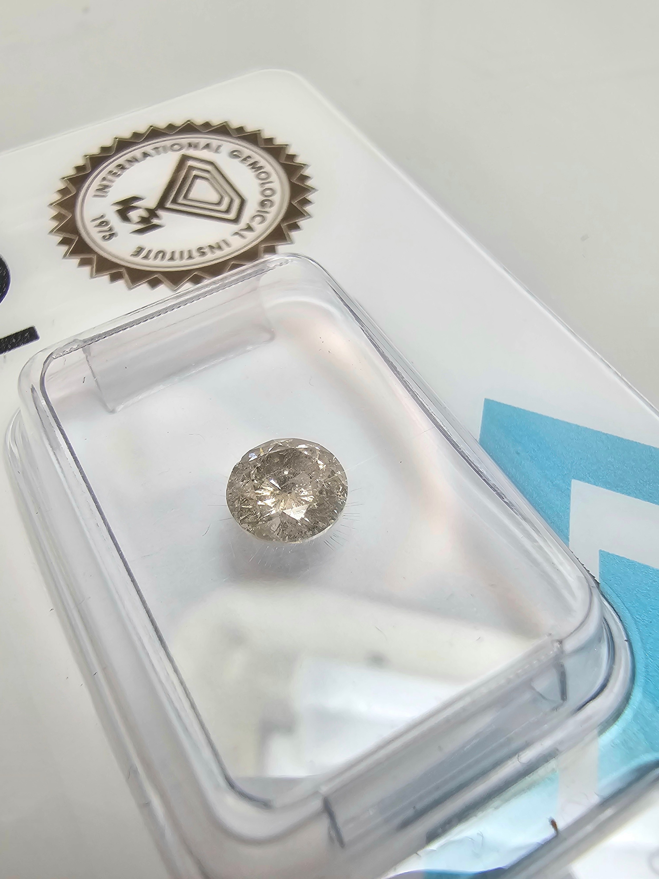 A 0.57ct natural round brilliant round diamond gemstone with full diamond report by IGI. The diamond is I2 category grade and is sealed in its blister pack by IGI. Ideal for setting in to jewellery. Please see photos for full report details.