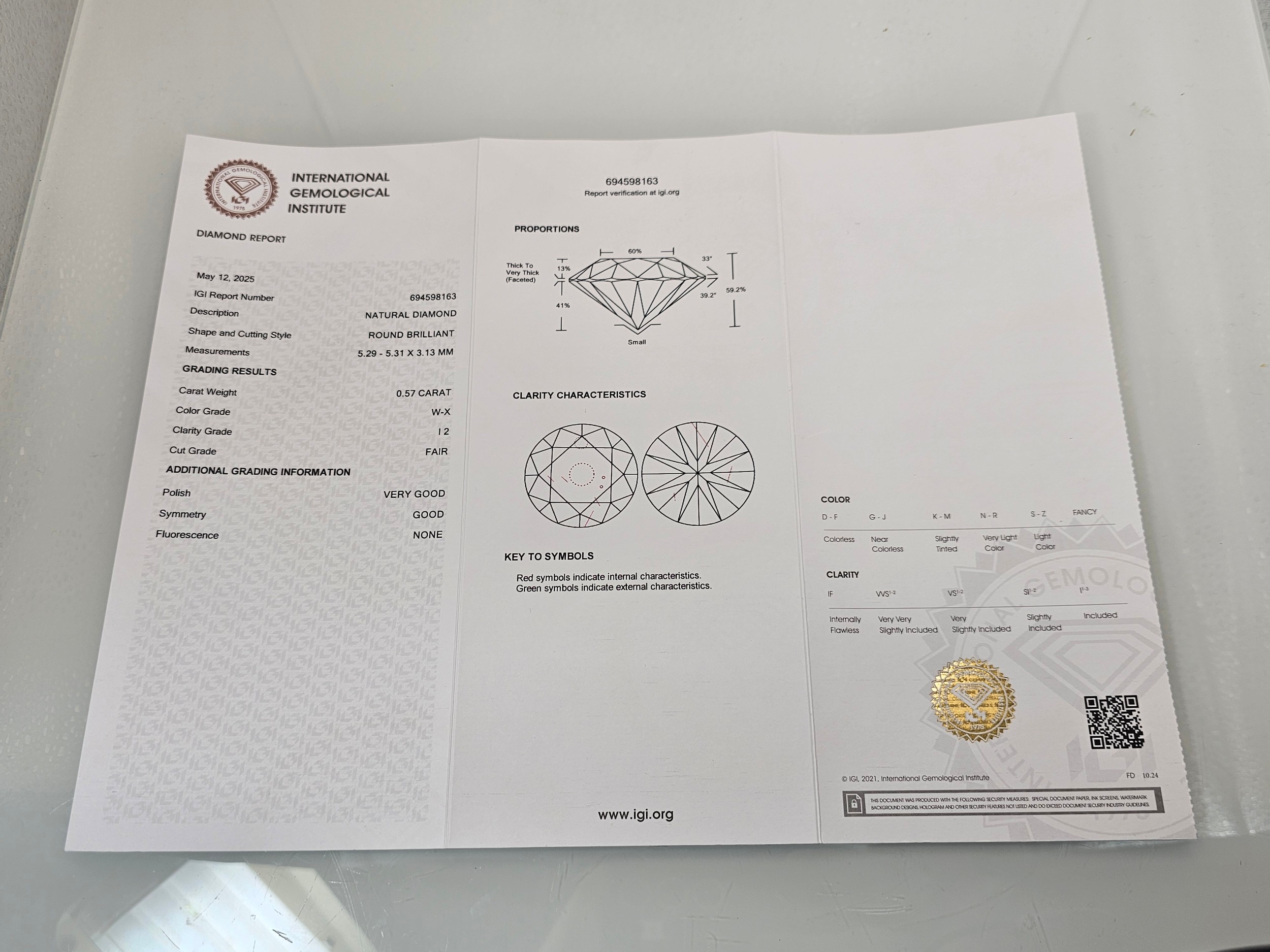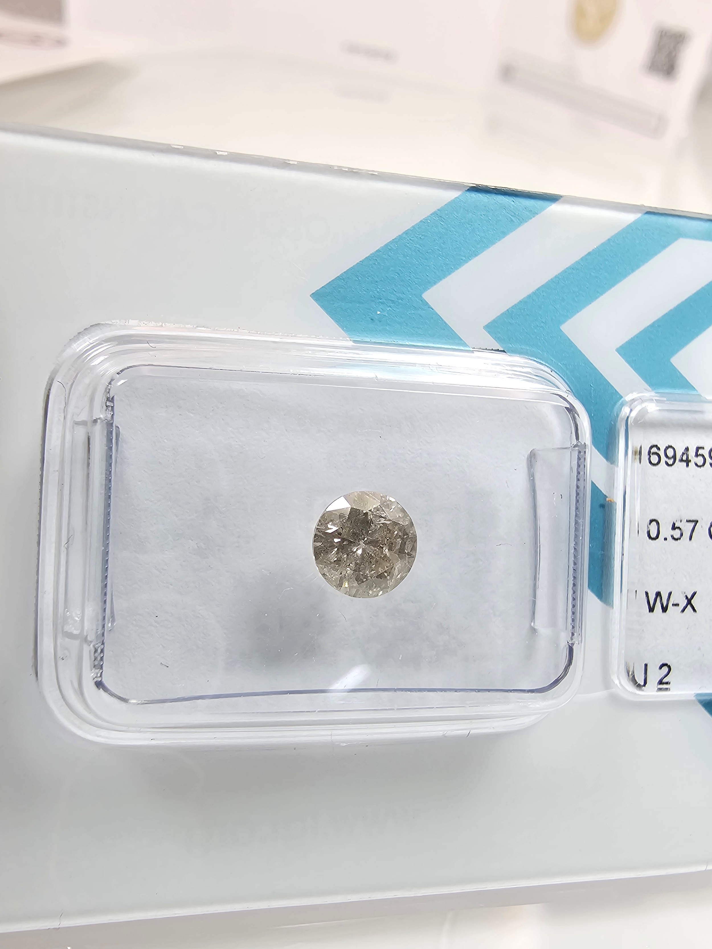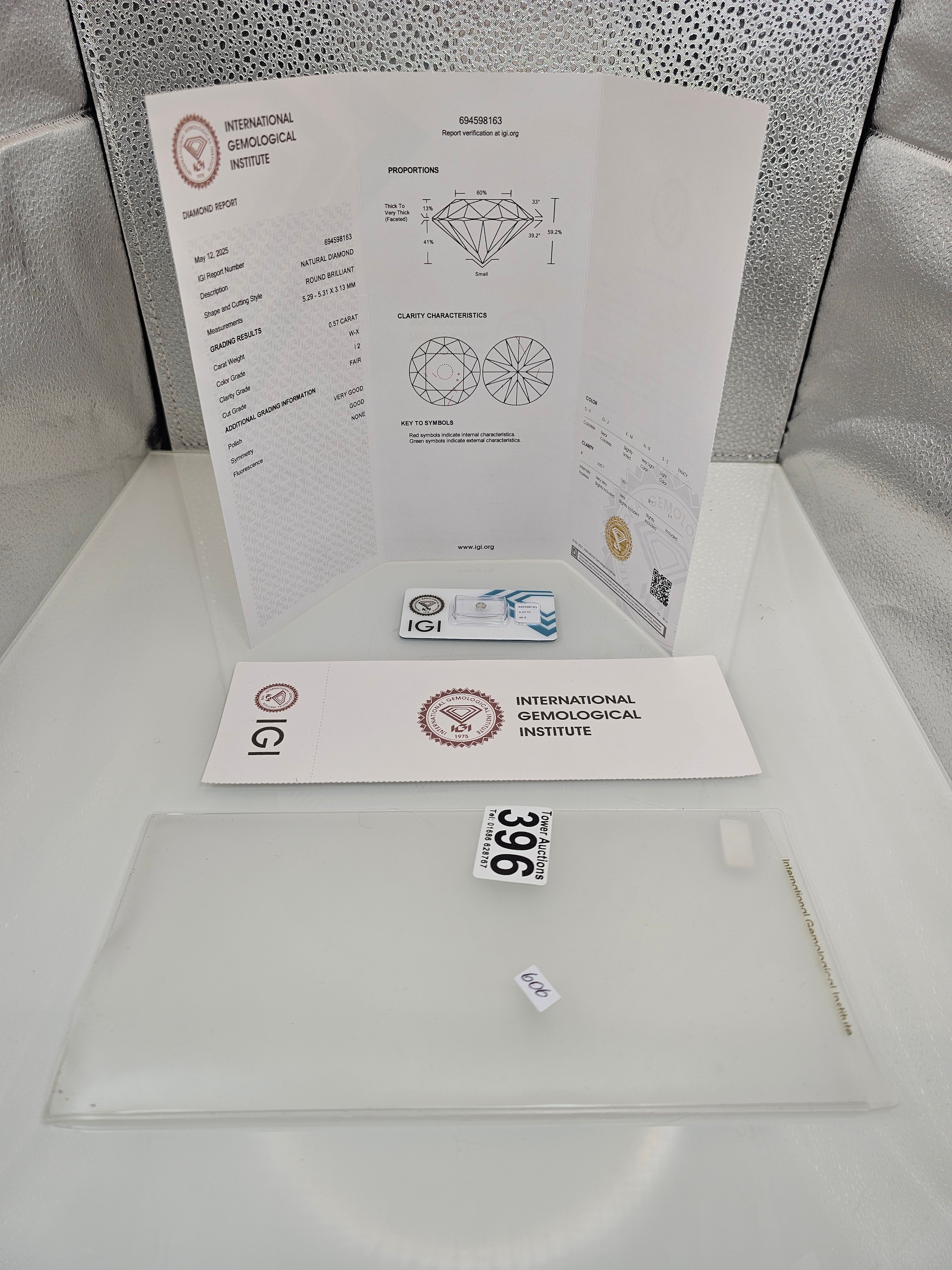 A 0.57ct natural round brilliant round diamond gemstone with full diamond report by IGI. The diamond is I2 category grade and is sealed in its blister pack by IGI. Ideal for setting in to jewellery. Please see photos for full report details.