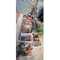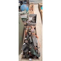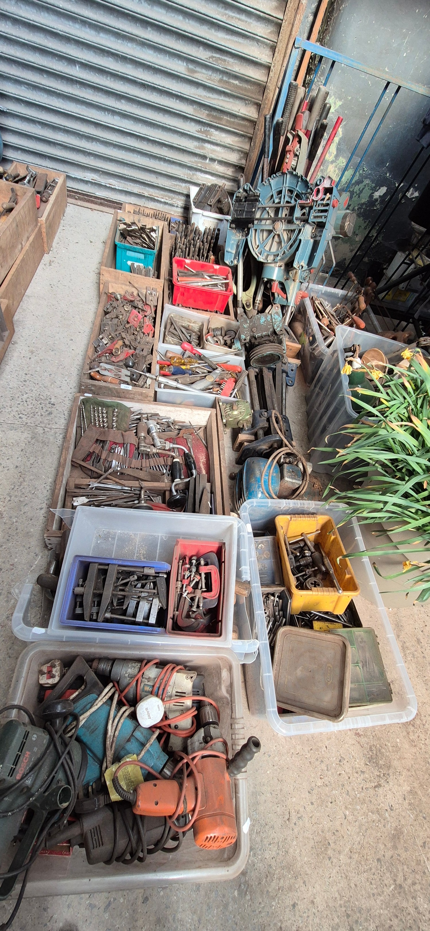 14 boxes of mixed tools and accessories including drill bits, reamers, cutters, sliding mitre saw, joiners bench vices, garden tools, drills, 3 electric motors (as found), power tools (as found)
