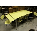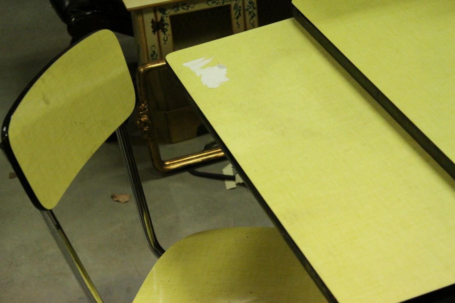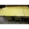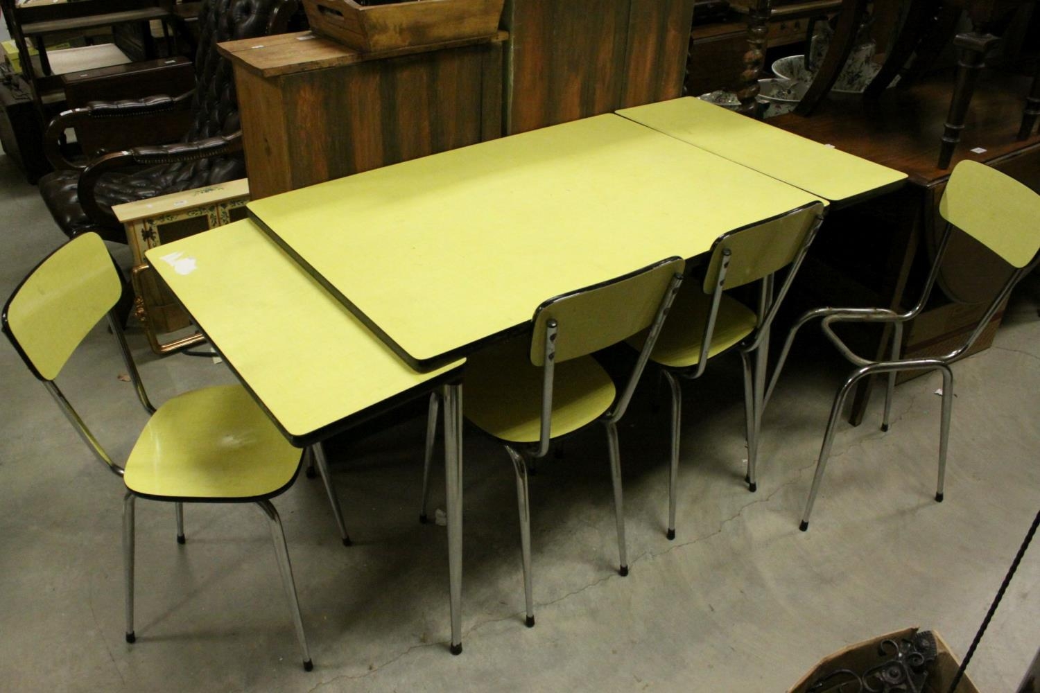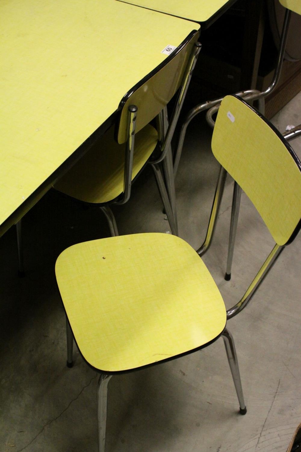 Mid 20th century Retro Draw-Leaf Kitchen Table with Yellow Formica Top and Tubular Chrome Supports (drawer fitted to one leaf), extended length 151cms together with a matching set of Four Kitchen Chairs