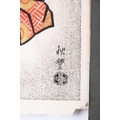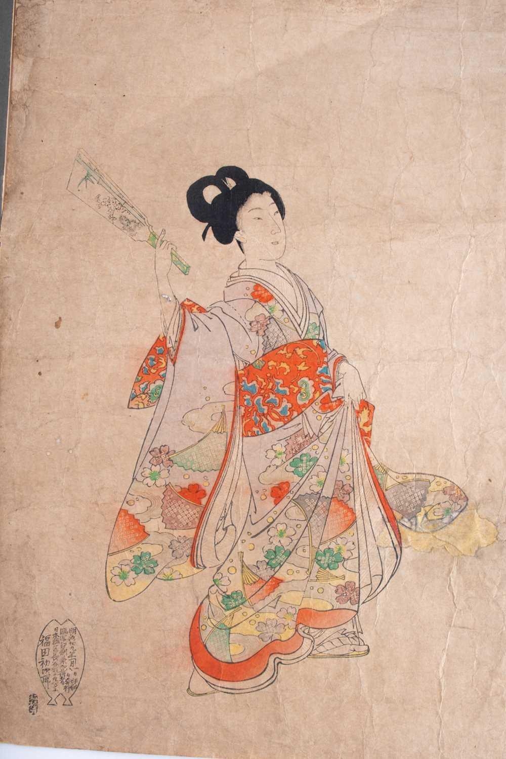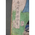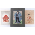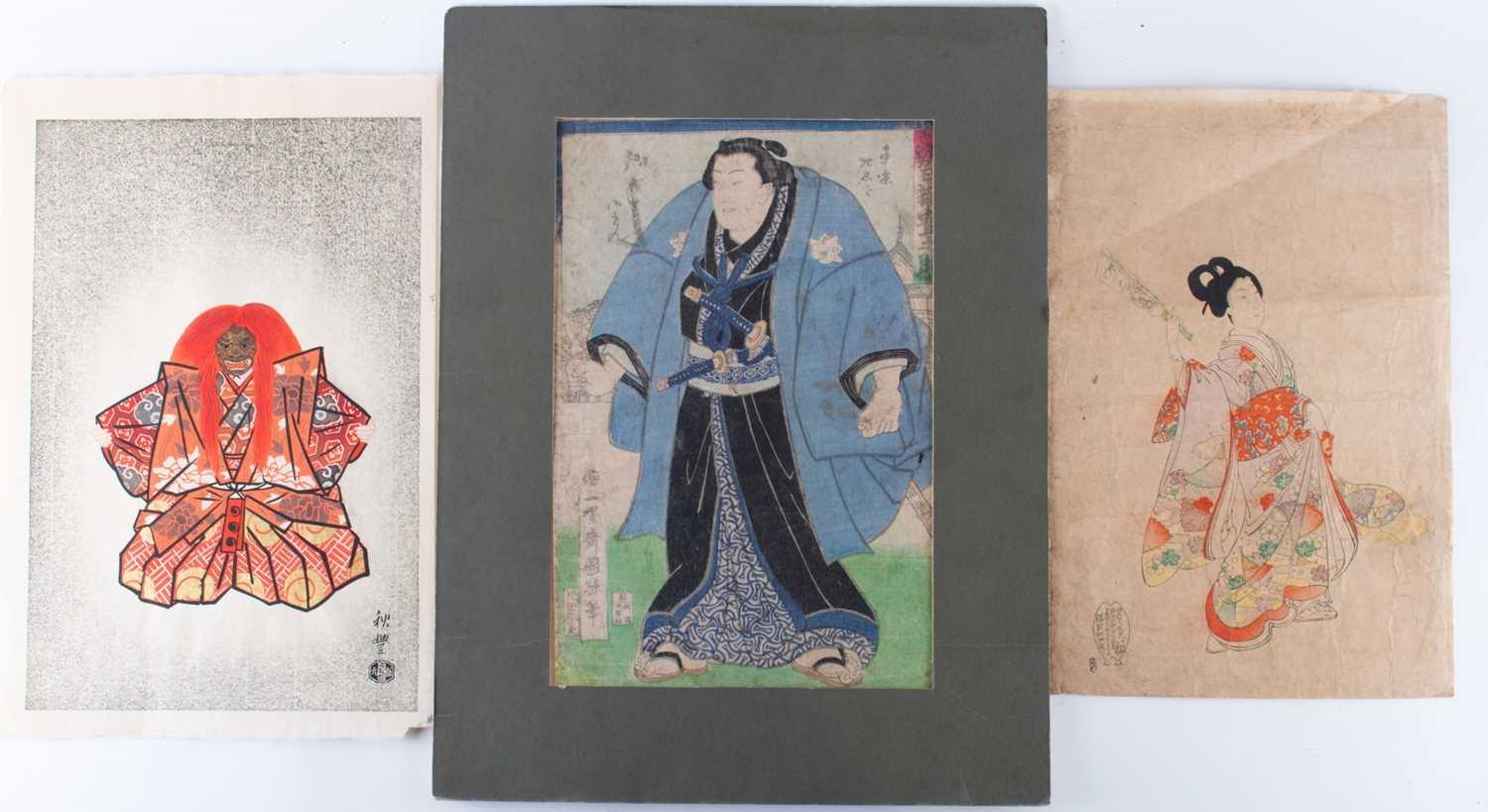 After Utagawa Kunisada (Toyokuni III, 1786-1865) Japanese depicting a Samurai, print in colours published in the 19th century, unframed, 34 cm x 23 cm, together with two more Japanese prints, 40 cm x 26 cm (largest).