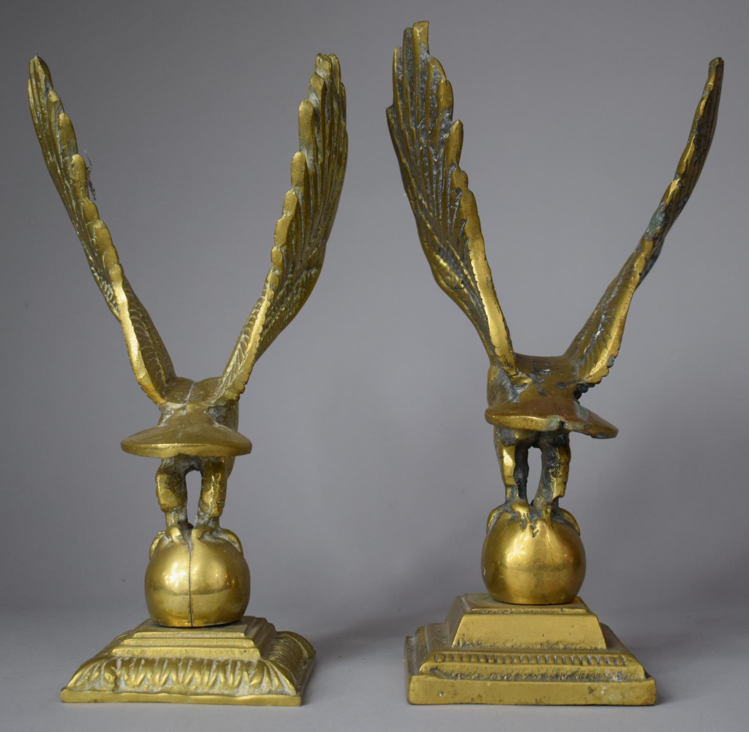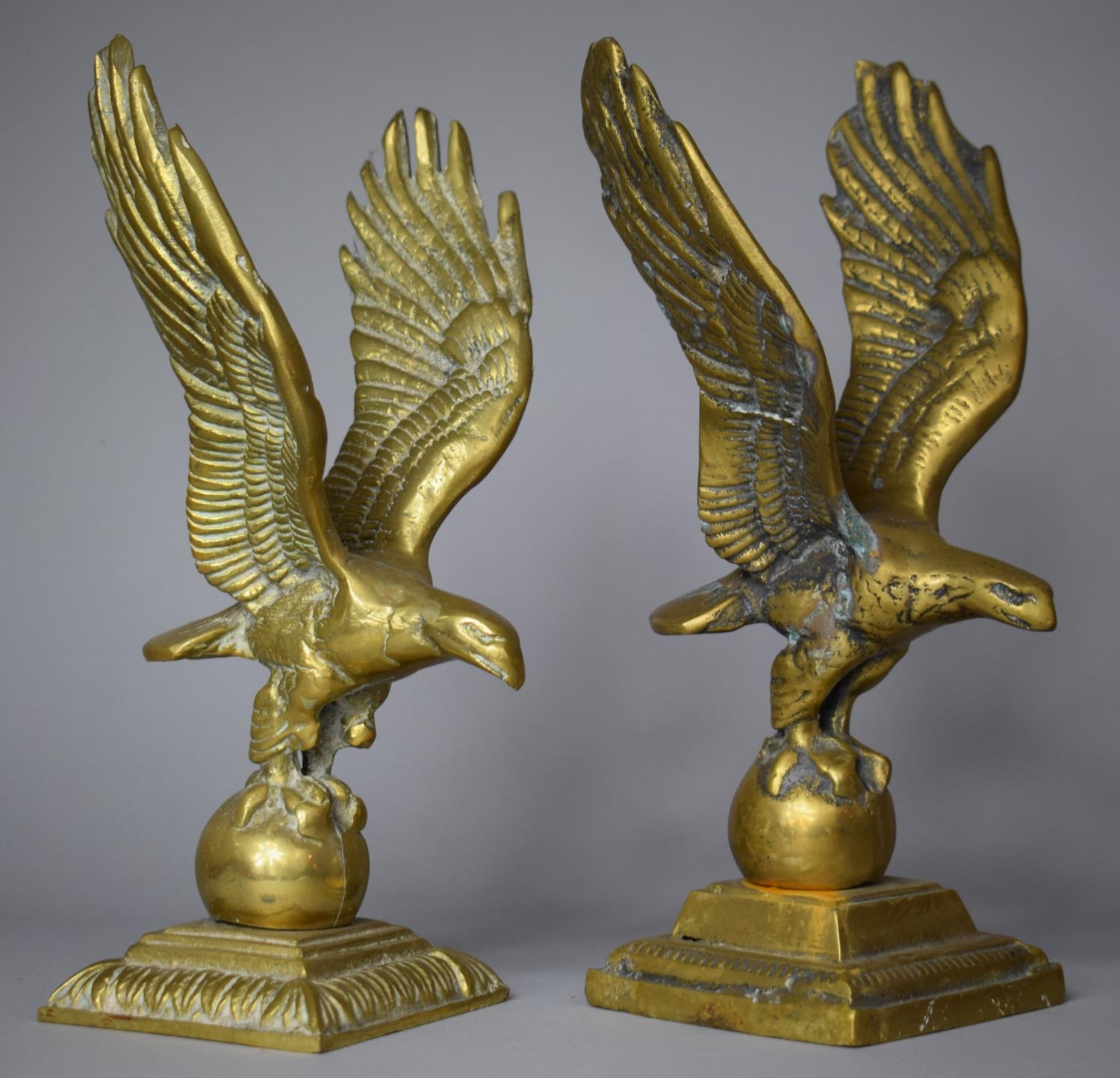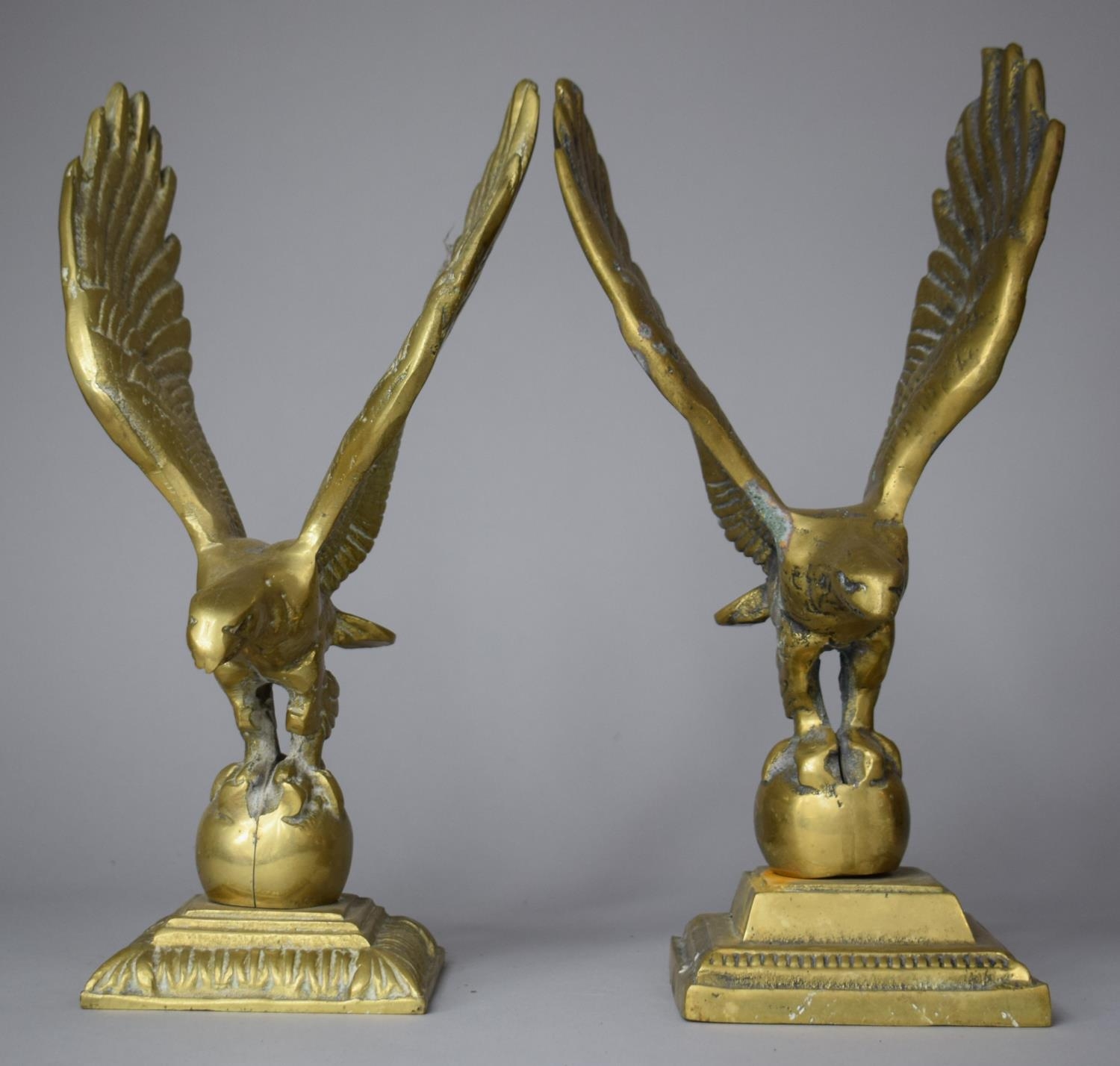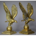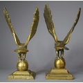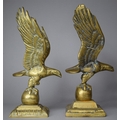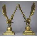 A Pair of Large Brass Studies of Eagles with Wings Outstretched and Standing on Globes, 30cm high