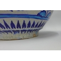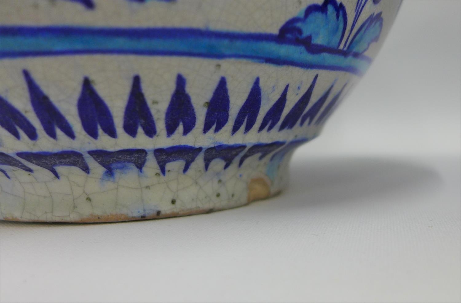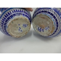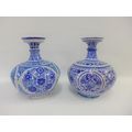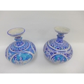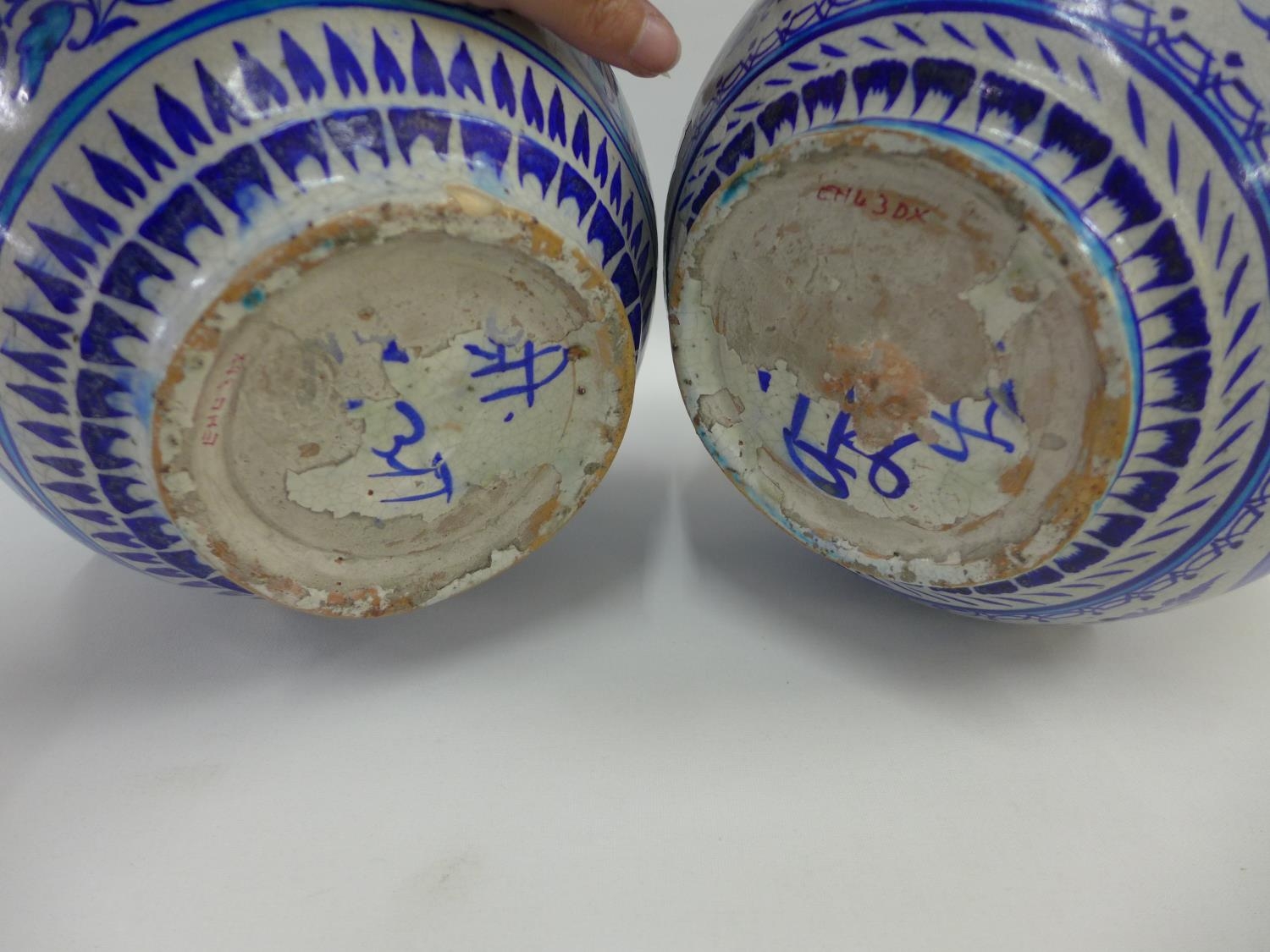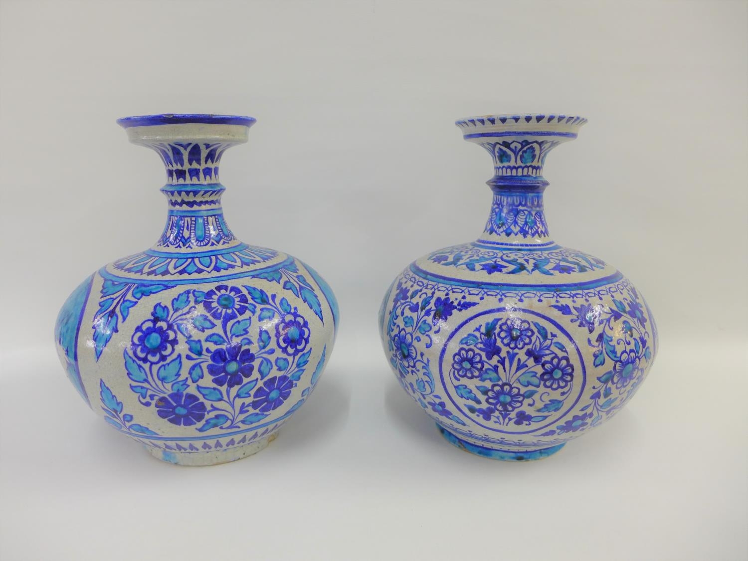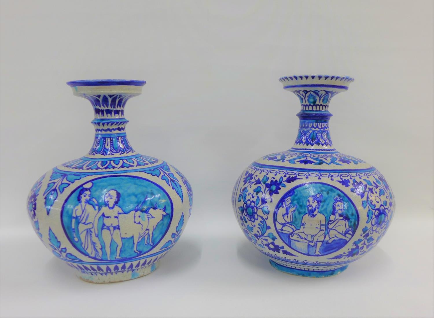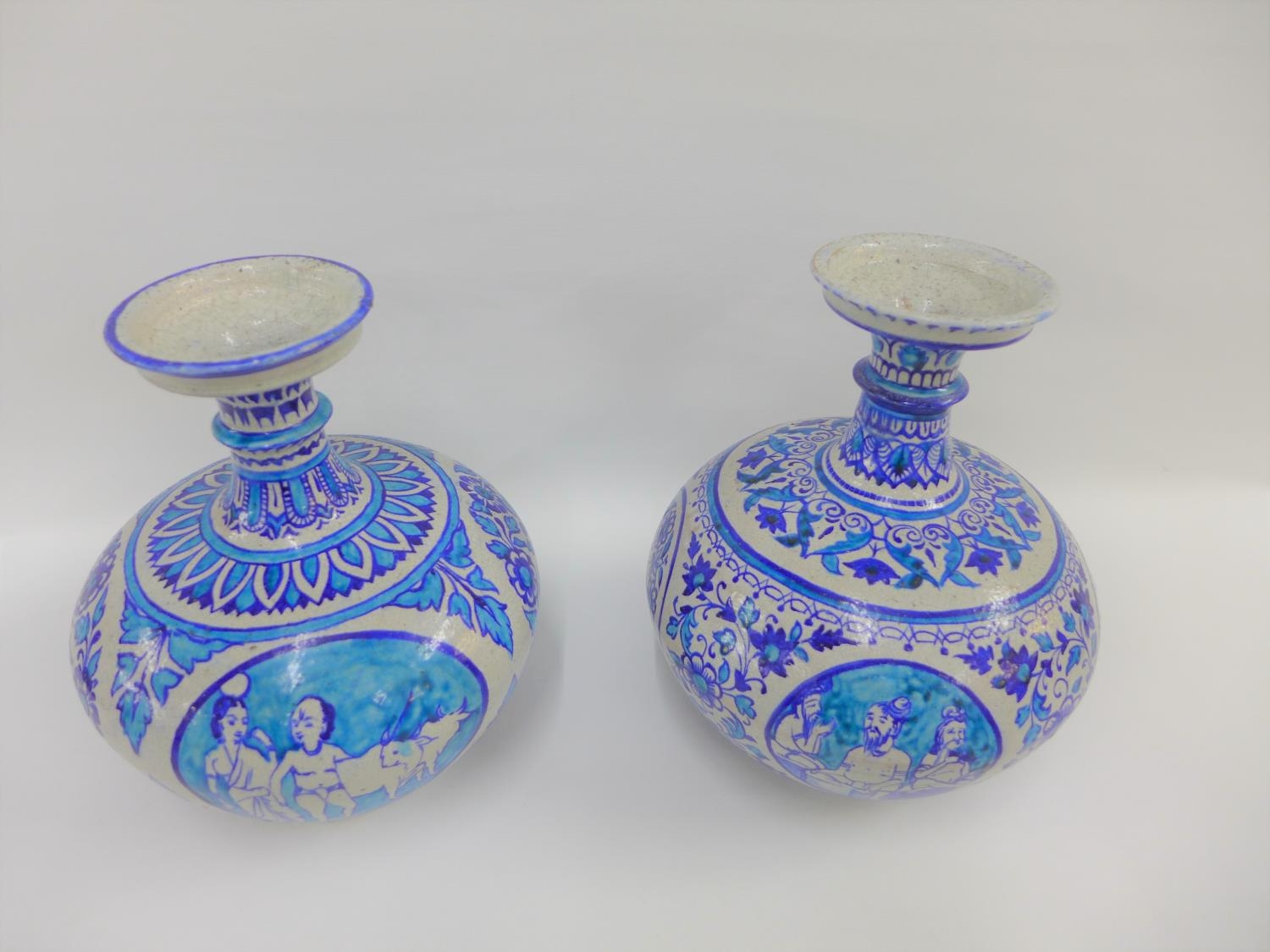 A pair of Middle Eastern style bottle neck vases, painted with flowers and figures to a turquoise ground, 27cm high (2)