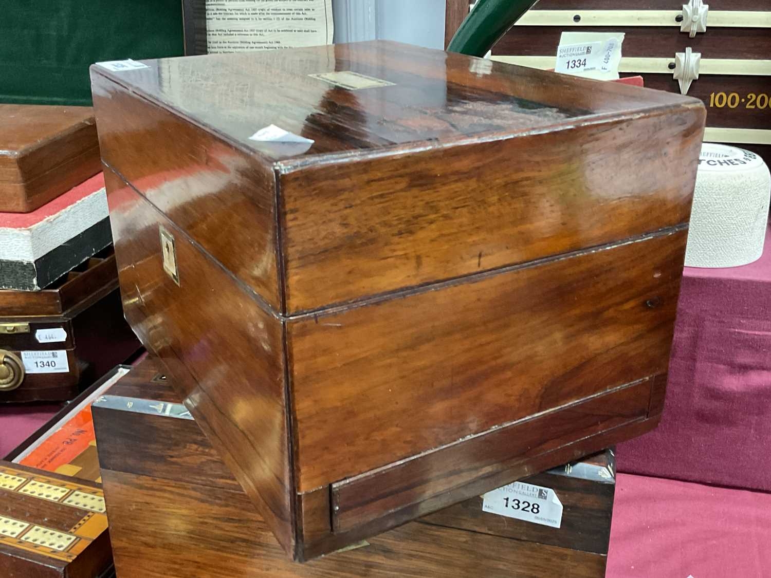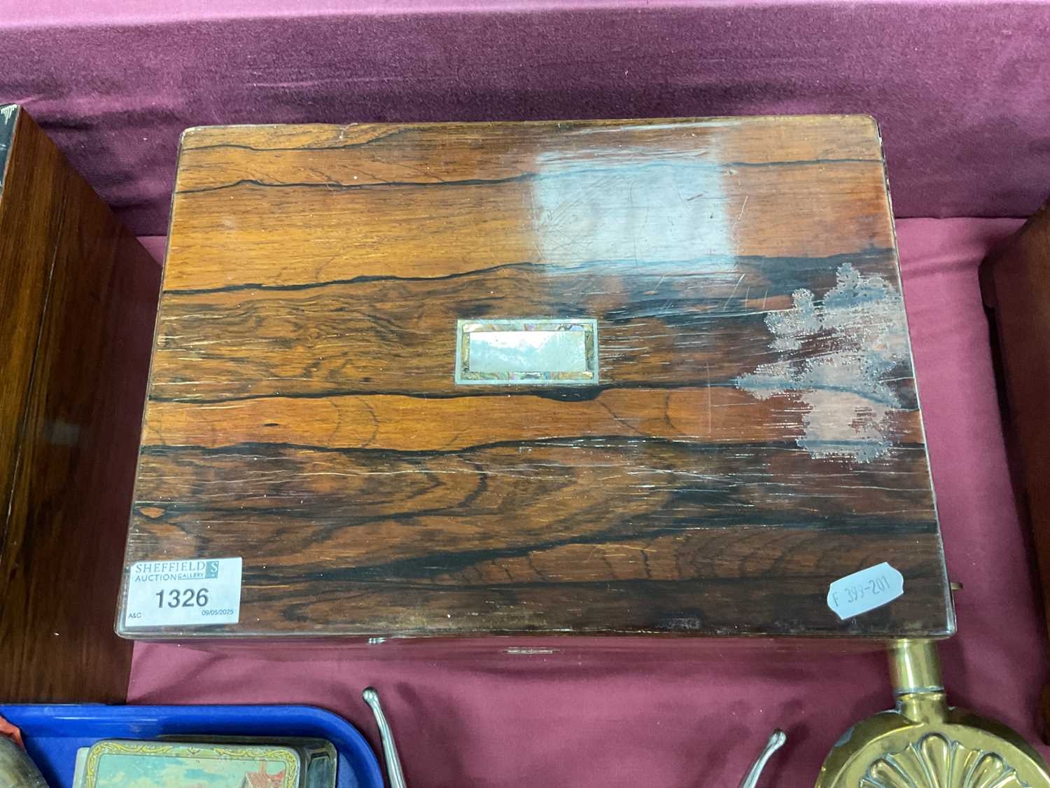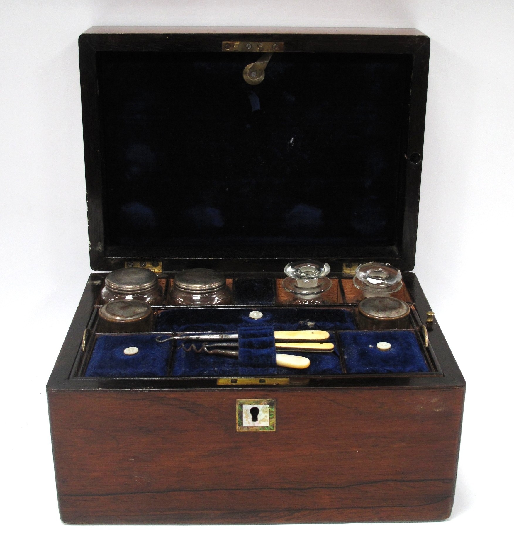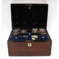 XIX Century Rosewood Vanity Box, top with a mother of pearl insert, blue fitted interior with glass bottles, single drawer to base.