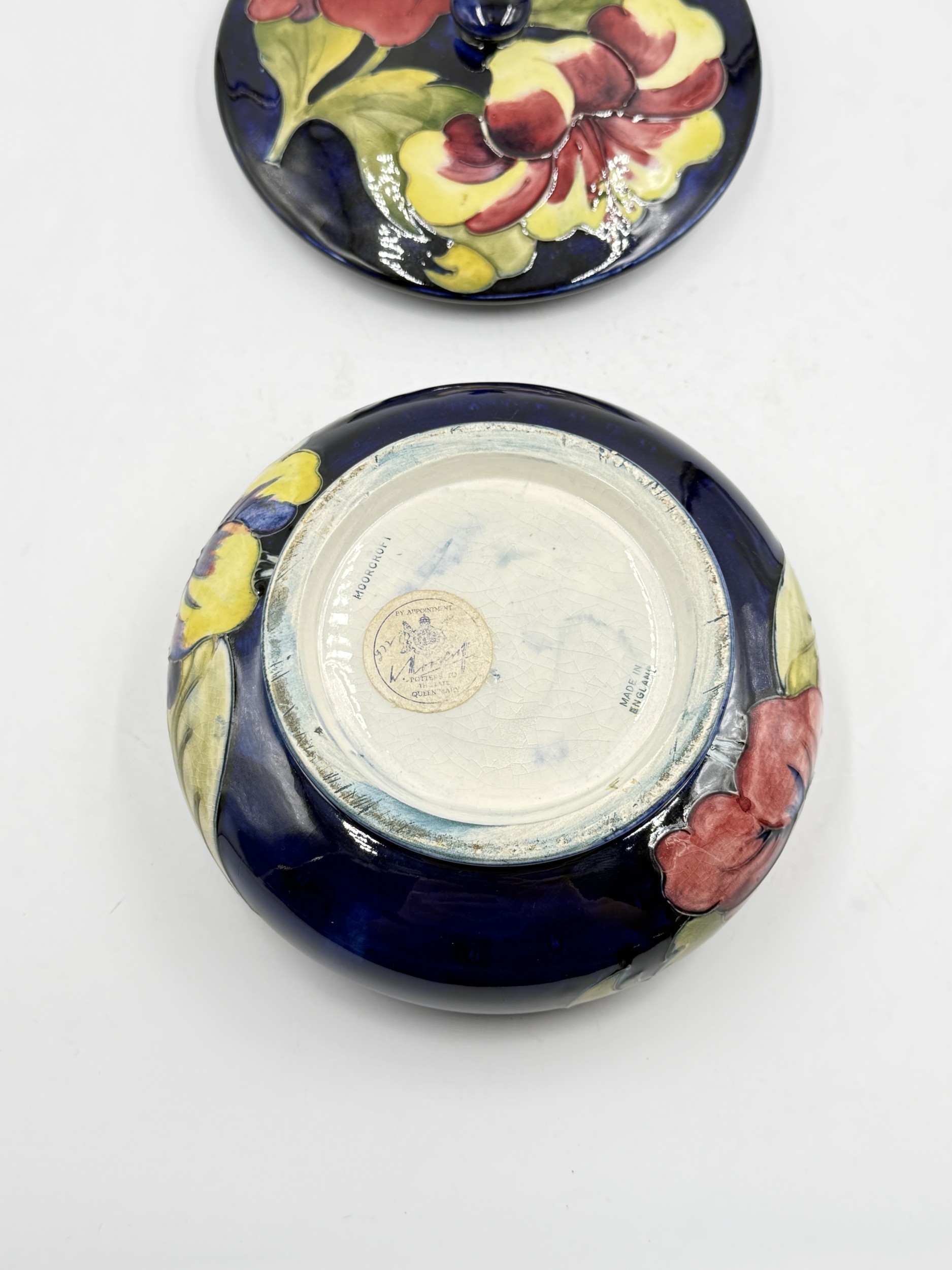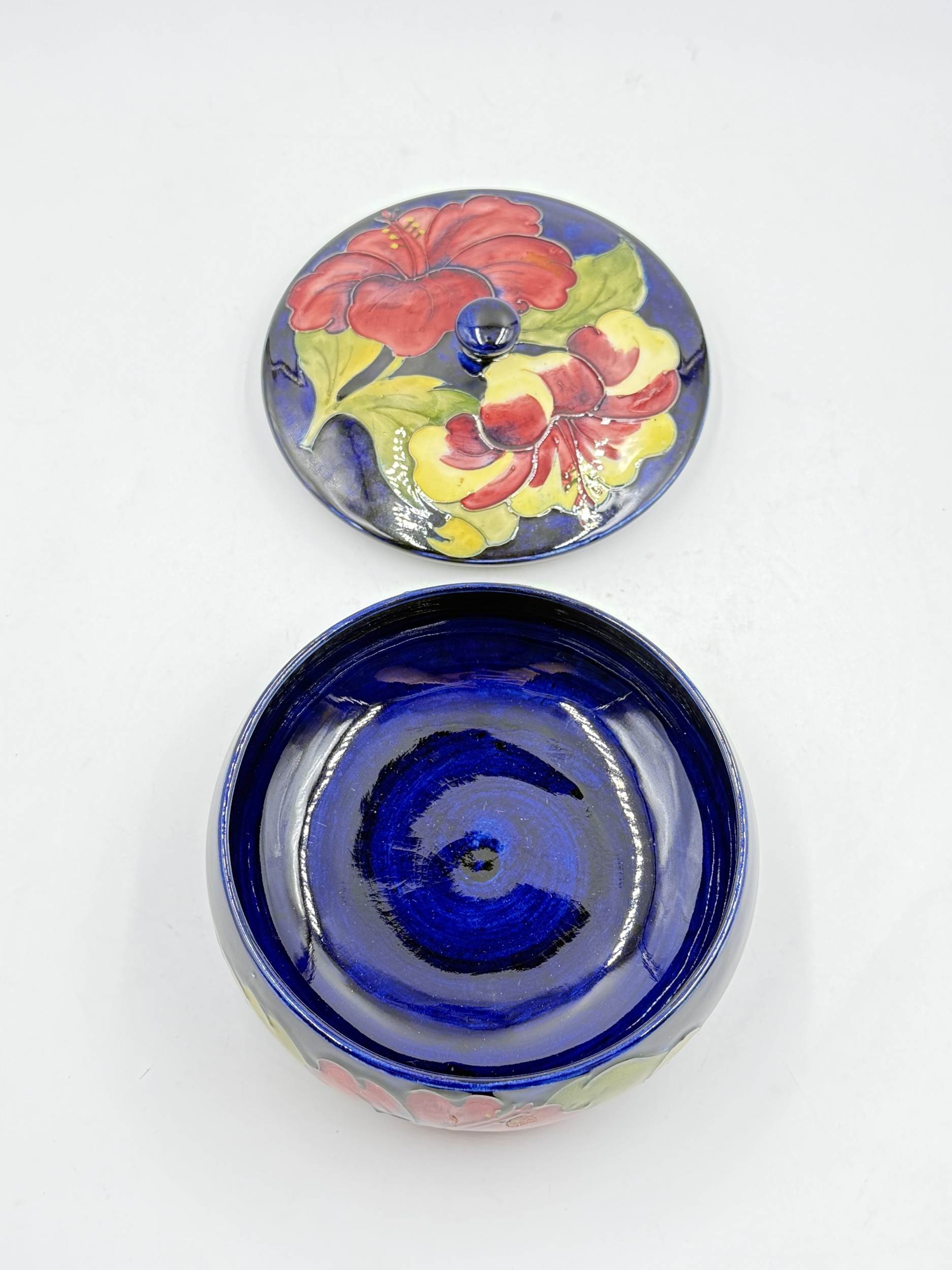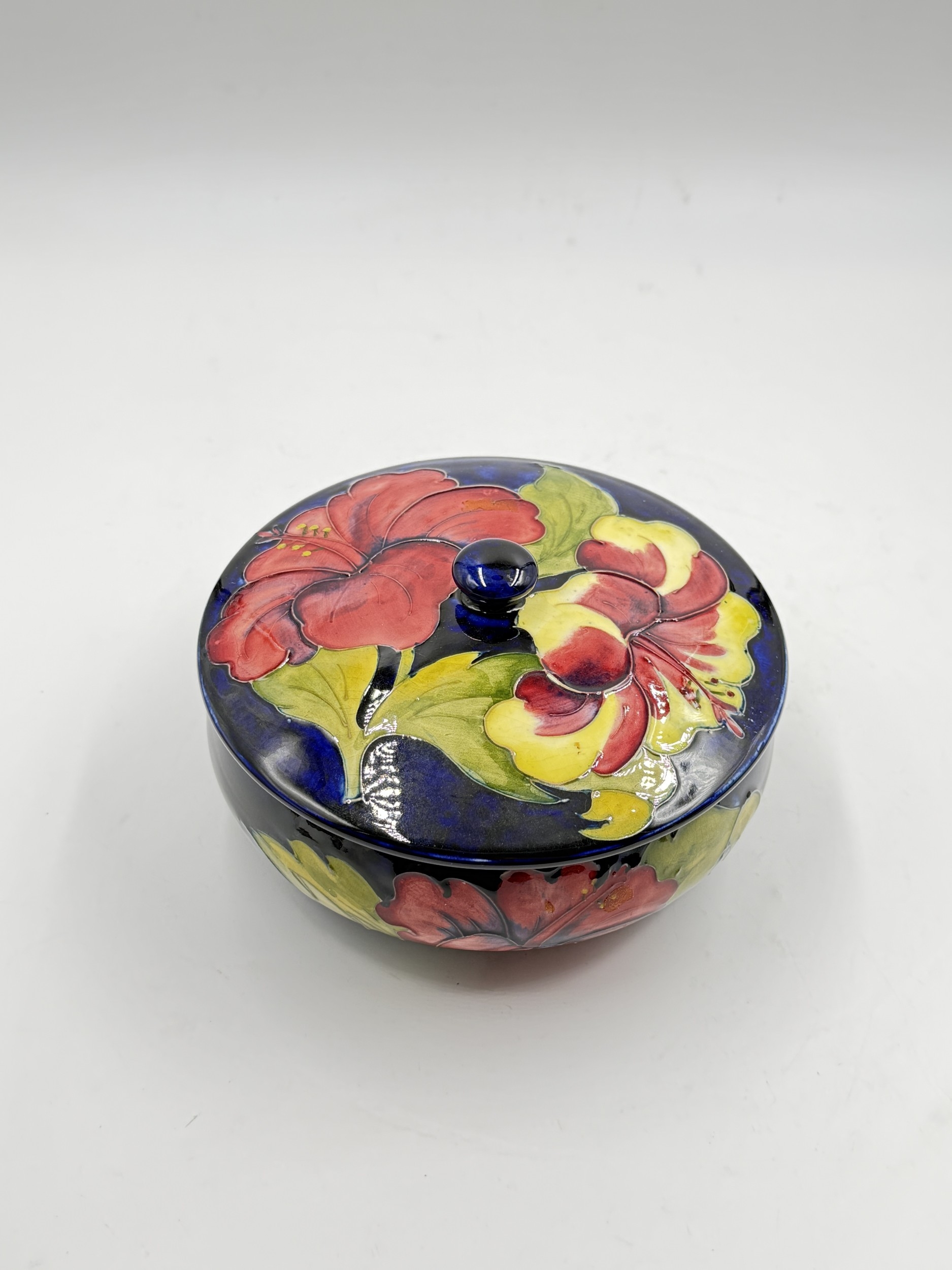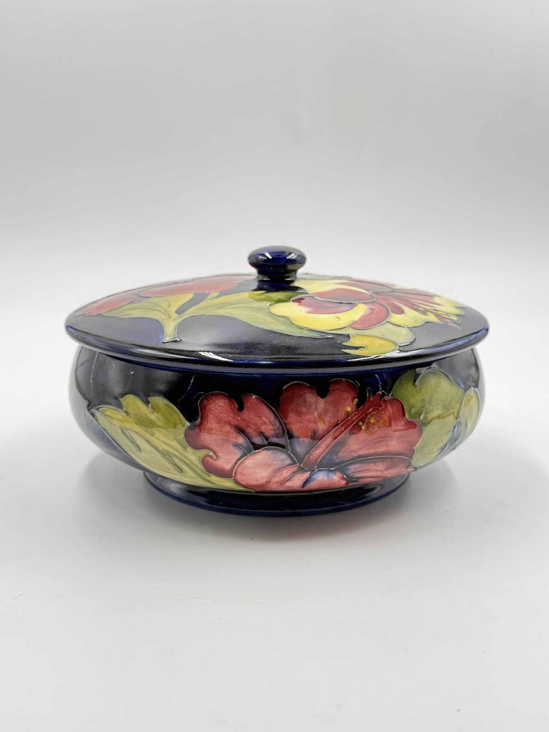 A Moorcroft Hibiscus pattern circular lidded bowl - approx. 9cm high x 17cm diameter