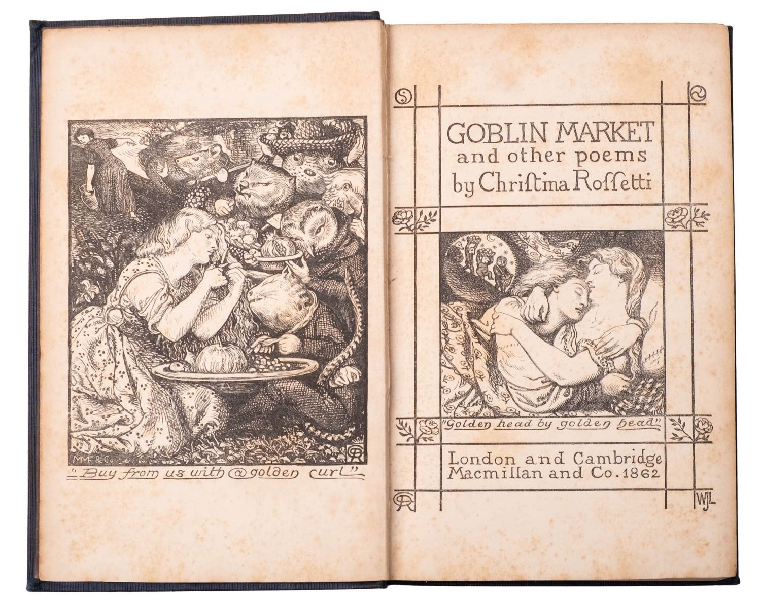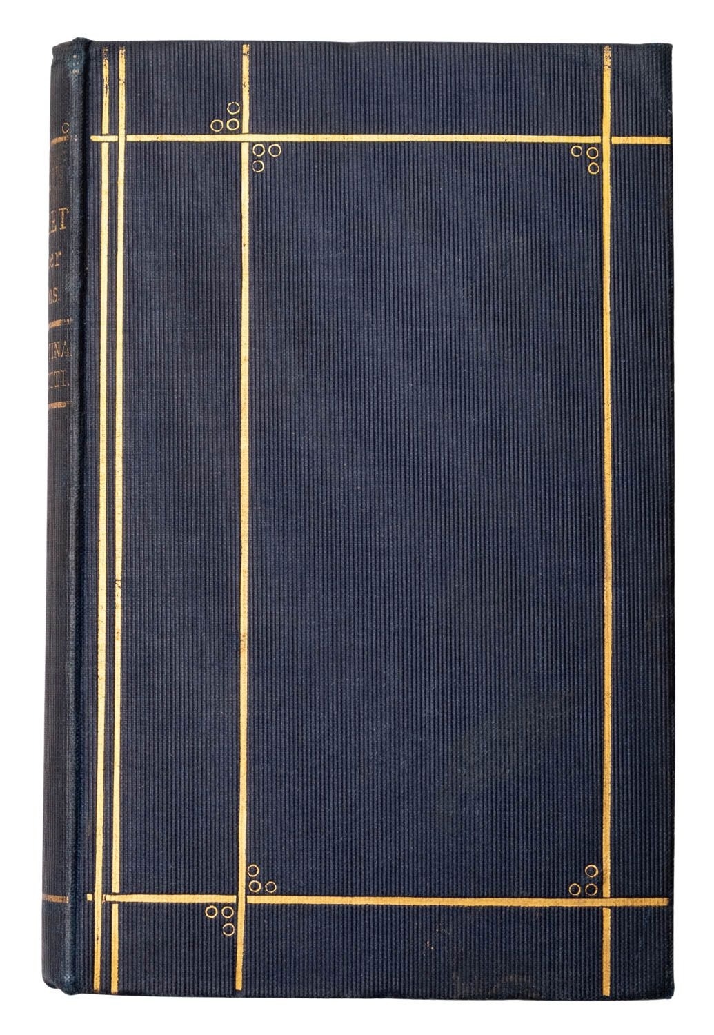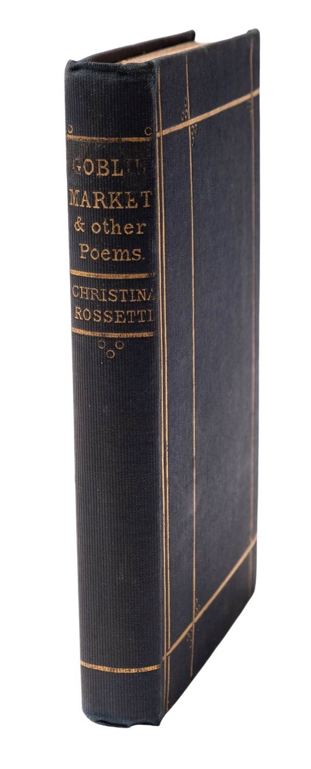 ROSSETTI, Christina. Goblin Market and other poems, 1st edition, Cambridge and London: Macmillan and Co., 1862, wood-engr. frontis. and additional vignette title after Dante Gabriel Rossetti, publisher's catalogue at rear, some foxing to plates and title, contemp. ink ownership inscription verso to ffep, orig. decorative navy cloth gilt by Burn & Co. (binder's ticket to rep), 12mo.