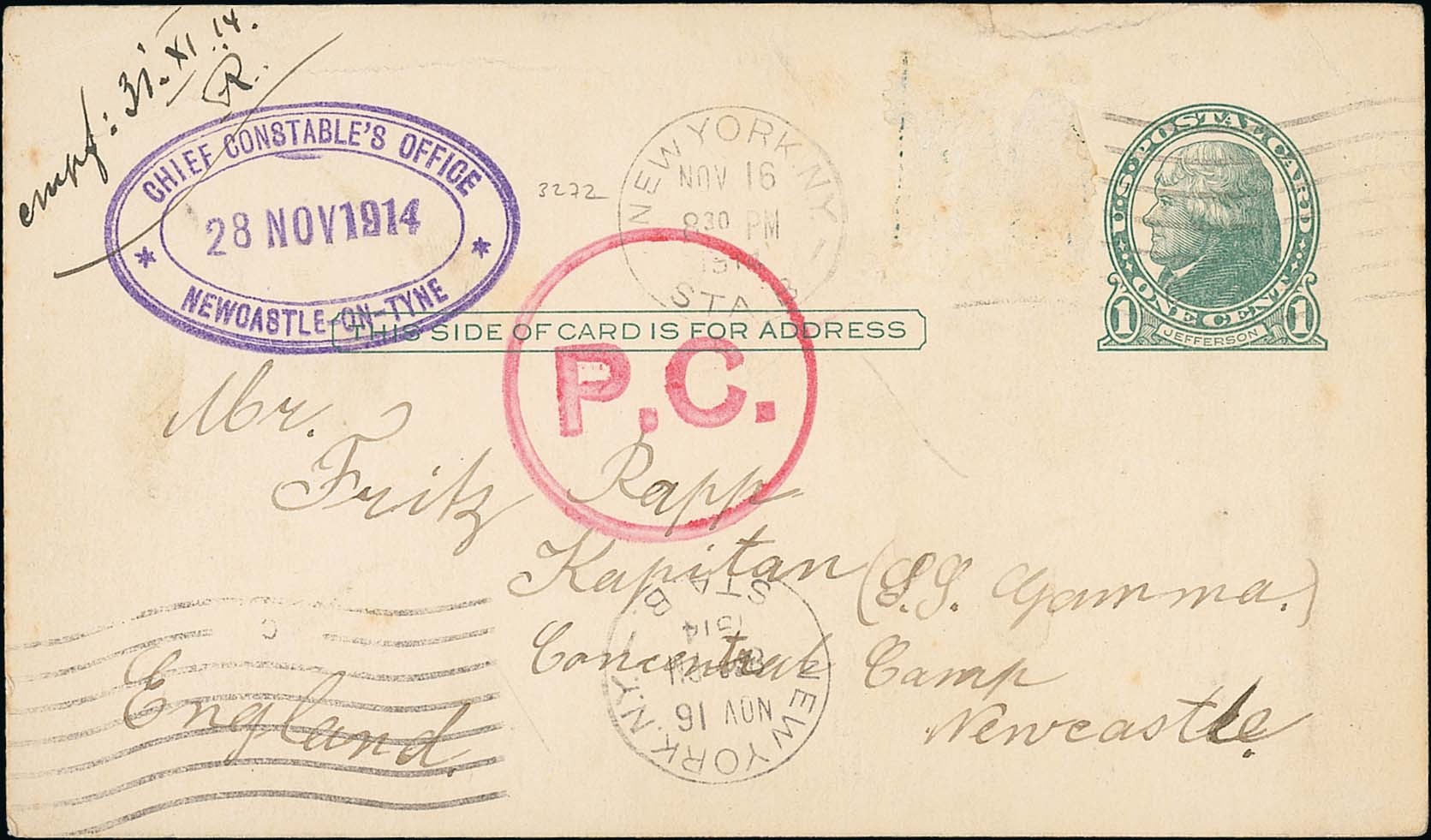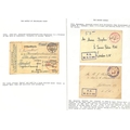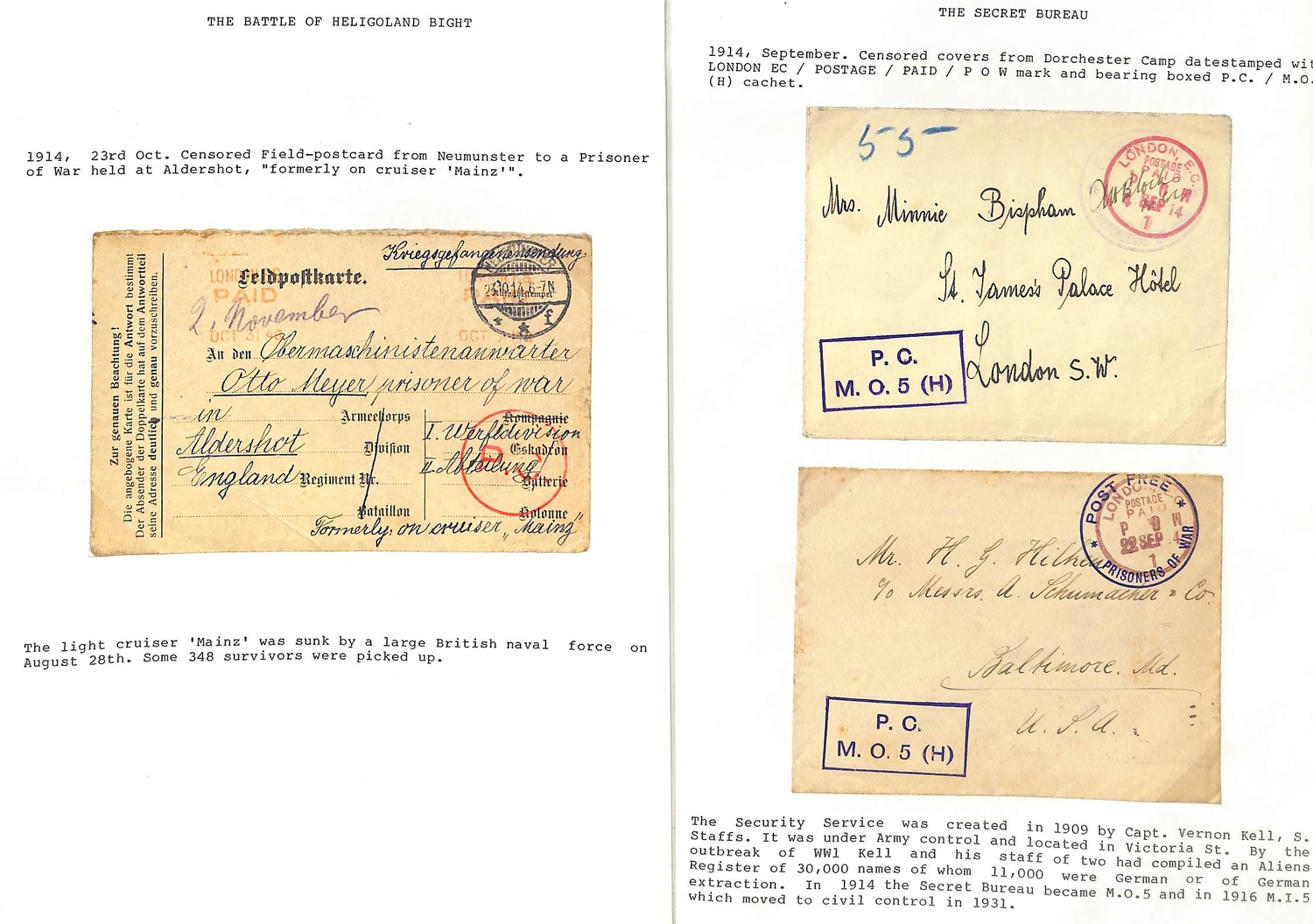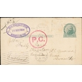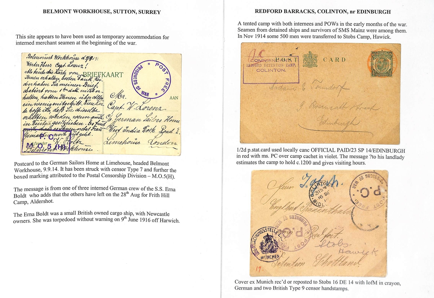 1914 (Sep. - Dec.) Covers and cards from (4) or to (3) P.O.Ws or internees comprising two covers from Dorchester with the scarce red "LONDON E.C / POSTAGE / PAID / POW" c.d.s and violet boxed "P.C. / M.O.5 (H)"; postcard from Frith Hill also with the "P.C / M.O.5 (H)" cachet; postcard from the U.S.A to the Captain of S.S "Gamma" at Concentration Camp, Newcastle, with violet oval "CHIEF CONSTABLE S OFFICE / 28 NOV 1914 / NEWCASTLE-ON-TYNE"; postcard to a crew member of the "Mainz" at Aldershot; ½d postcard cancelled by red "OFFICIAL PAID / EDINBURGH" c.d.s with violet boxed "COMMANDANT / REDFORD DETENTION CAMP / COLINTON"; and a cover to Colinton redirected to Stobs and the Isle of Man. (7). Photo on Page 46.