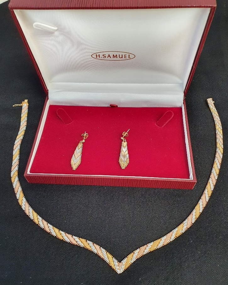 925 Italian Silver and Gilt Necklace measuring approximately 46cm and two matching Earrings, total weight 39g. Original H Samuel box