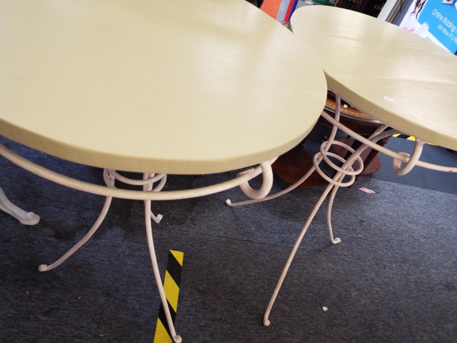 A pair of vintage patio garden tables with iron bases and painted tops