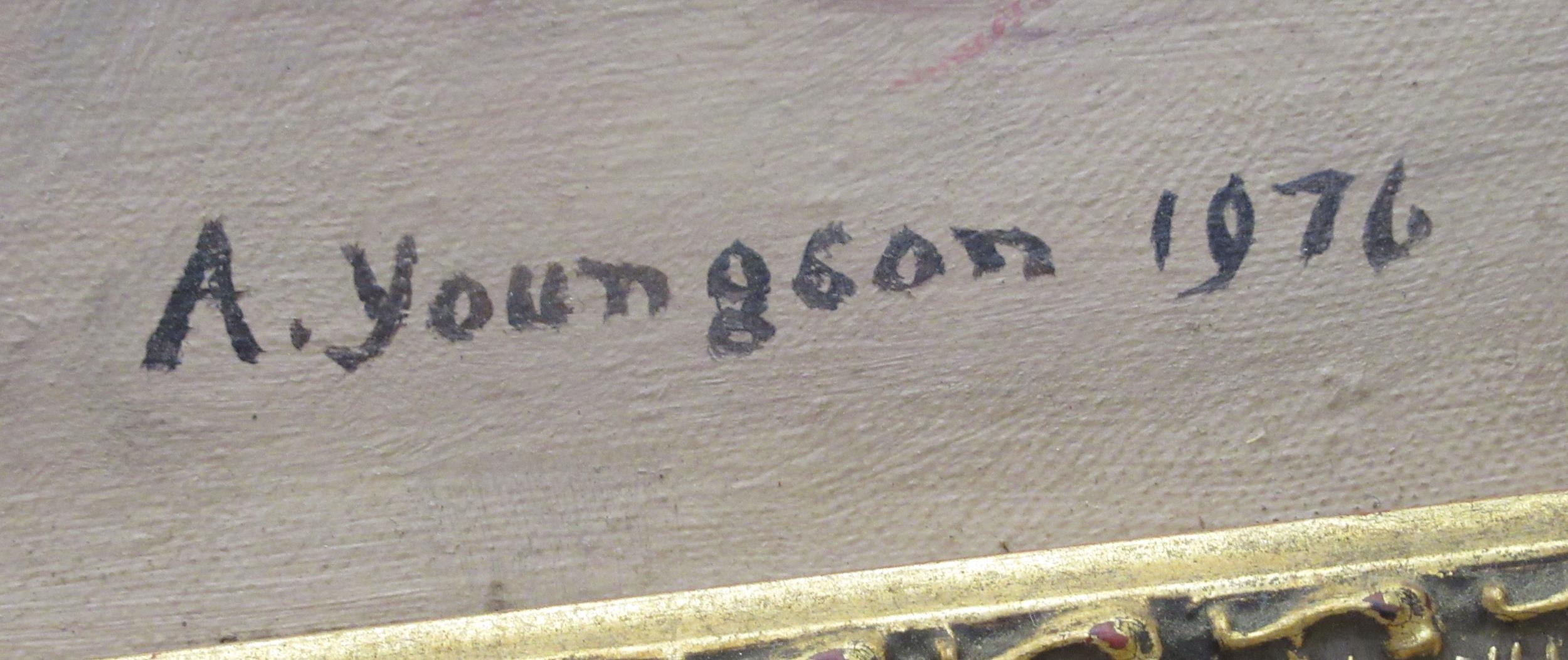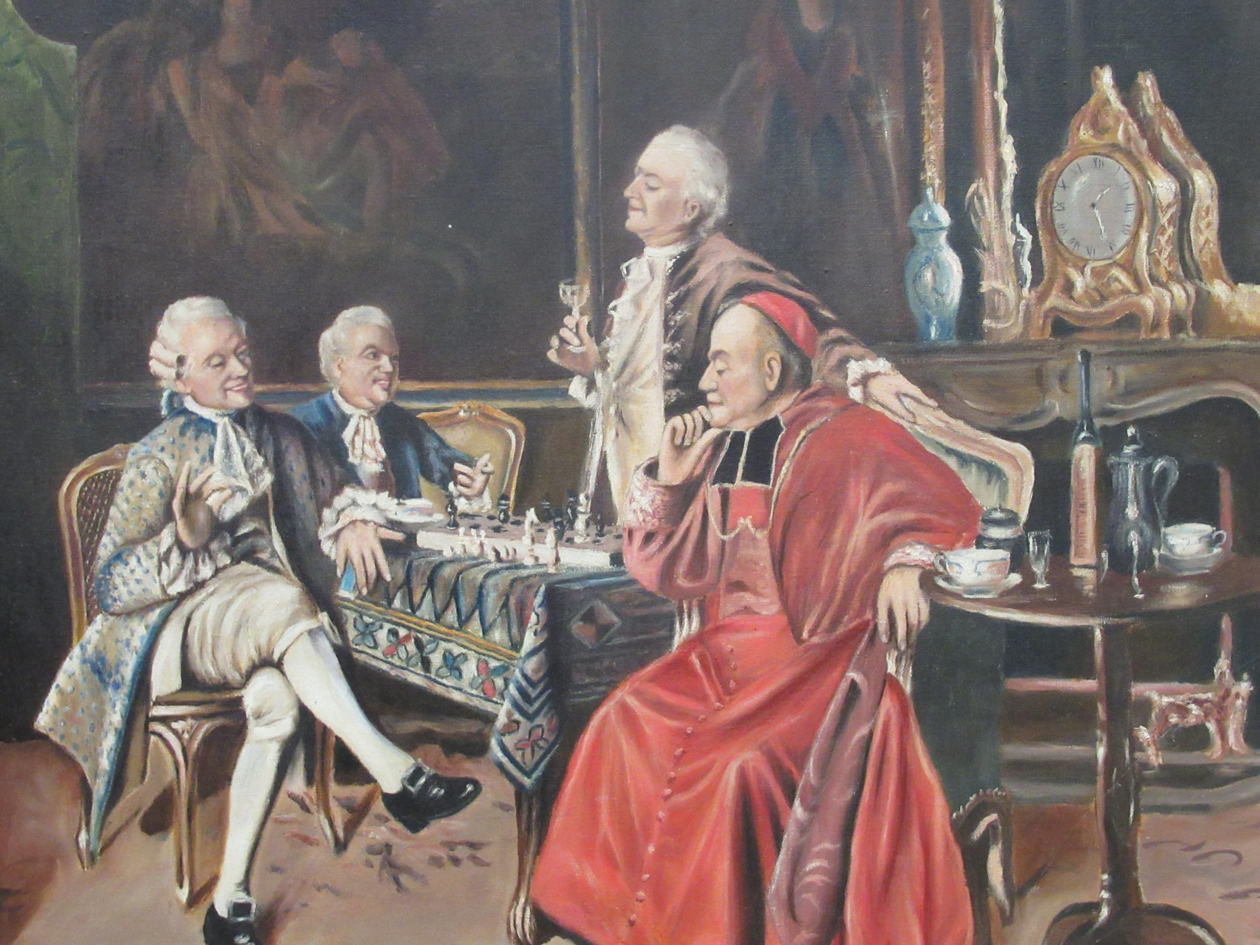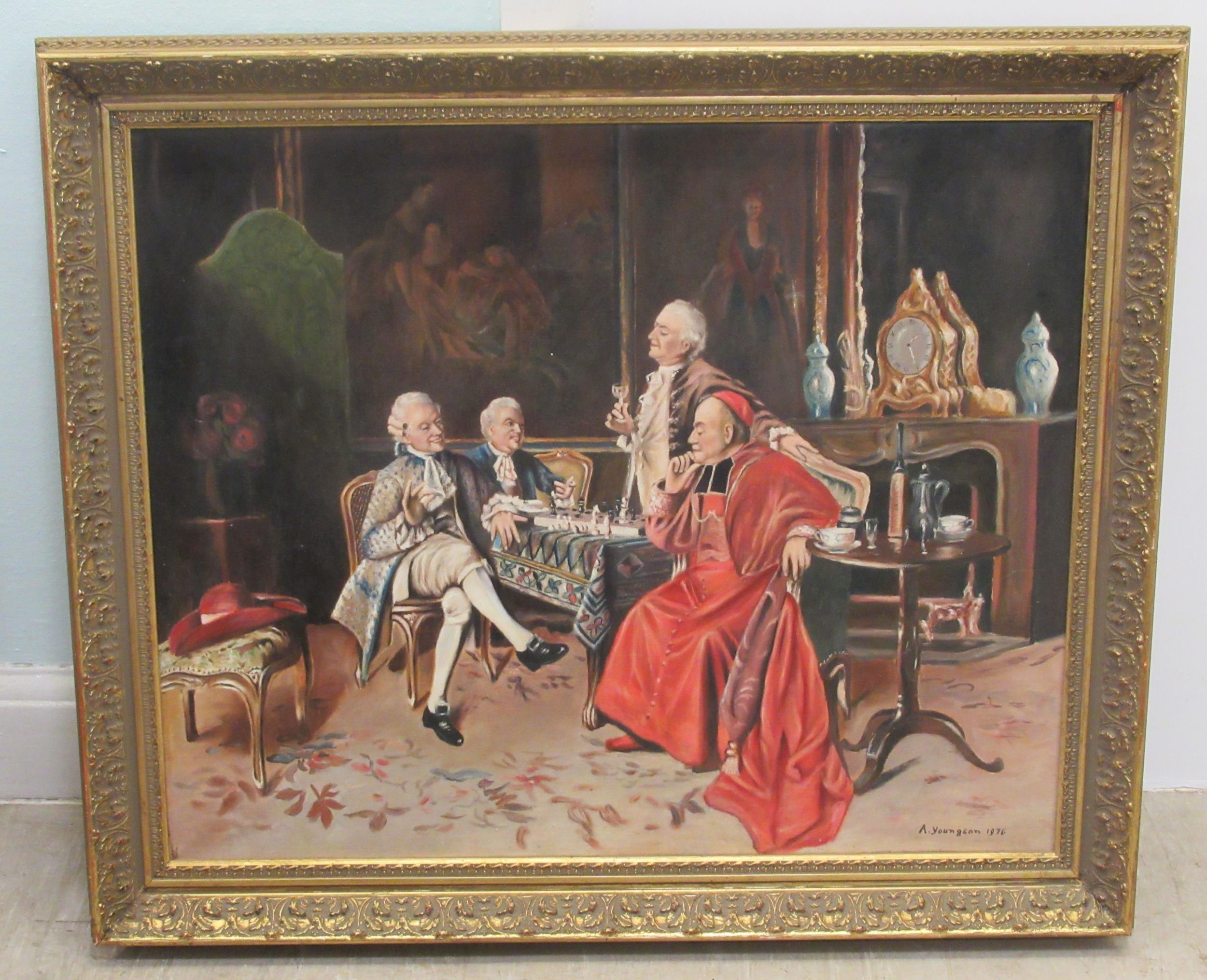 A Youngson - a period salon scene with clergymen and a society figure oil on canvas bears a signature & dated 1976 25" x 32" framed
