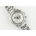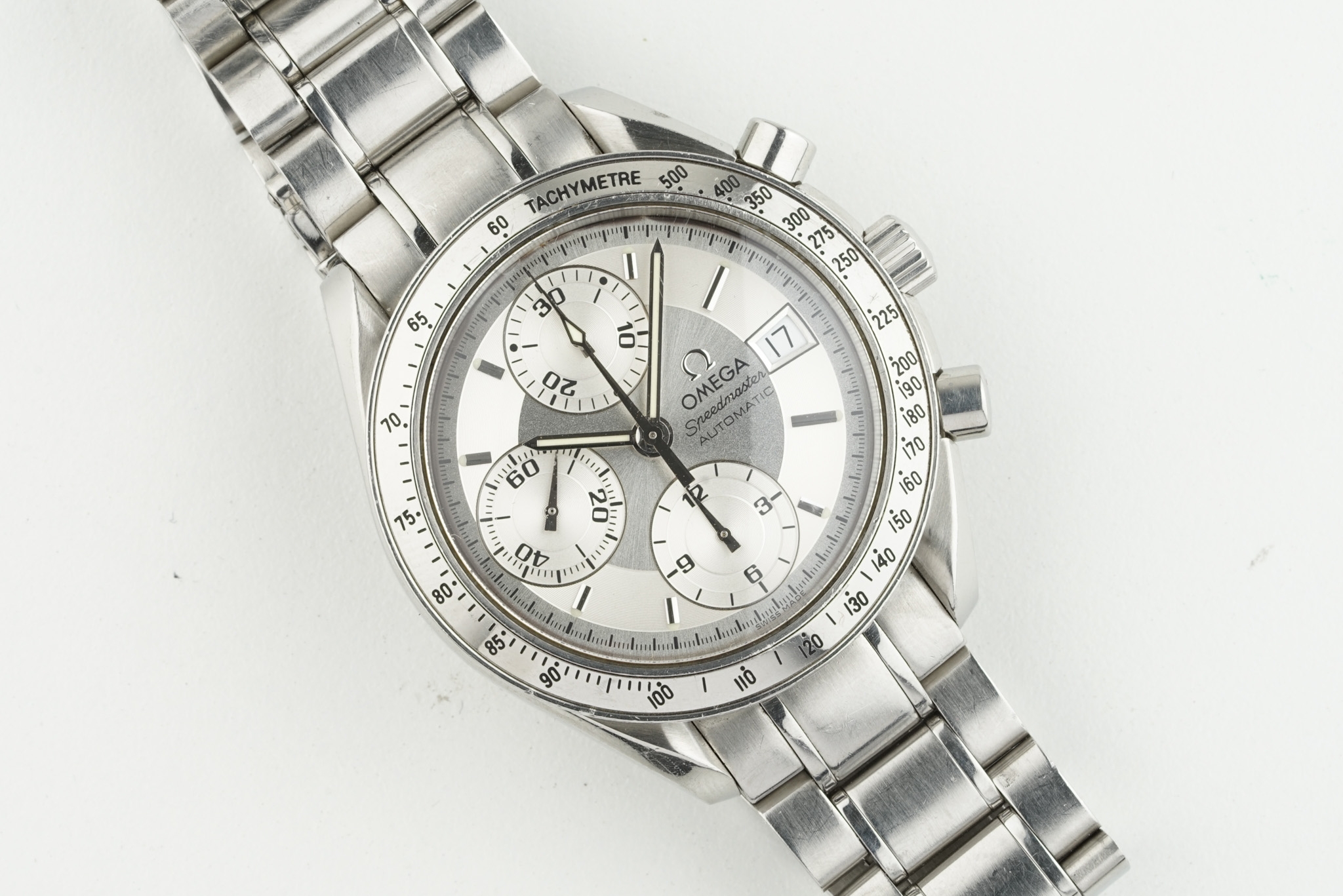 OMEGA SPEEDMASTER DATE AUTOMATIC CHRONOGRAPH, circular silver dial with stick hour markers and hands, 39mm stainless steel case with a crown and case back, inside is an automatic movement, on a s/s omega bracelet, watch is currently running.