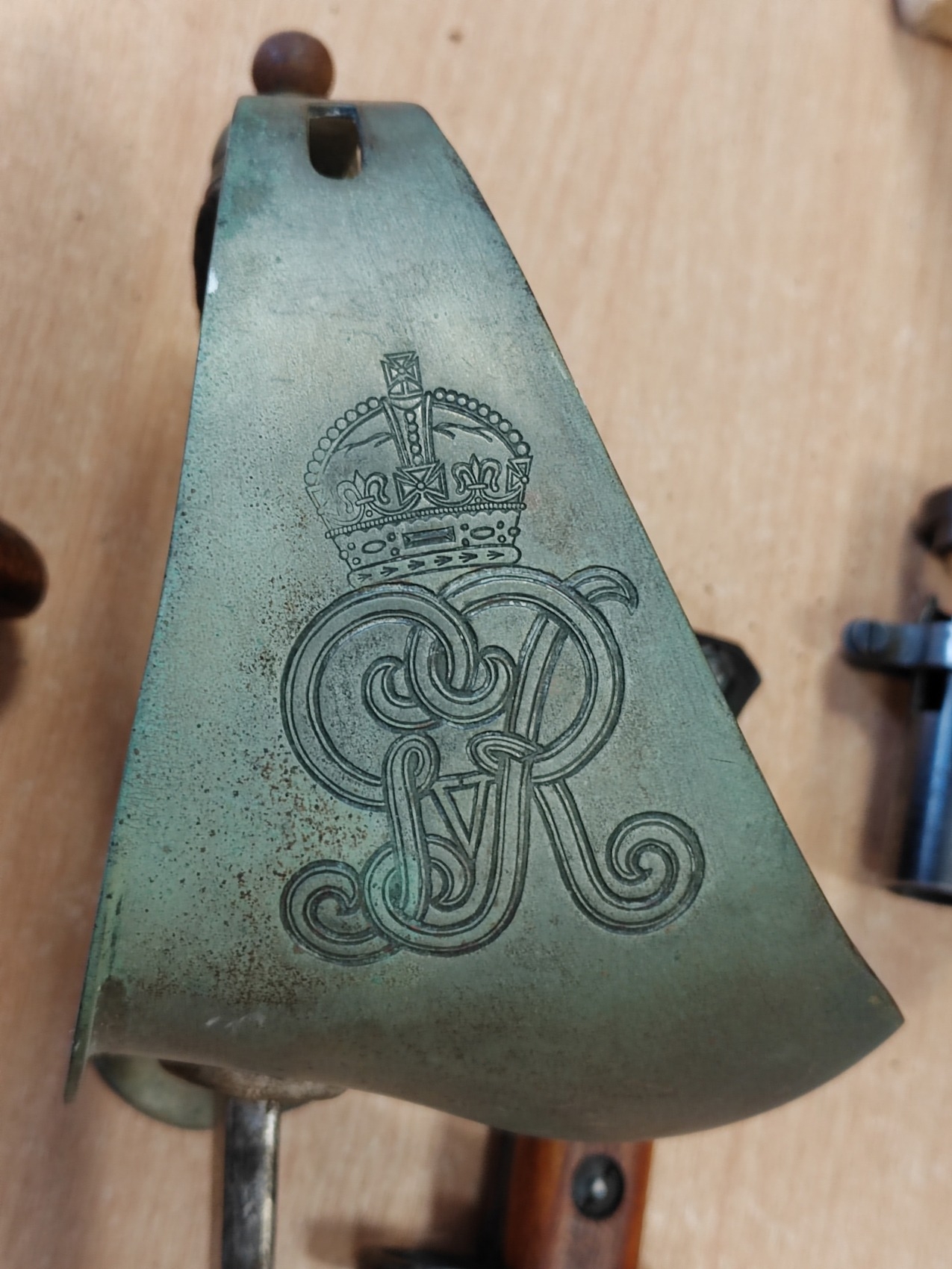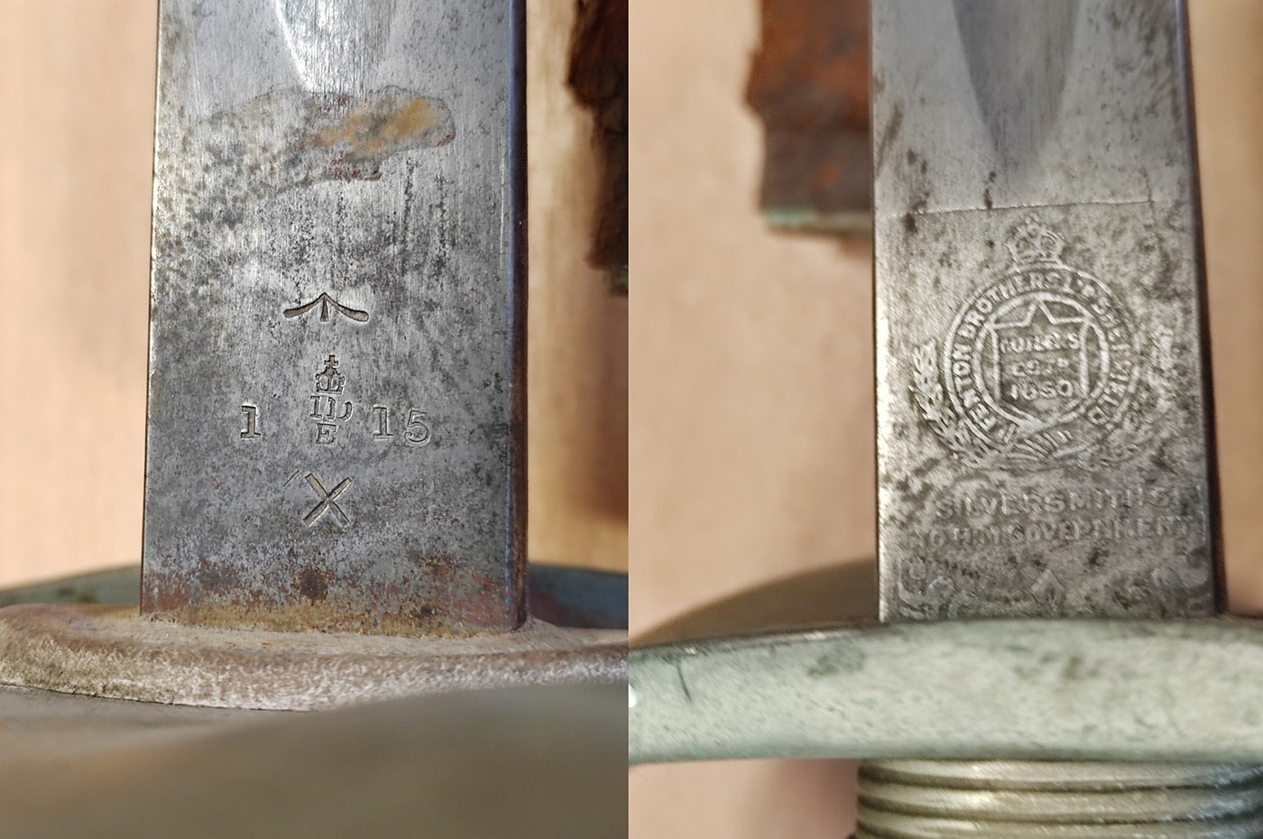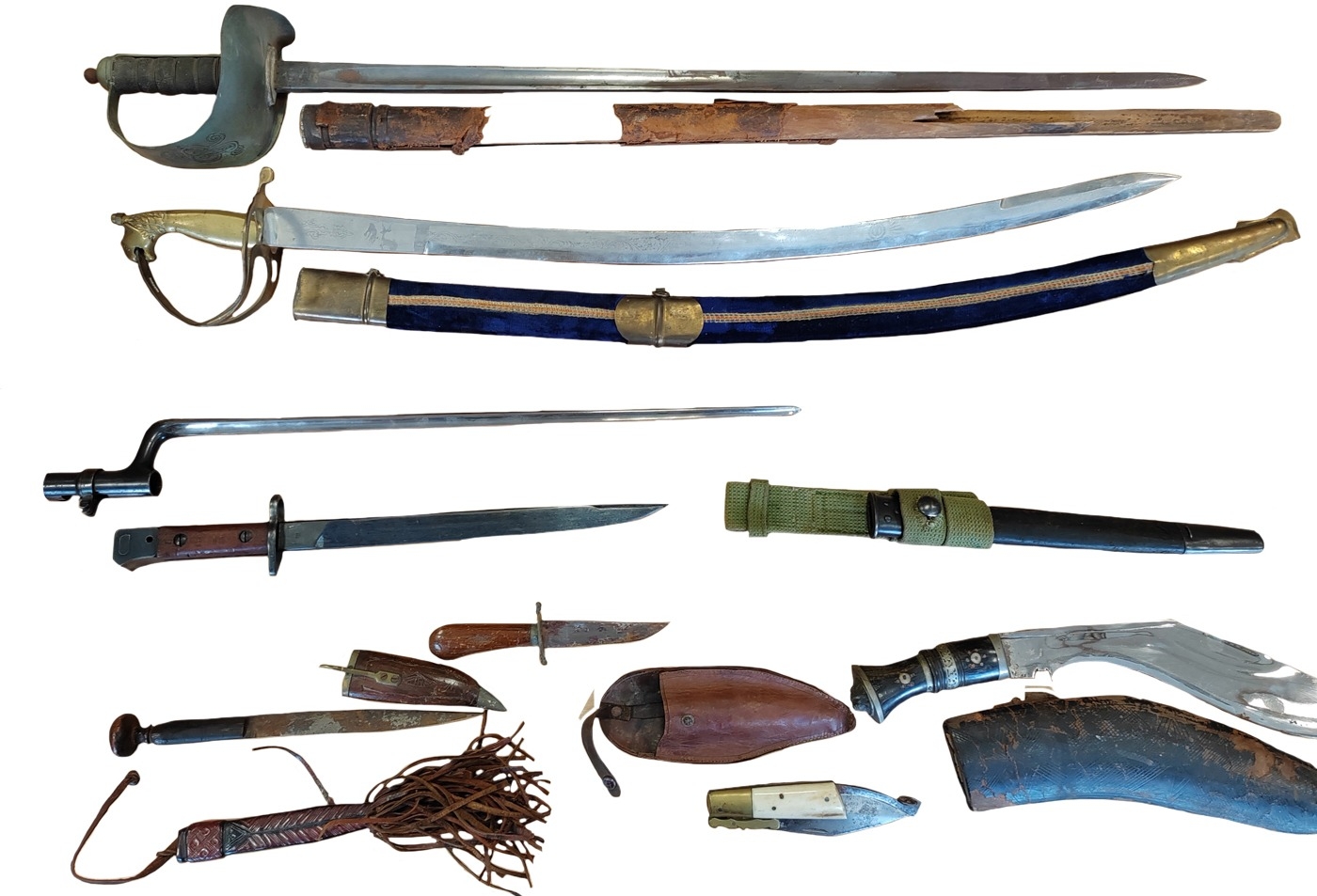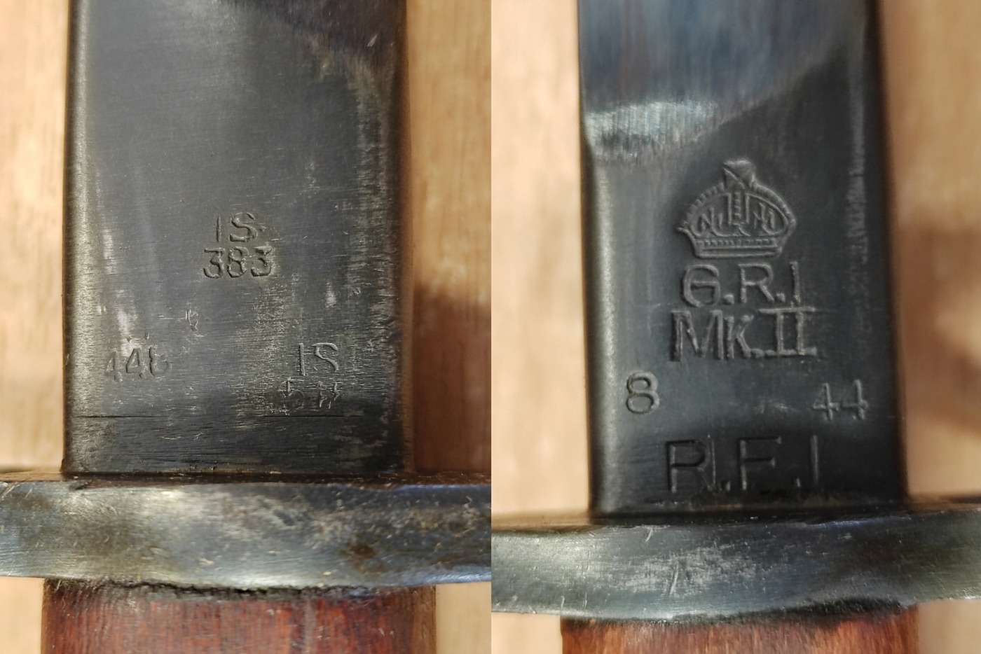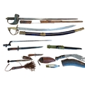 Edged weapon range with 944 Lee Enfield (SMLE) No1 Mk.III. rifle bayonet by R.I.F. (Rifle Factory Ishapore), ricasso marked Crown/G.R.I./Mk II/8, 44/R.F.I., reverse with various Indian inspection marks IS383, IS545 and 448, leather scabbard dated 1944, with webbing frog, extremely fine, plus socket bayonet with no markings, GVR sword with ricasso marked Fenton Brothers Sheffield / Silversmith to H.M Government, reverse marked crows foot and 1 15 either side of crown / X, scabbard is broken, and also range of tourist pieces cavalry sabre, Kukri etc. overall mixed condition. BUYER MUST COLLECT (B)