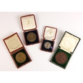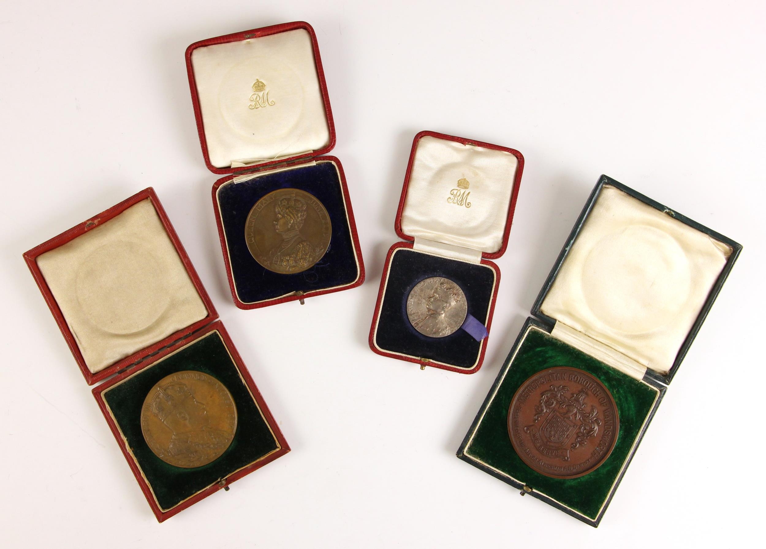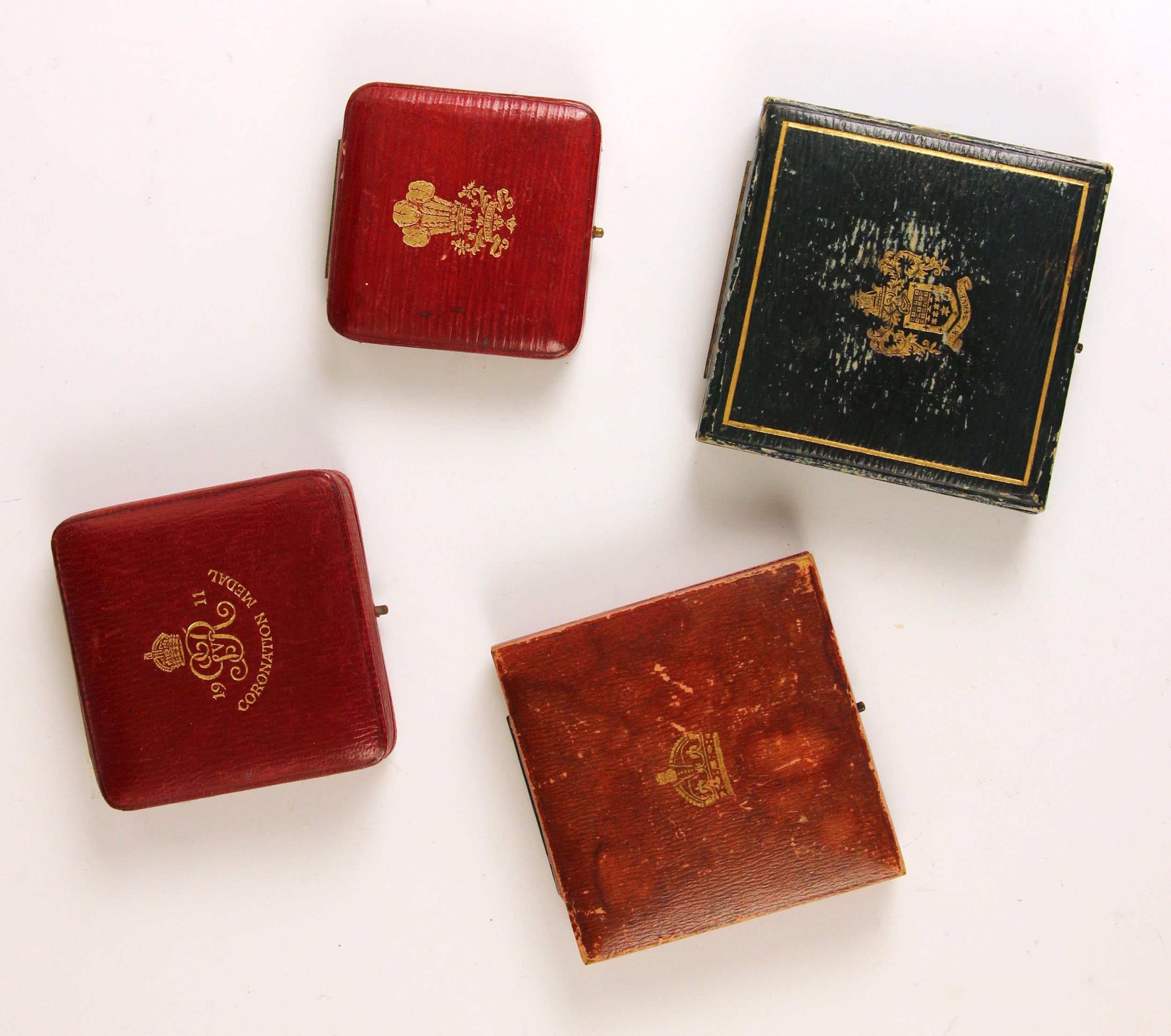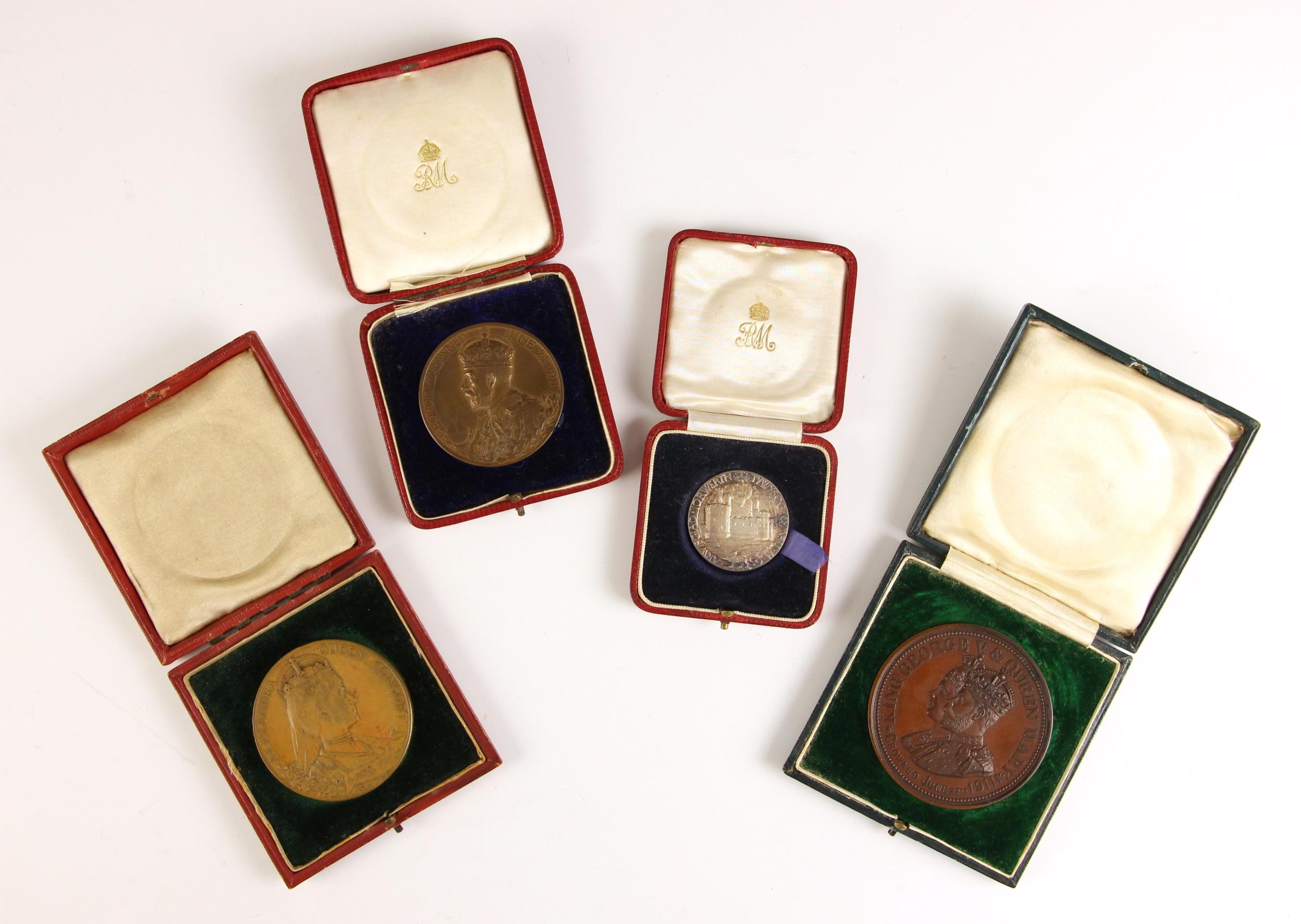 Edward VII, Coronation, 1902, a gilt bronze medal by G. W. De Saulles, crowned bust right, rev. crowned bust of Alexandra right, 55mm diameter, in original fitted case along with a George V coronation 1911 bronze medal, within original fitted case, a King George V and Queen Mary coronation 1911 Metropolitan Borough of Wandsworth medal, Presnted by The Mayor Alderman A. D. Dawnay within original fitted case and an Edward Prince of Wales Investiture medallion in original fitted case (4)