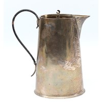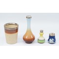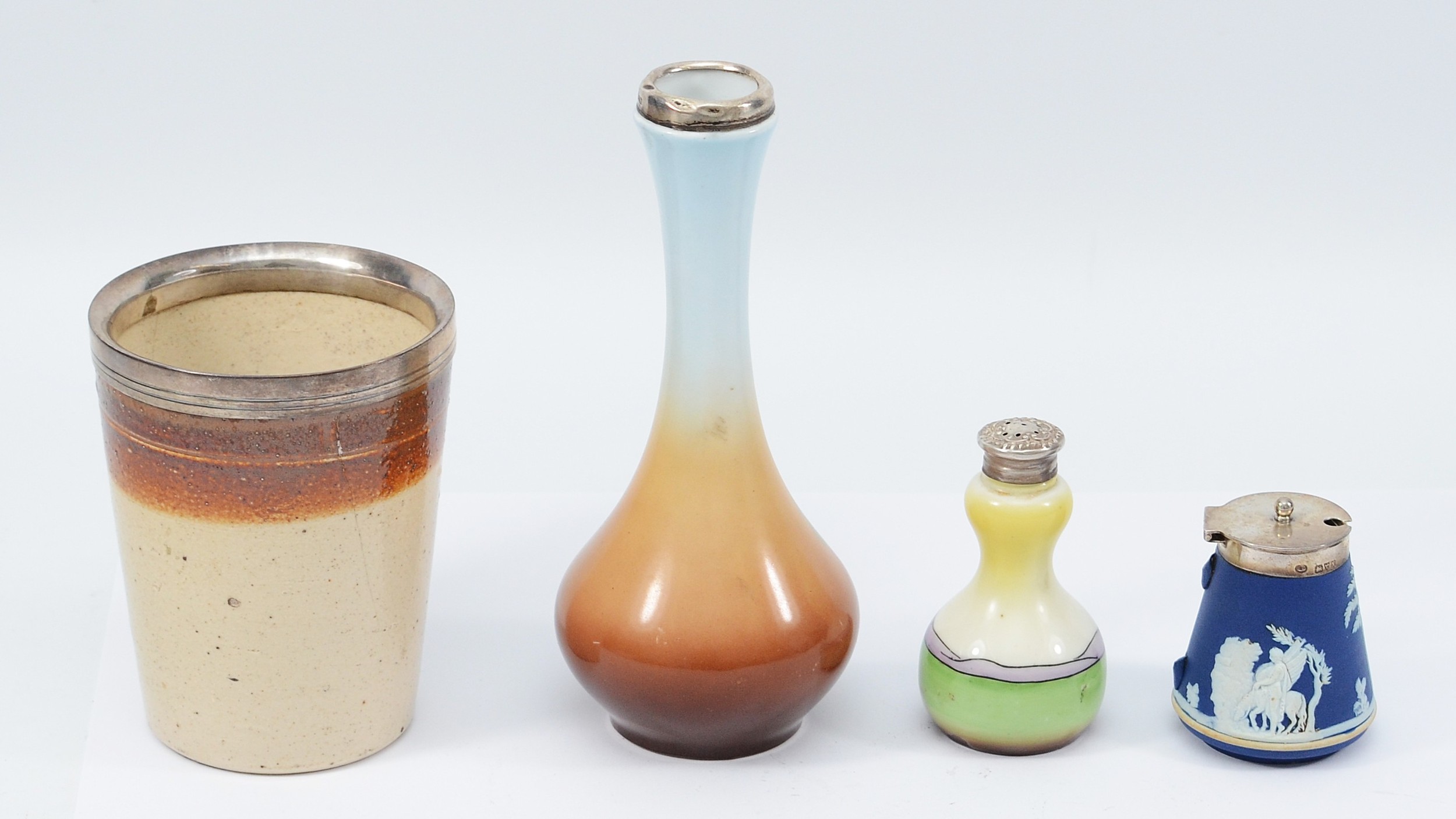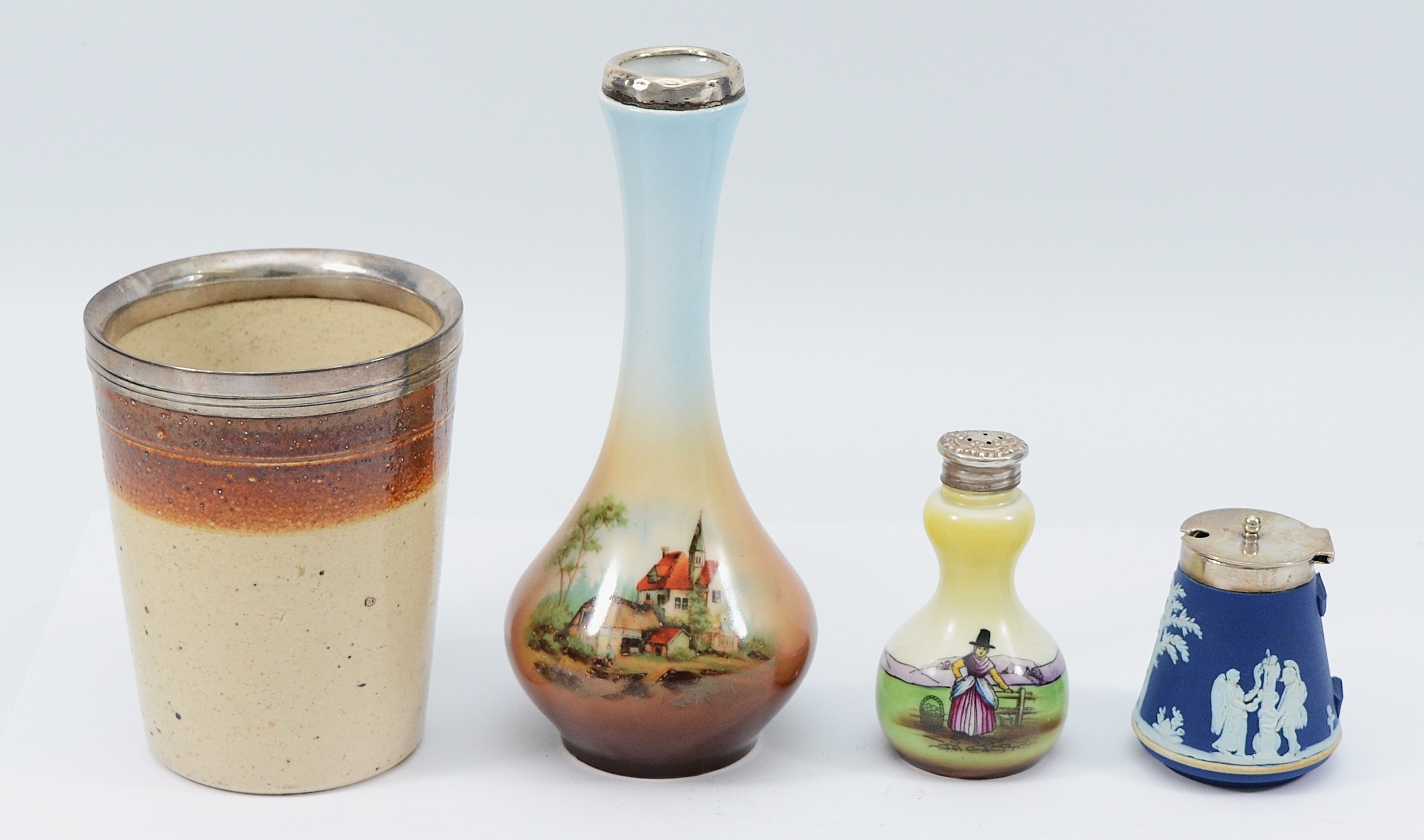 A porcelain bud vase with painted landscape scene to the front, having silver collar, Chester 1913, together with a painted porcelain pepper pot, having silver lid, London 1910, a Wedgewood Jasperware silver lidded mustard pot, Chester 1910, lacking handle, and a Victorian stoneware cup, with silver collar, London 1871, having multiple cracks to the side, tallest 18cm. (4)