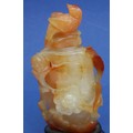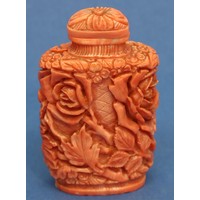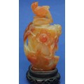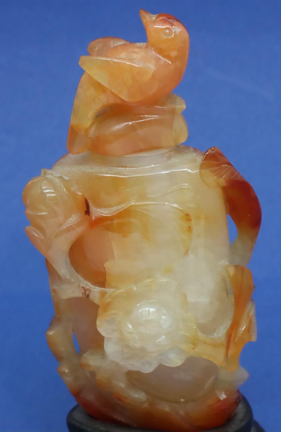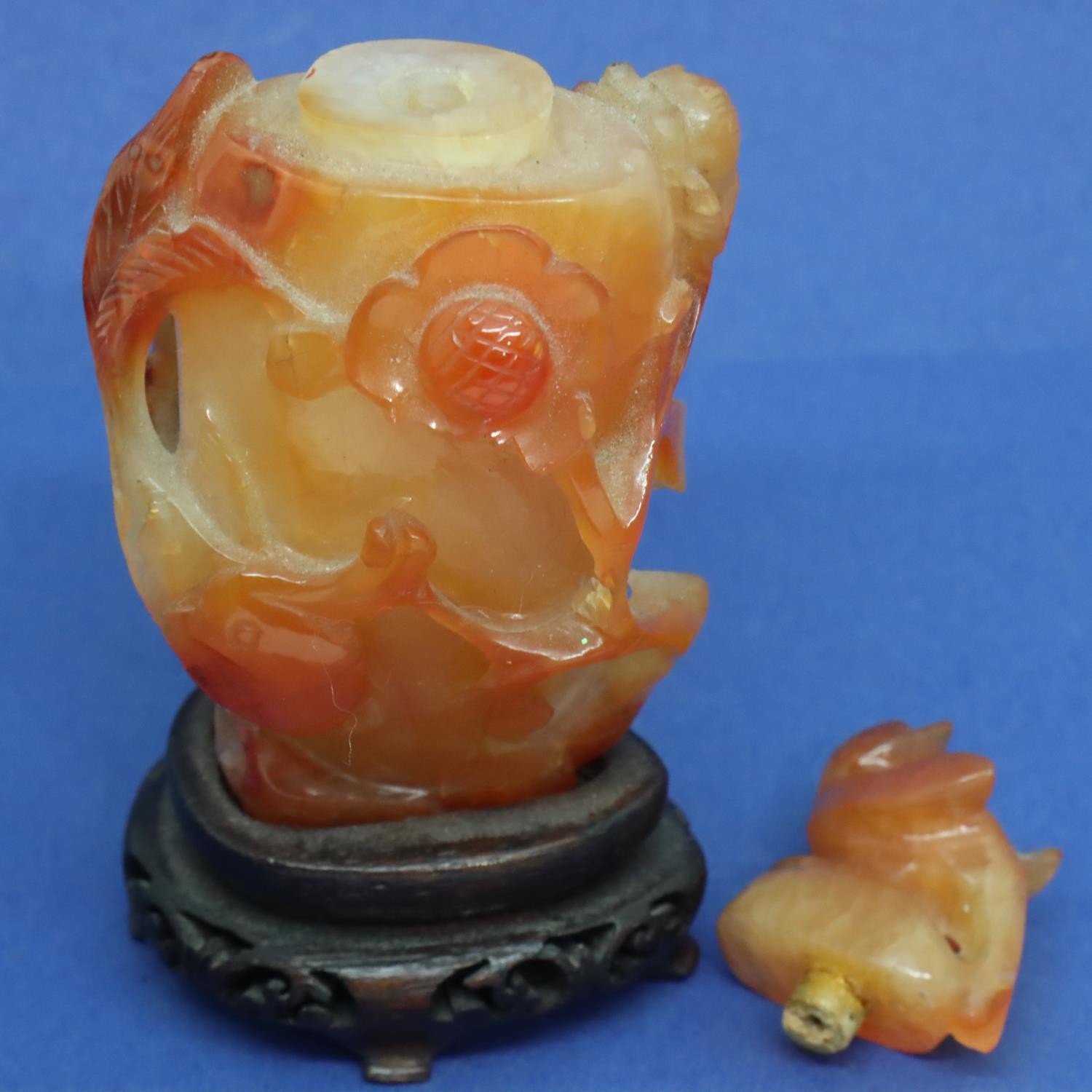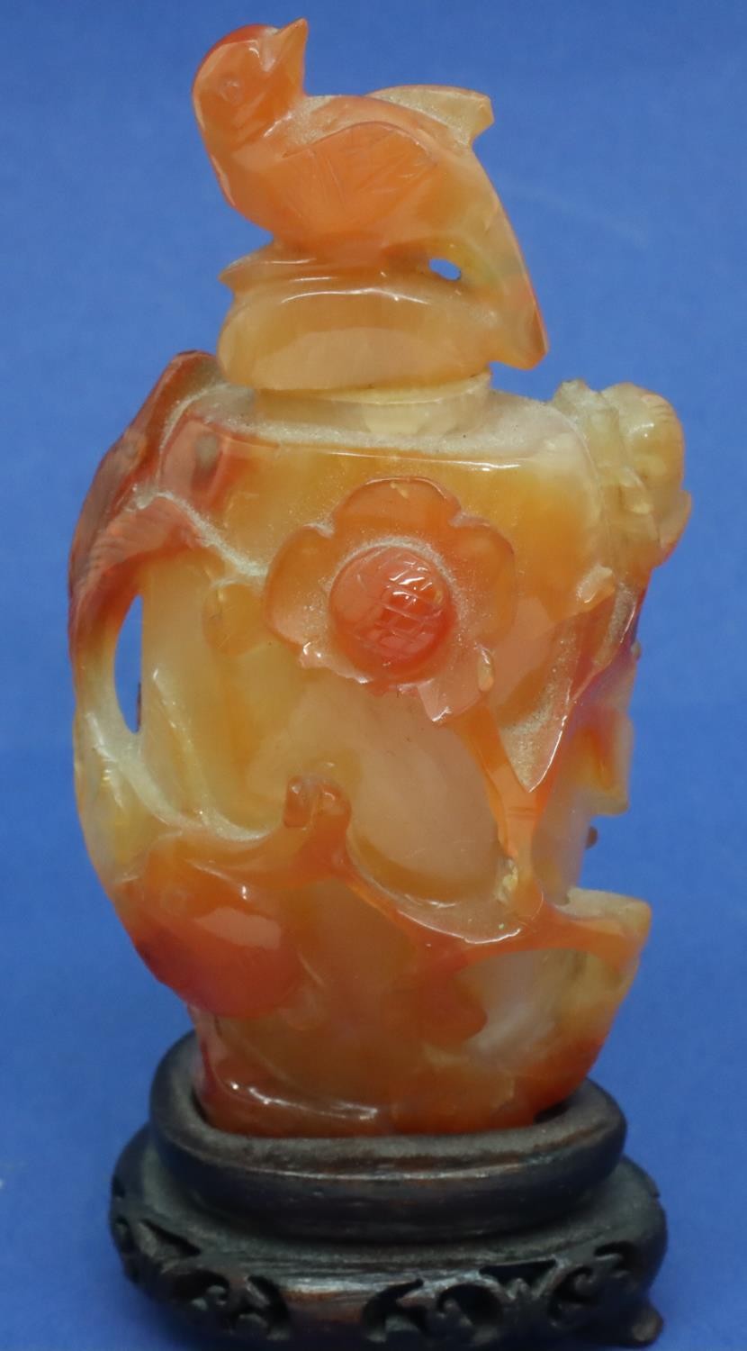 Carved white and orange jade snuff bottle with bird finial (lacking dropper) and carved bird and floral decoration, H: 88 mm, damage to orange flower. P&P Group 1 (£14+VAT for the first lot and £1+VAT for subsequent lots)