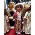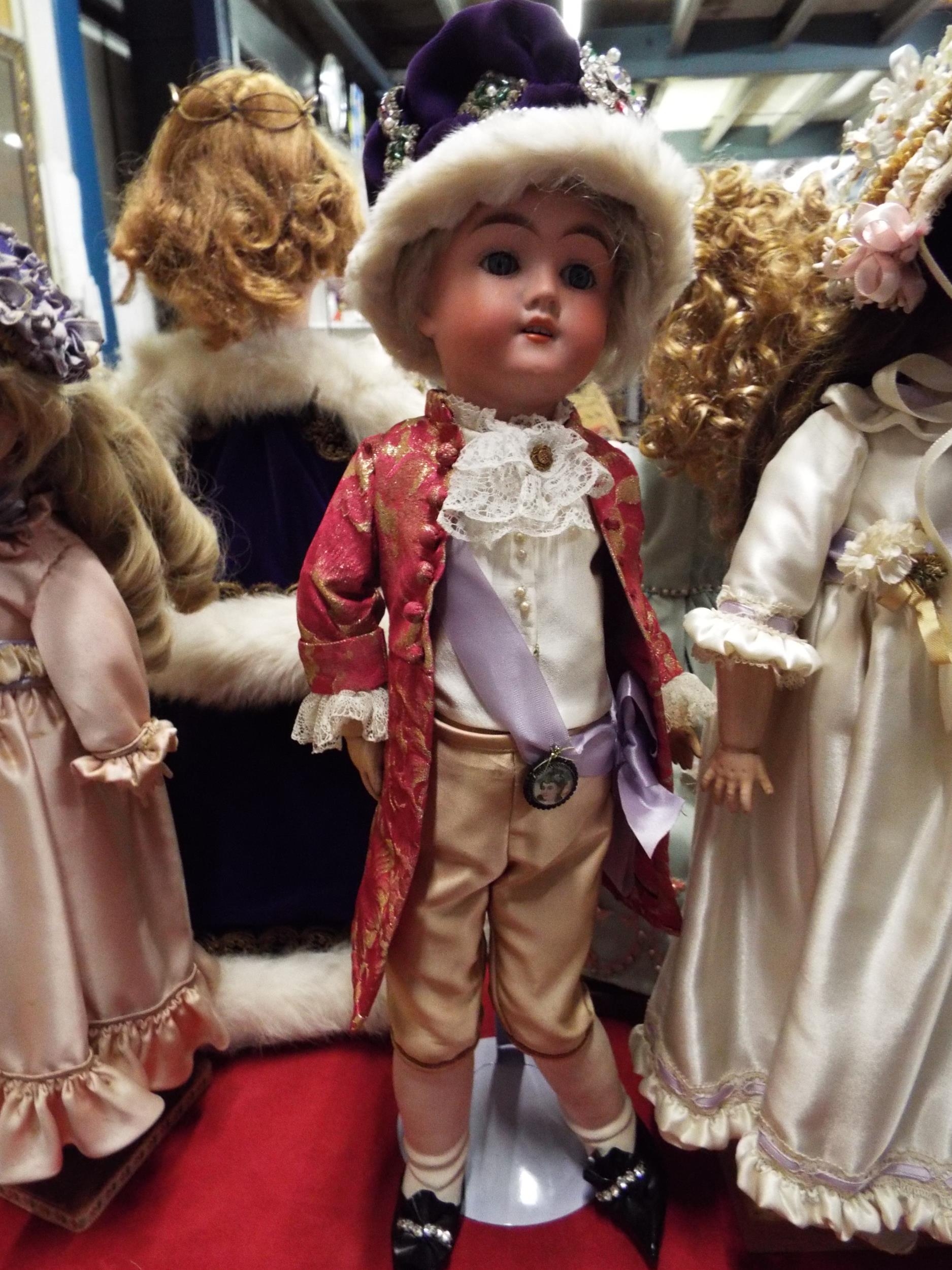 A vintage 18” Max Handwerck 0 1/4 German bisque head doll in Royal clothing (not original costume) on metal stand