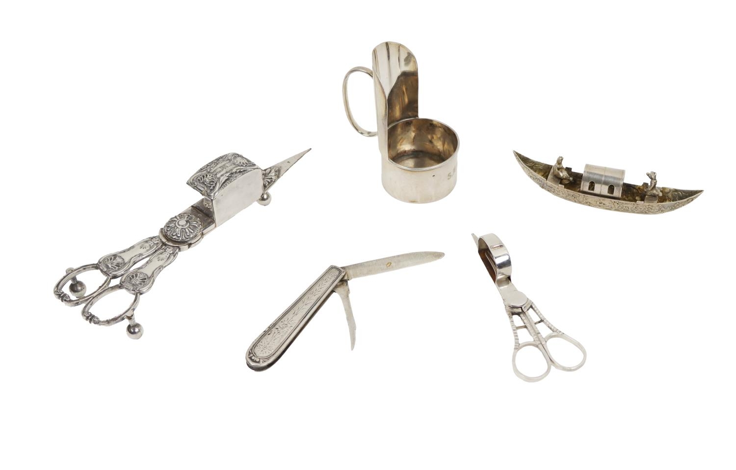 Silverware: A late Victorian silver Night Light Holder, Birmingham, Deakin & Francis Ltd., 1898; an attractive silver model of a Ship with figures, depicting a Hanau Gondola, Neresheimer 1910; a Victorian King pattern plated Wick Trimmer; an English Georgian period silver Wick Trimmer, London, Wilkes Booth, approx. 1 ounce; an American early 20th Century etched design silver Fruit Knife & Nut Pick, Gorham 1910, as a lot. (5)