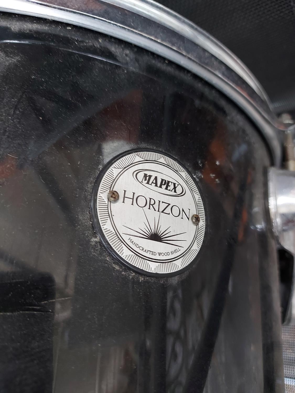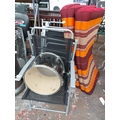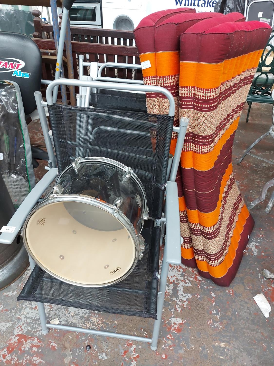 Eight items to include a set of six grey metal folding patio chairs with black upholstery, a black Mapex Horizon rack tom drum with Remo Weatherking Emperor batter and a retro style multi-coloured stowaway mattress