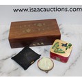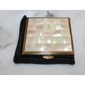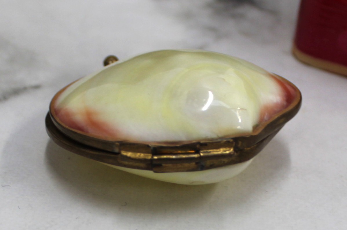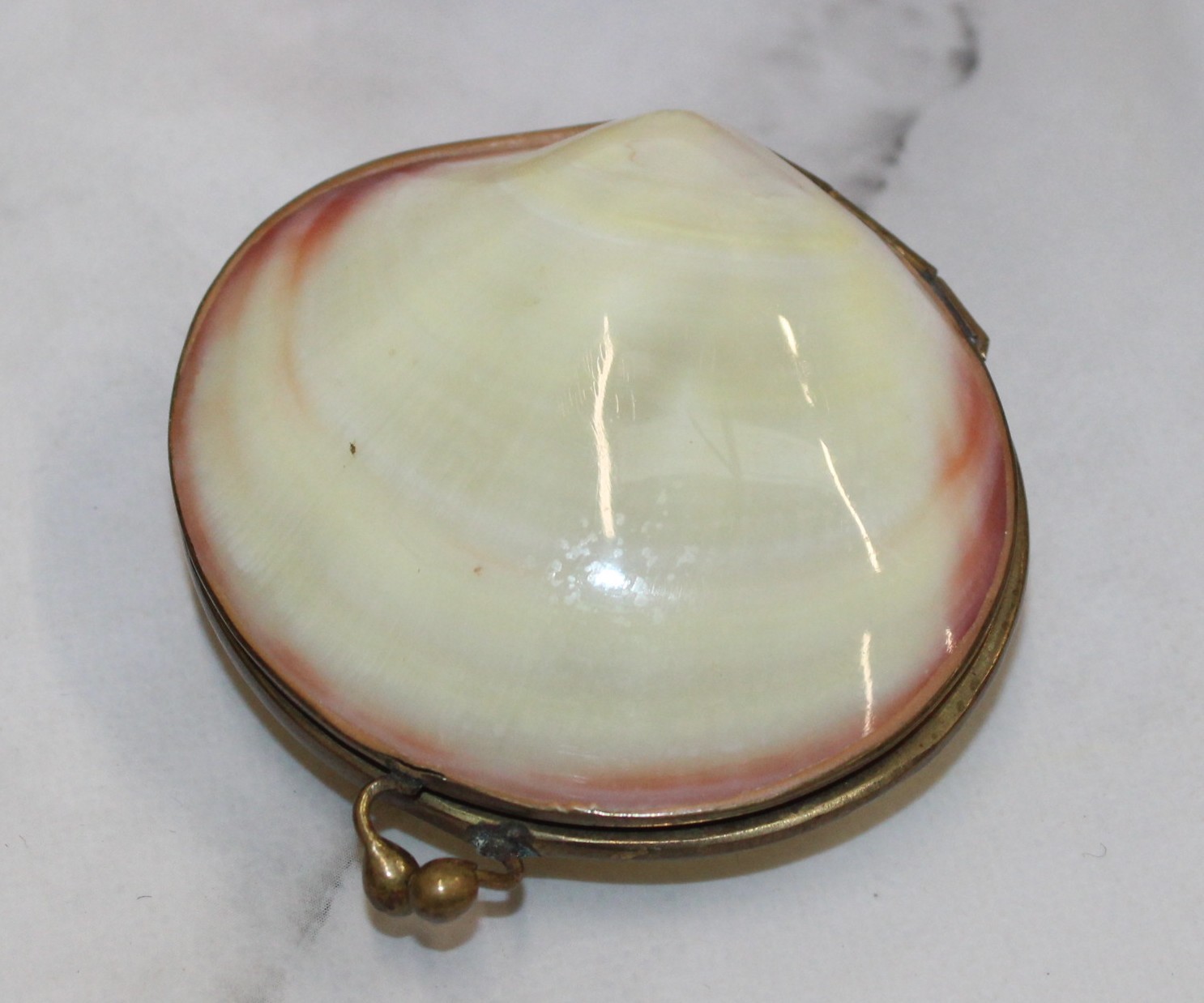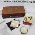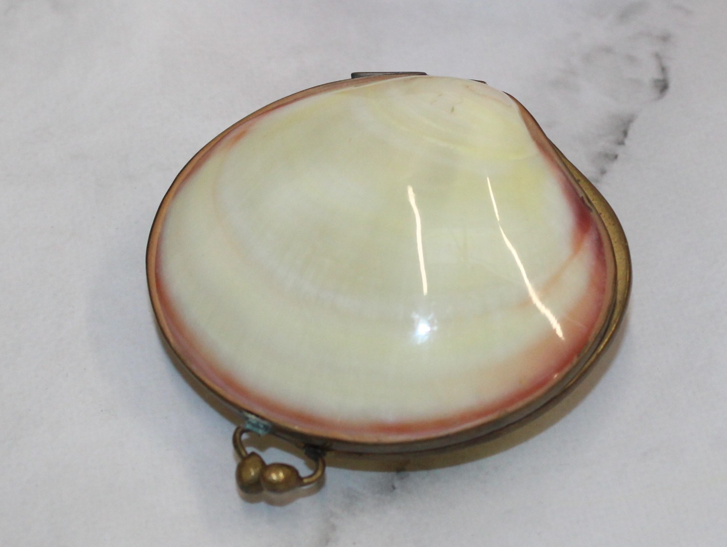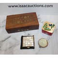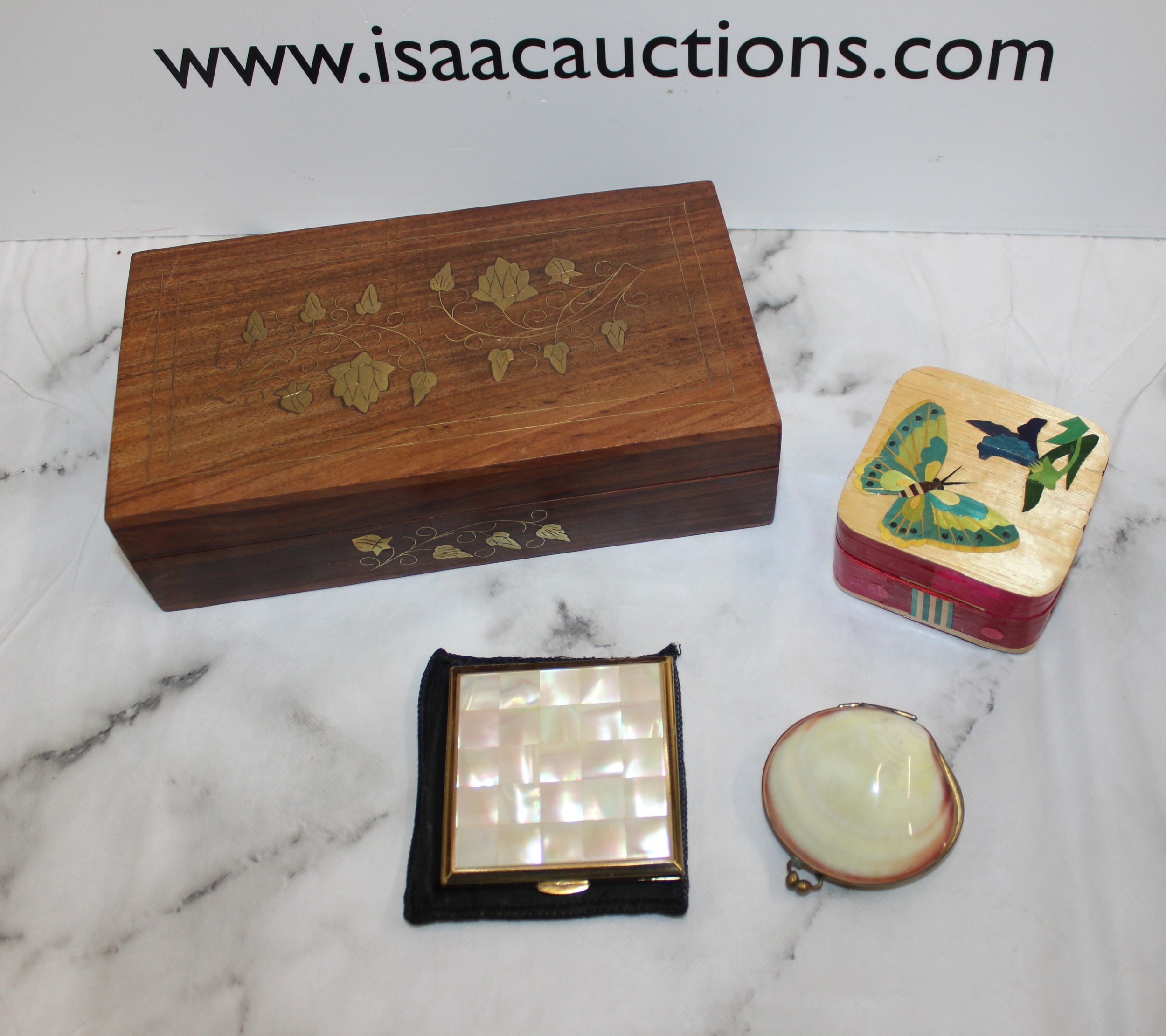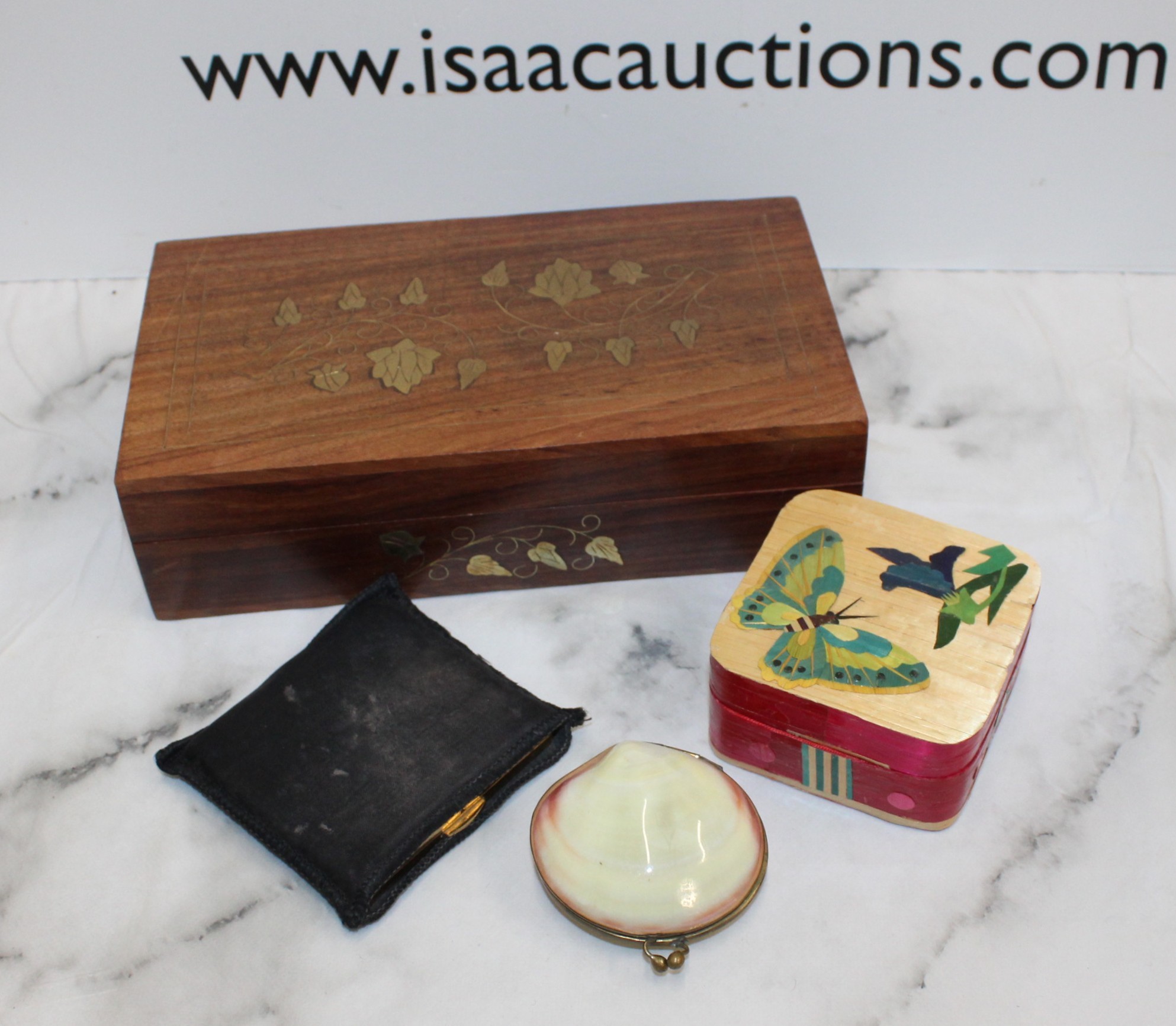 Mixed Items Inc- Decorative Wooden Box, Vintage Kigu London Mother Of Pearl Vanity Compact With Powder Content, Clam Shell Coin Purse & Decorative Box All As Found