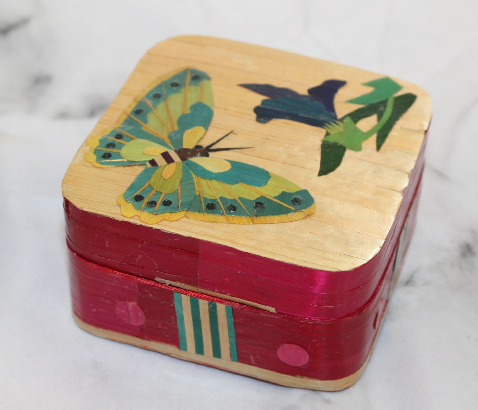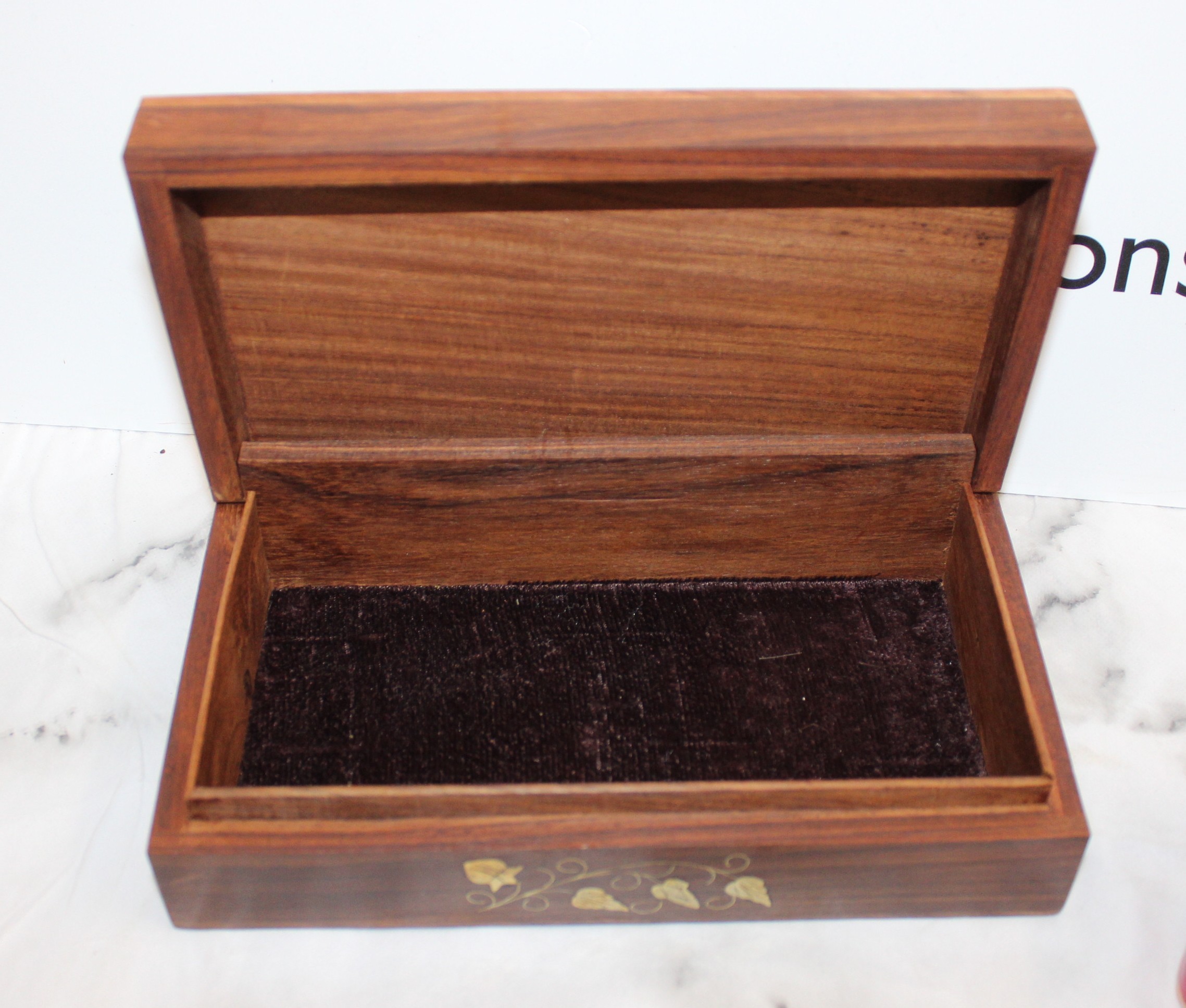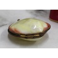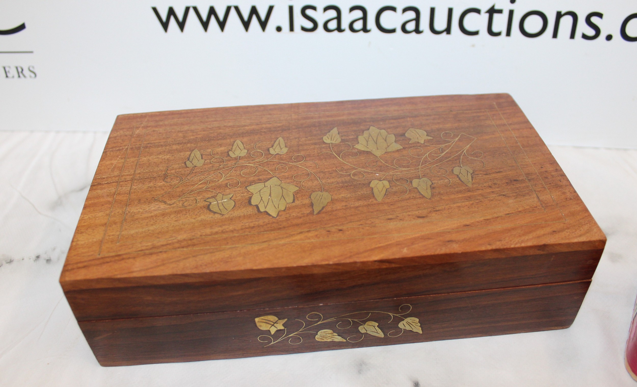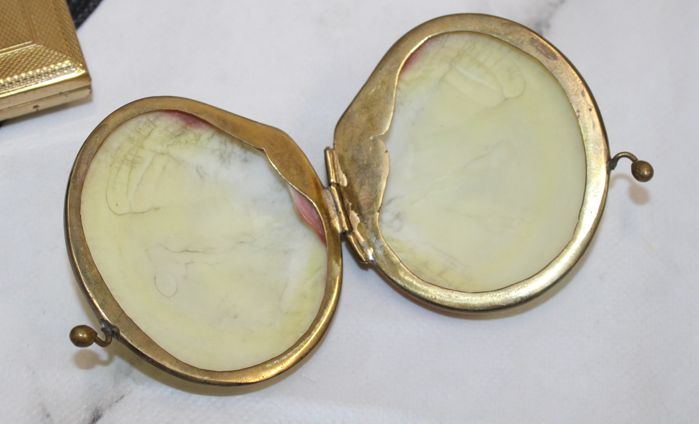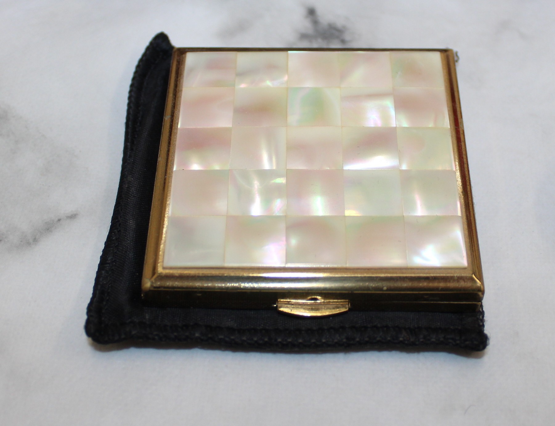 Mixed Items Inc- Decorative Wooden Box, Vintage Kigu London Mother Of Pearl Vanity Compact With Powder Content, Clam Shell Coin Purse & Decorative Box All As Found