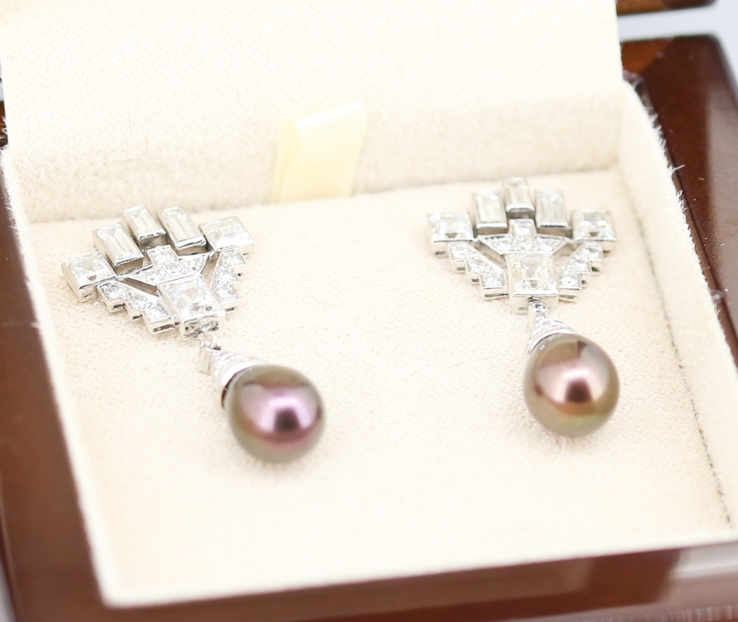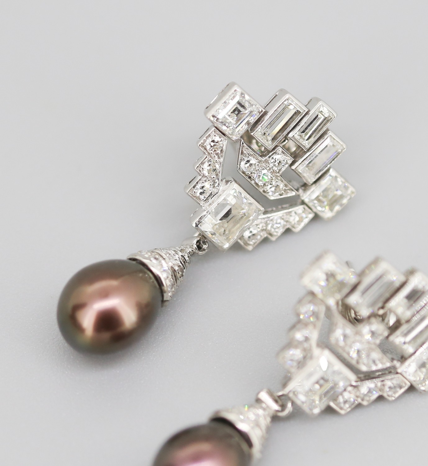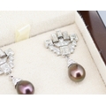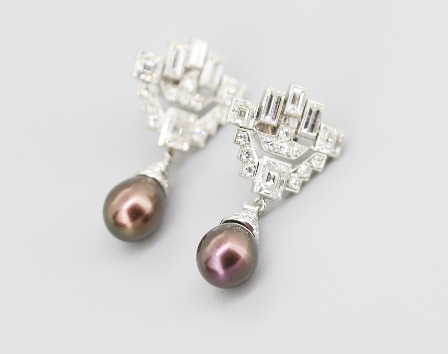 Finely Detailed Emerald Cut Baguette Cut and Round Cut Diamond Set Tahitian Pearl Drop Earrings Mounted in 18 Carat White Gold 3.5cm Drop