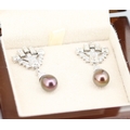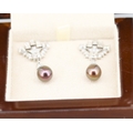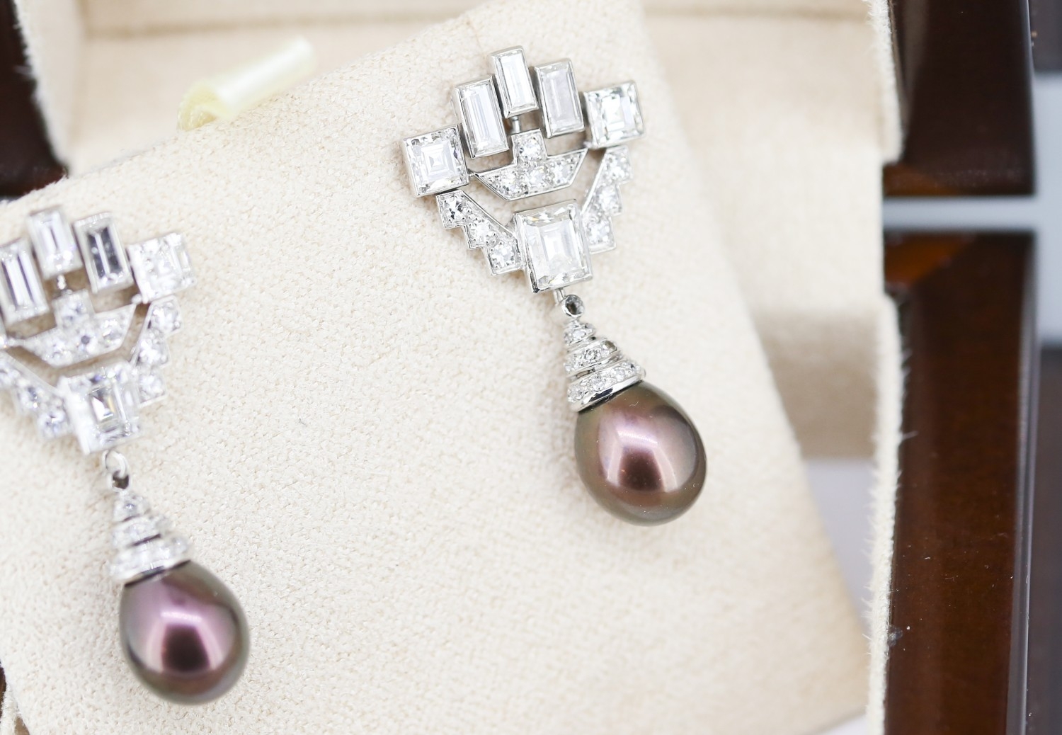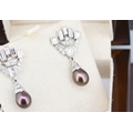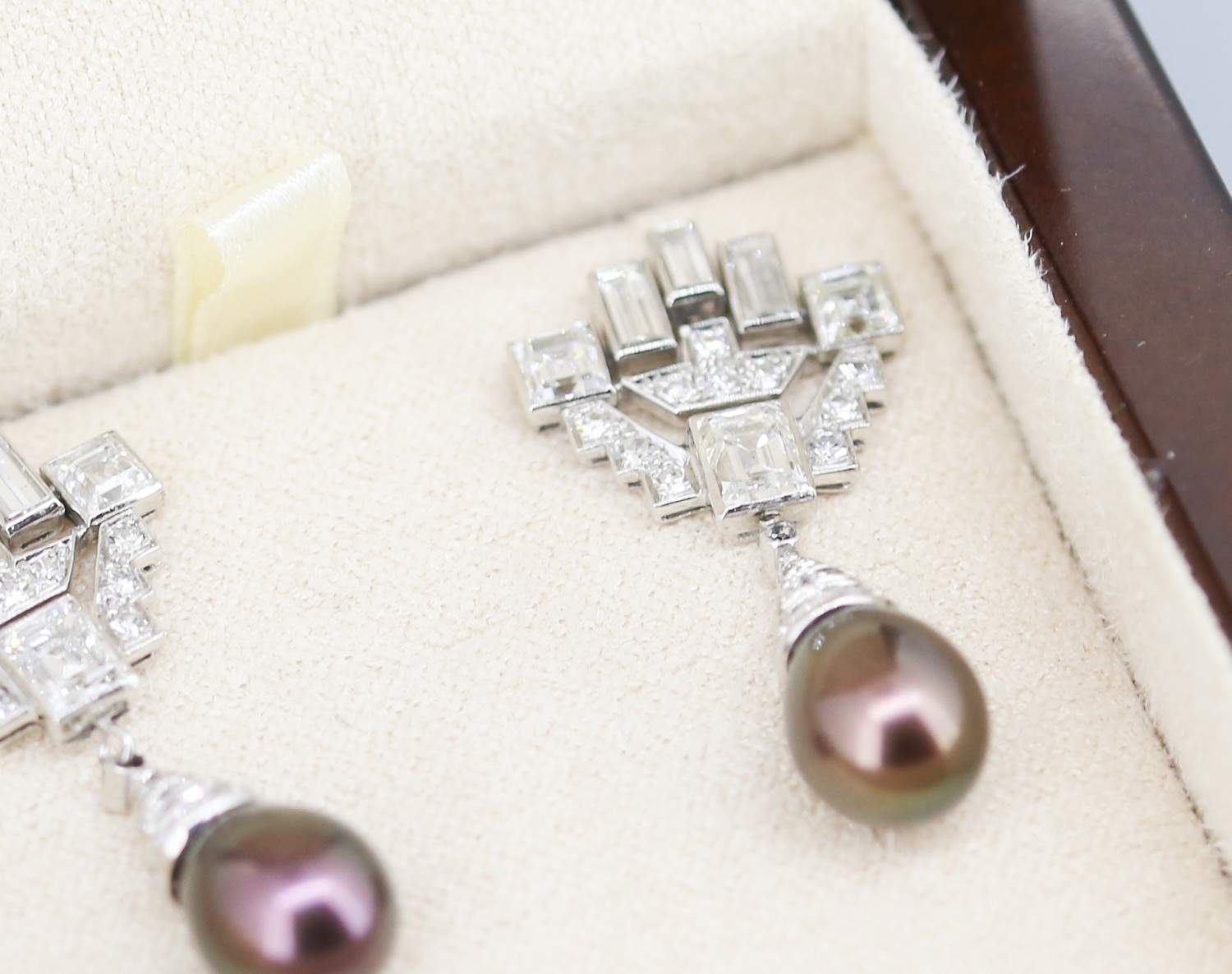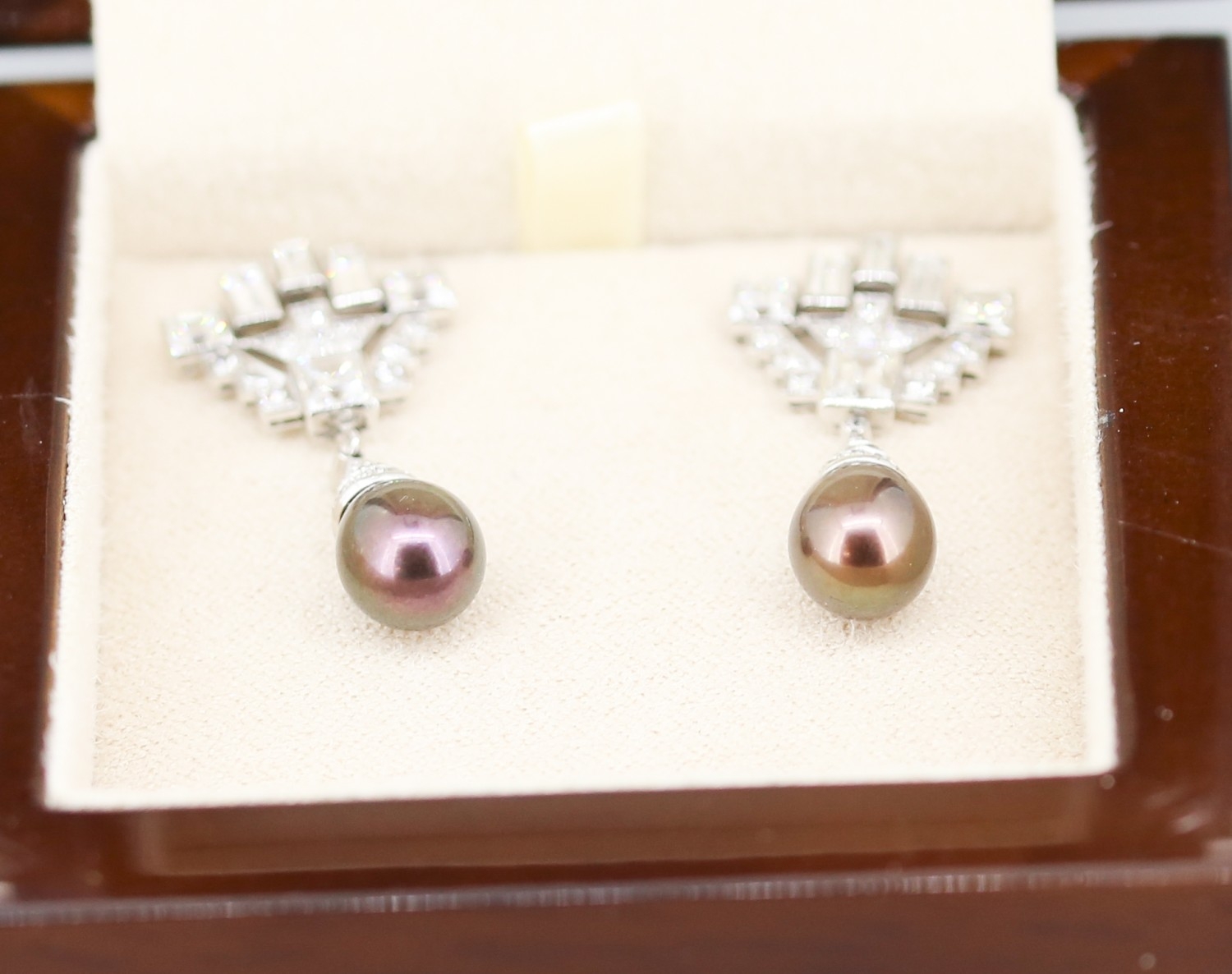 Finely Detailed Emerald Cut Baguette Cut and Round Cut Diamond Set Tahitian Pearl Drop Earrings Mounted in 18 Carat White Gold 3.5cm Drop