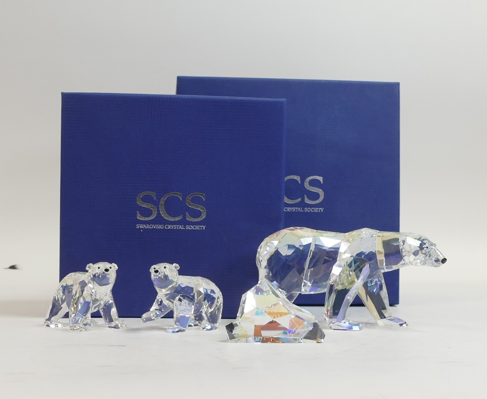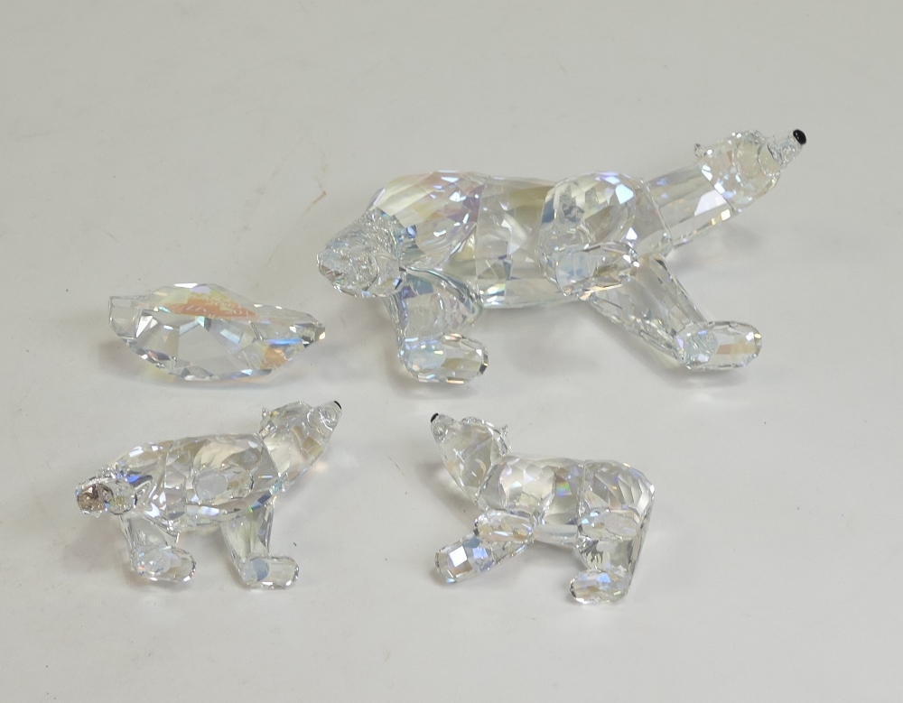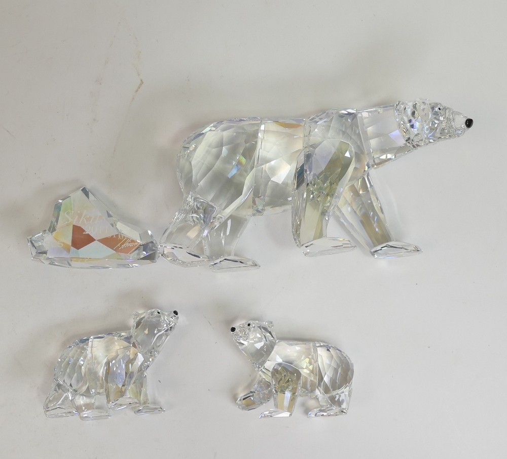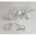 Swarovski Crystal Siku The Polar Bear (1053154) with Two Polar Bear Cubs (1079156) all retired 2011 designed by Anton Hirzinger presented in moonlight crystal with a Iceberg Plaque. Boxed with certificate of authenticity. Tallest:-8cm. (4)