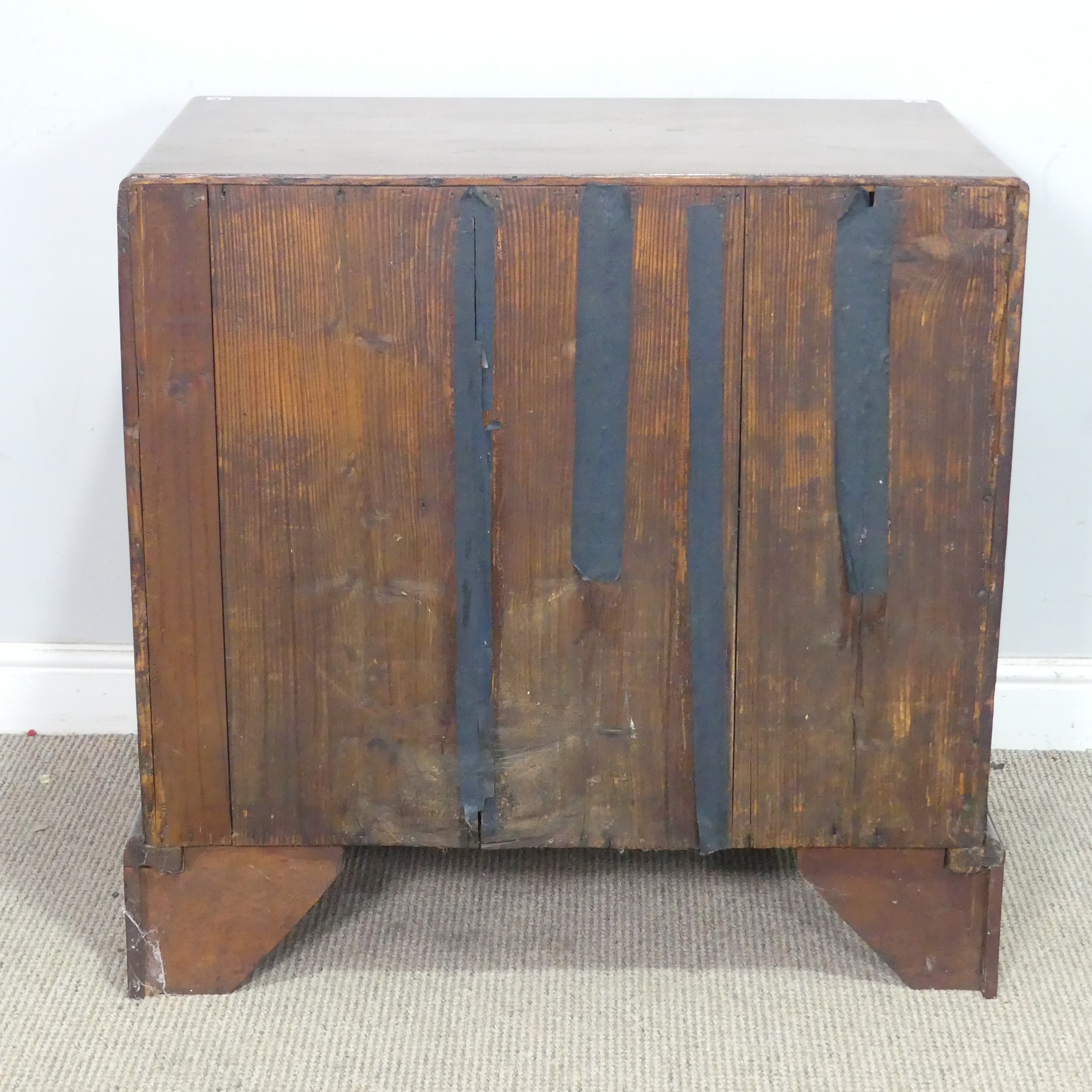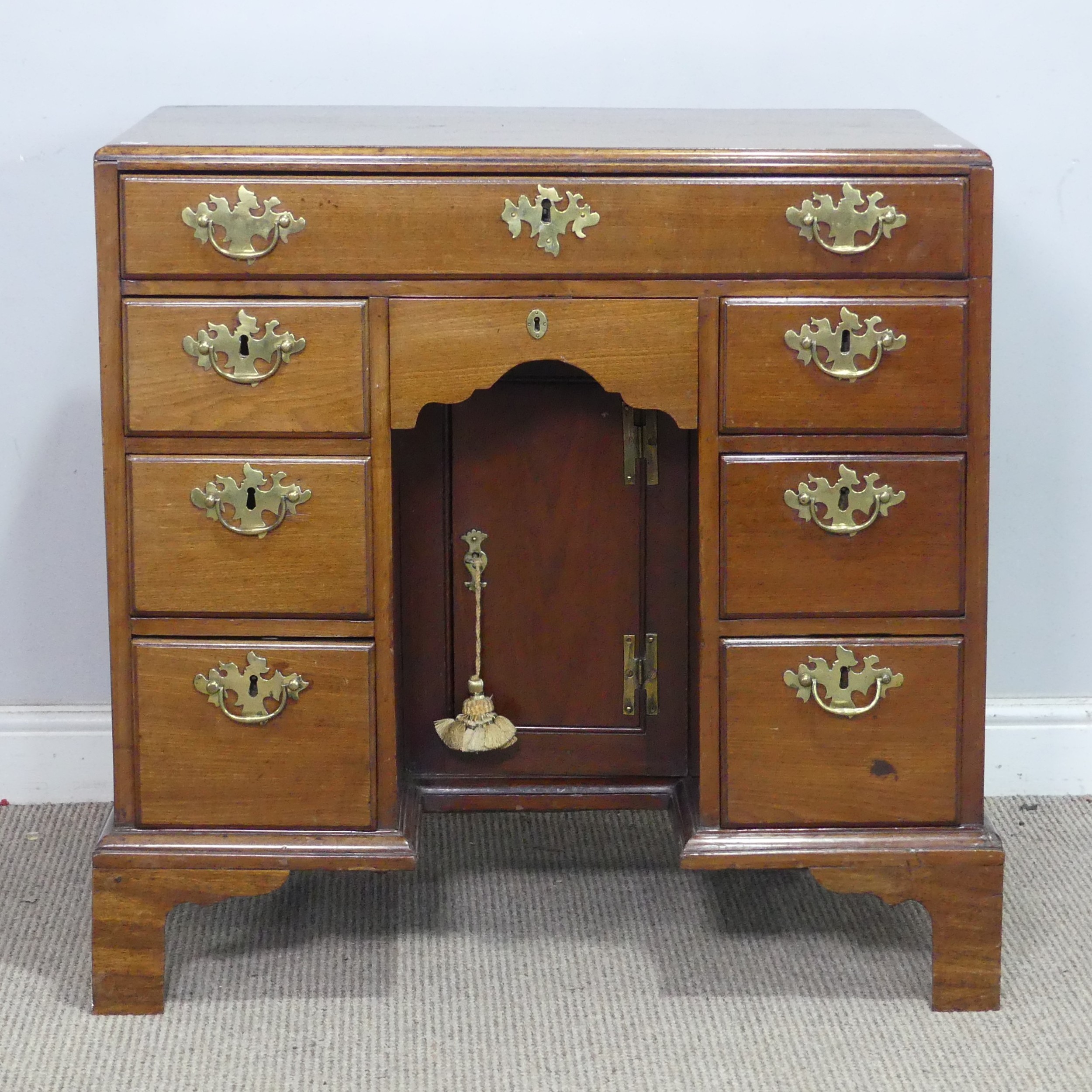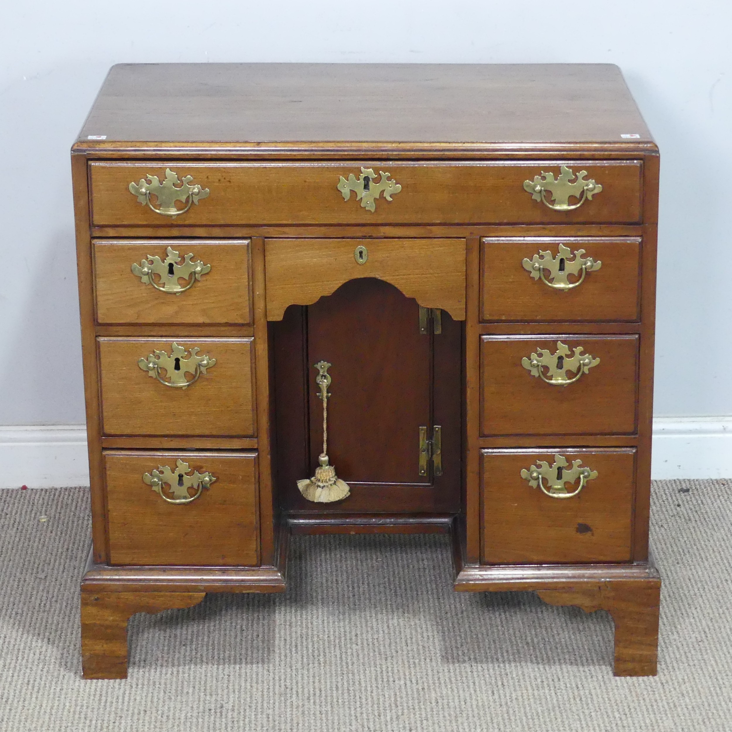 A George III style mahogany kneehole Desk, with carrying handles to each side, and a kneehole cupboard, W 77 cm x H 77 cm x D 48 cm.