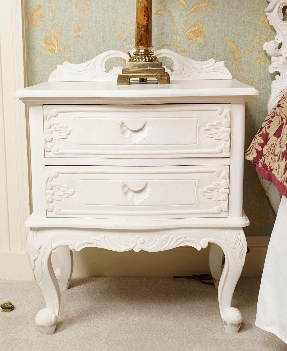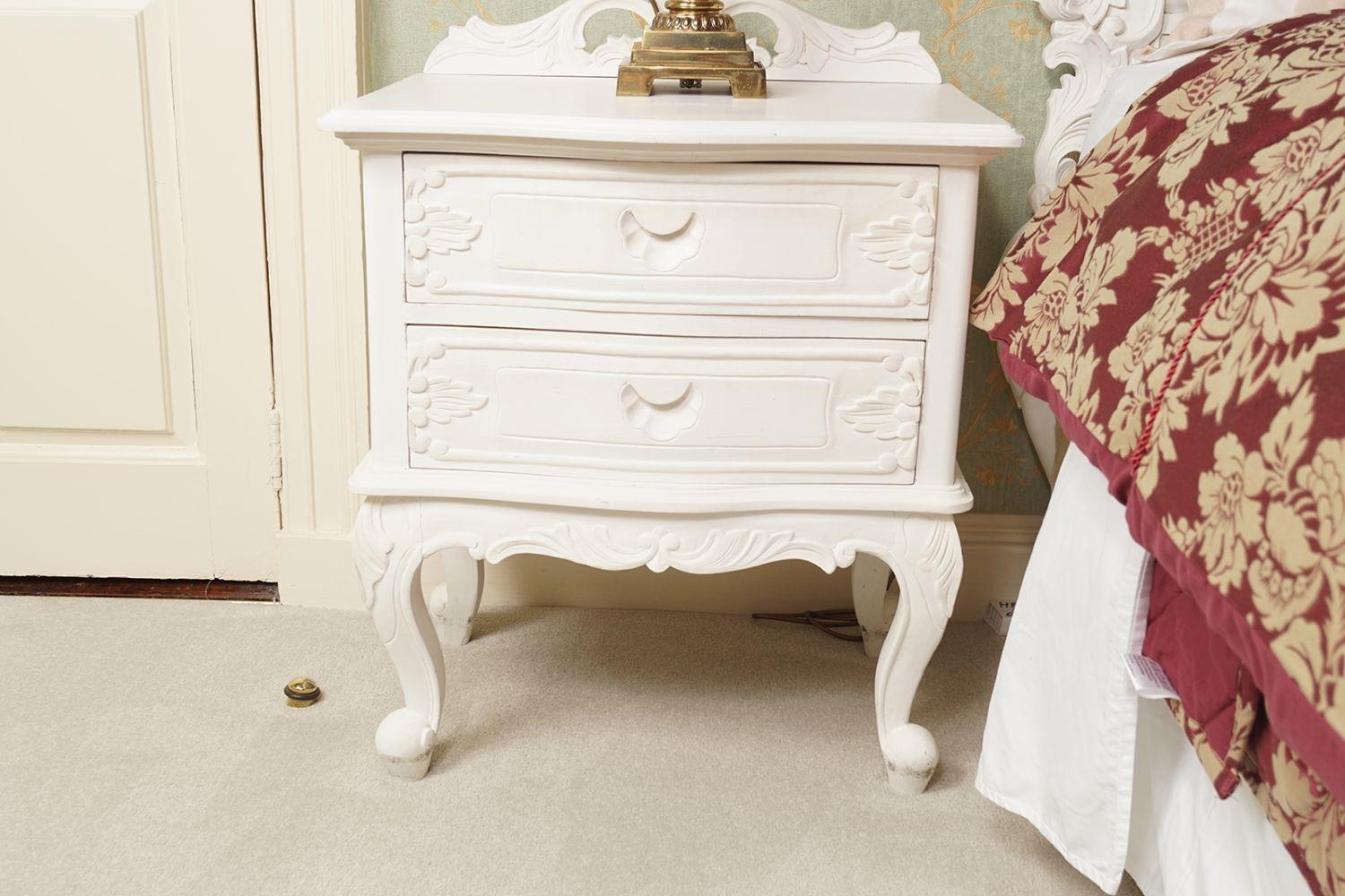 to include an ornate Rococo, scroll decorated headboard, together with a pair of Louis XV style serpentine chests. Chests: 77 cm. high; 61 cm. wide; 45 cm. deep; Bed: 214 cm. wide