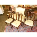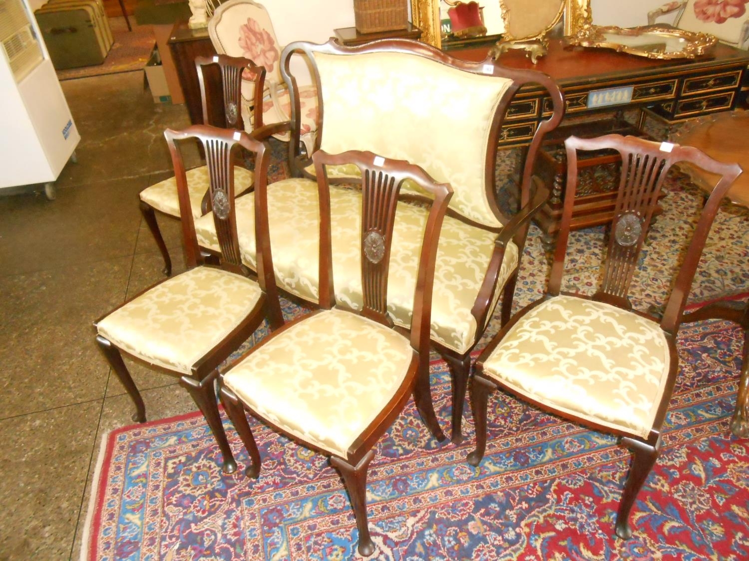 An Edwardian mahogany framed settee with upholstered seat and back rest, on scrolling cabriole legs and a set of four similar salon chairs with pierced centre splats and paterae, shaped seats, on scroll legs