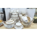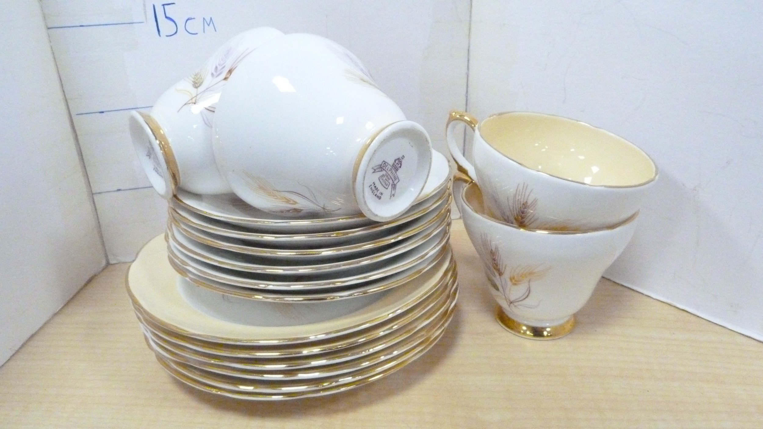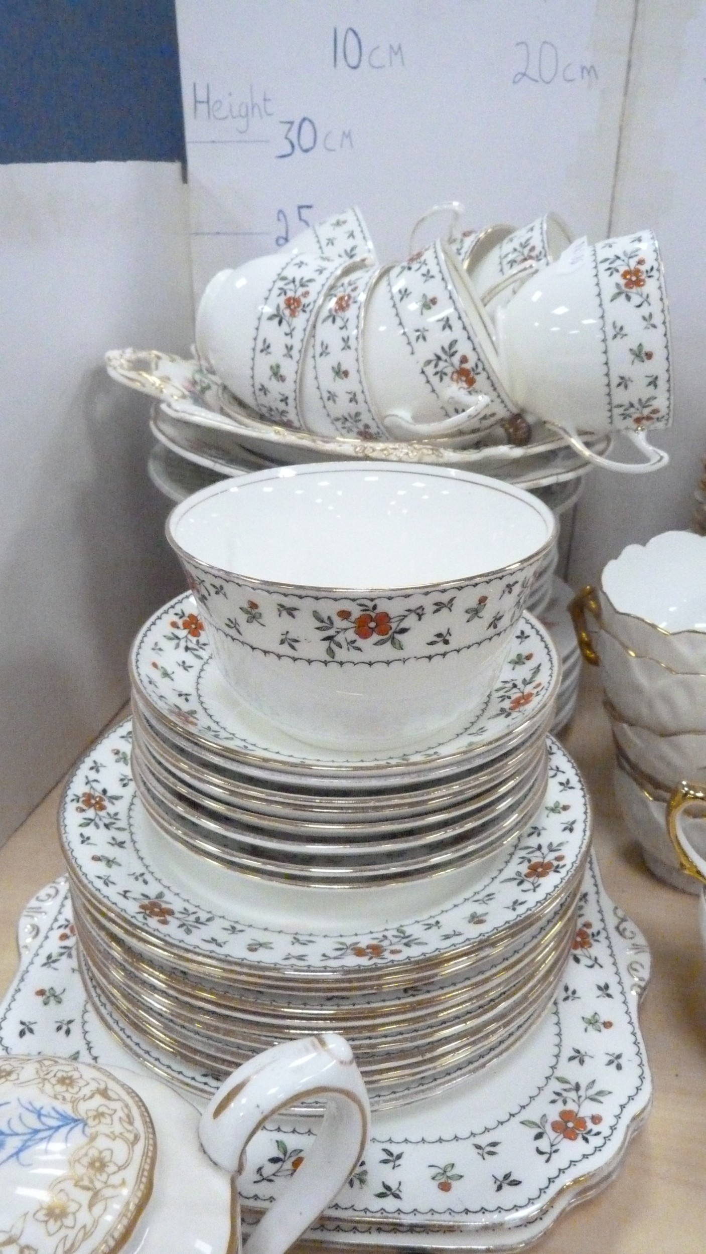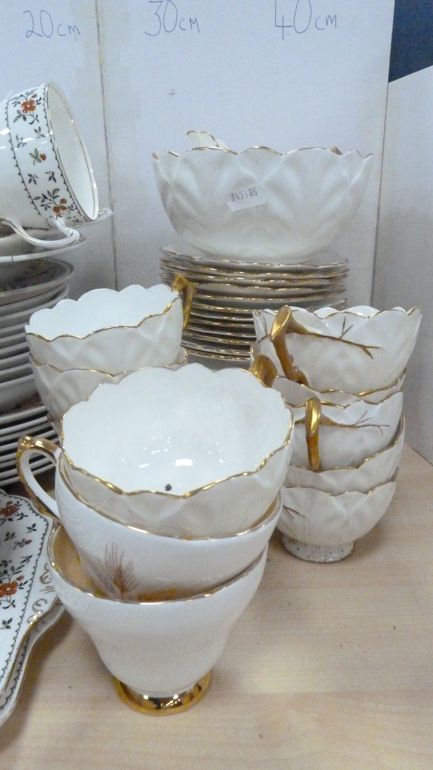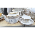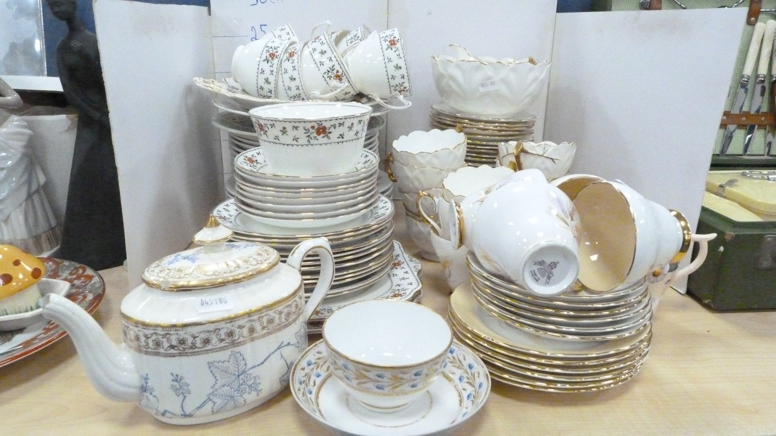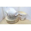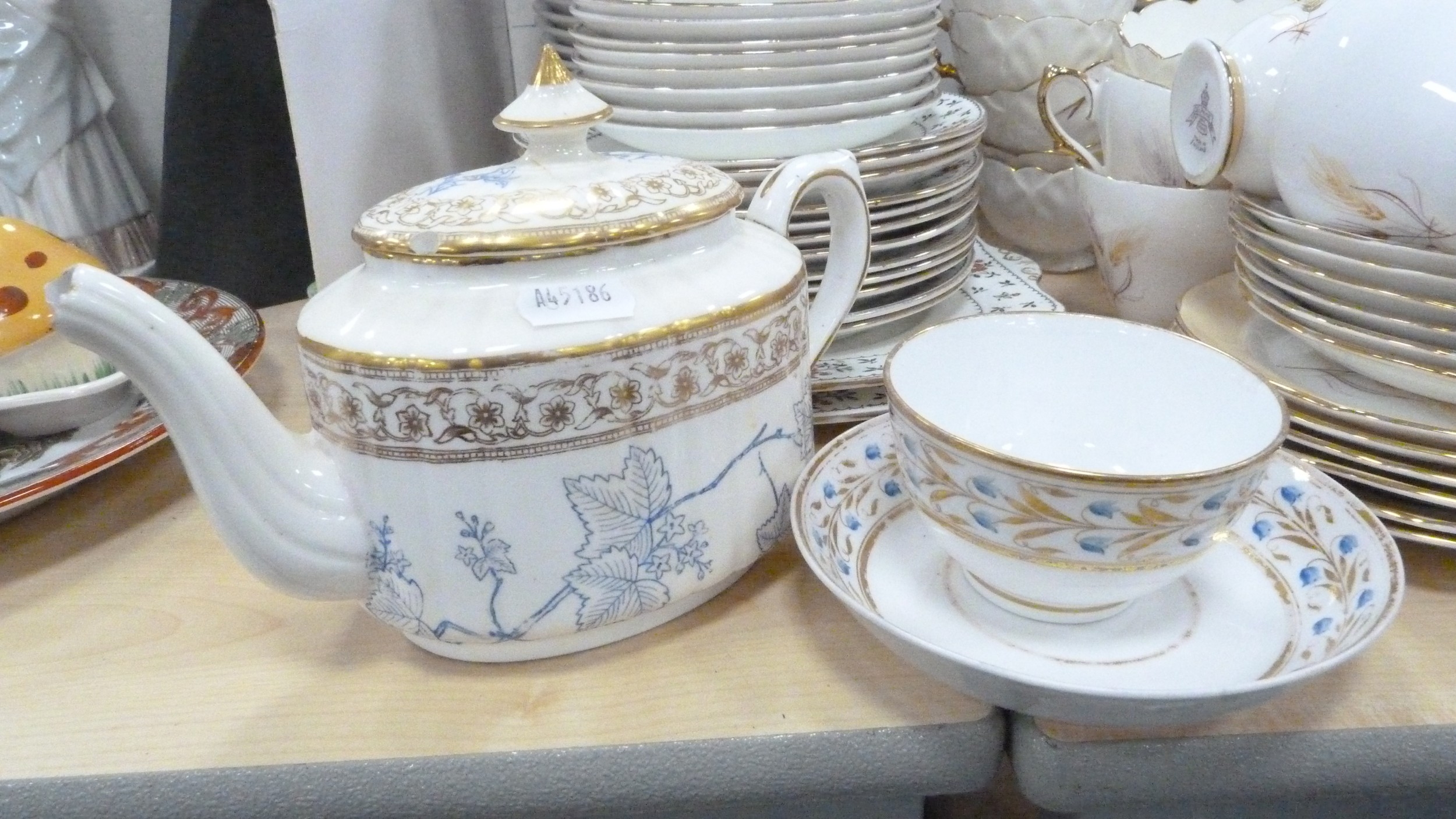 Victorian teapot, tea bowl on stand, Gladstone part tea set, decorative part tea set on white ground with gold-painted handles, Delphine tea cups and saucers, Carlton Ware cream and sugar.