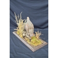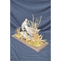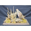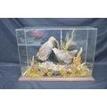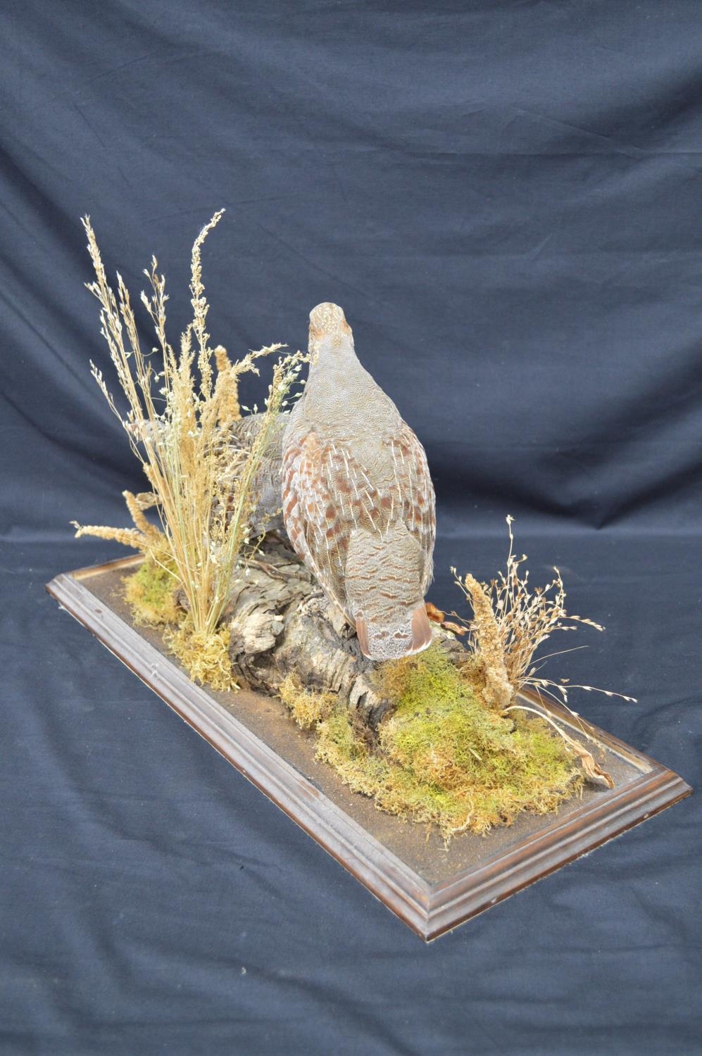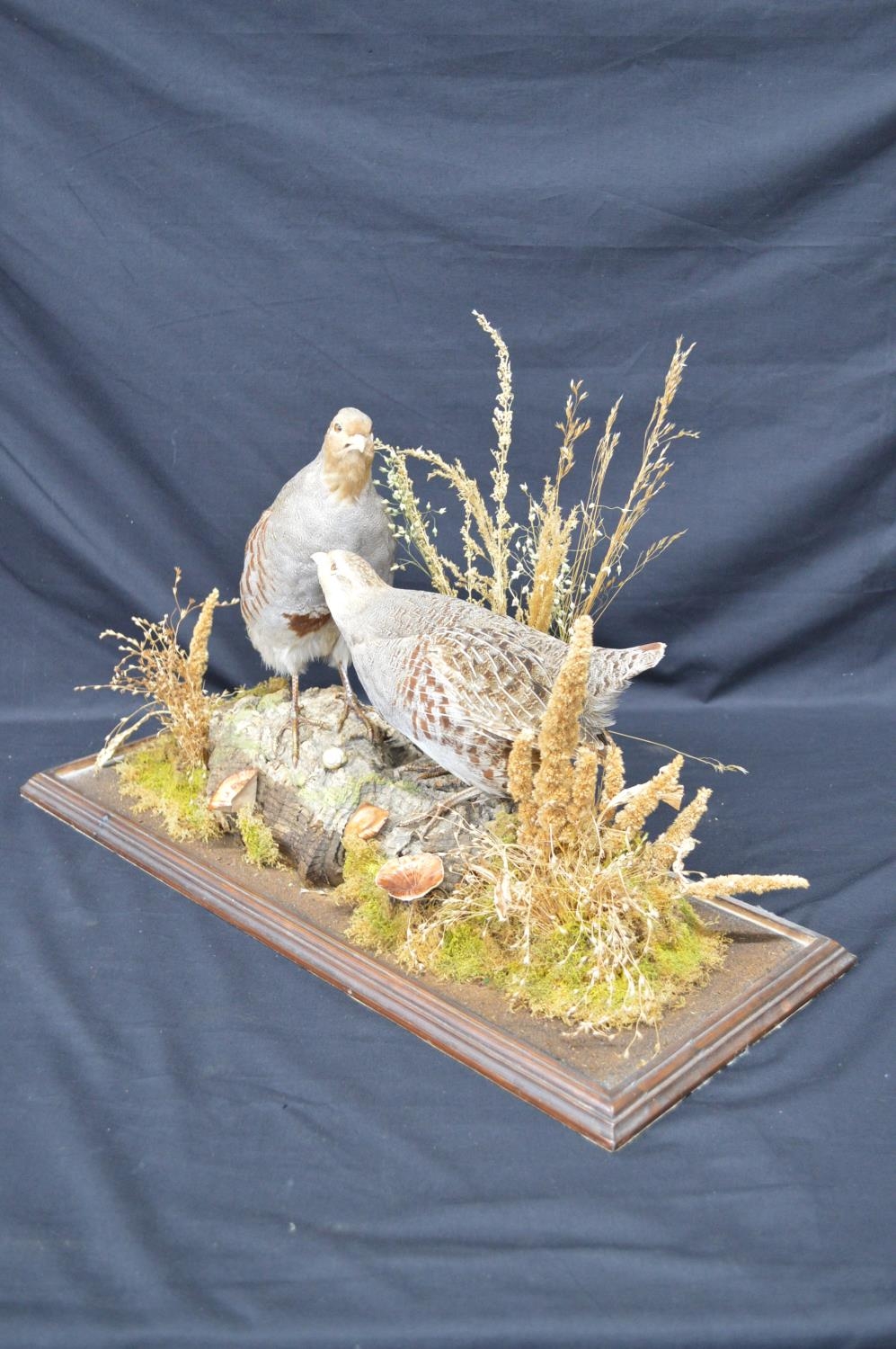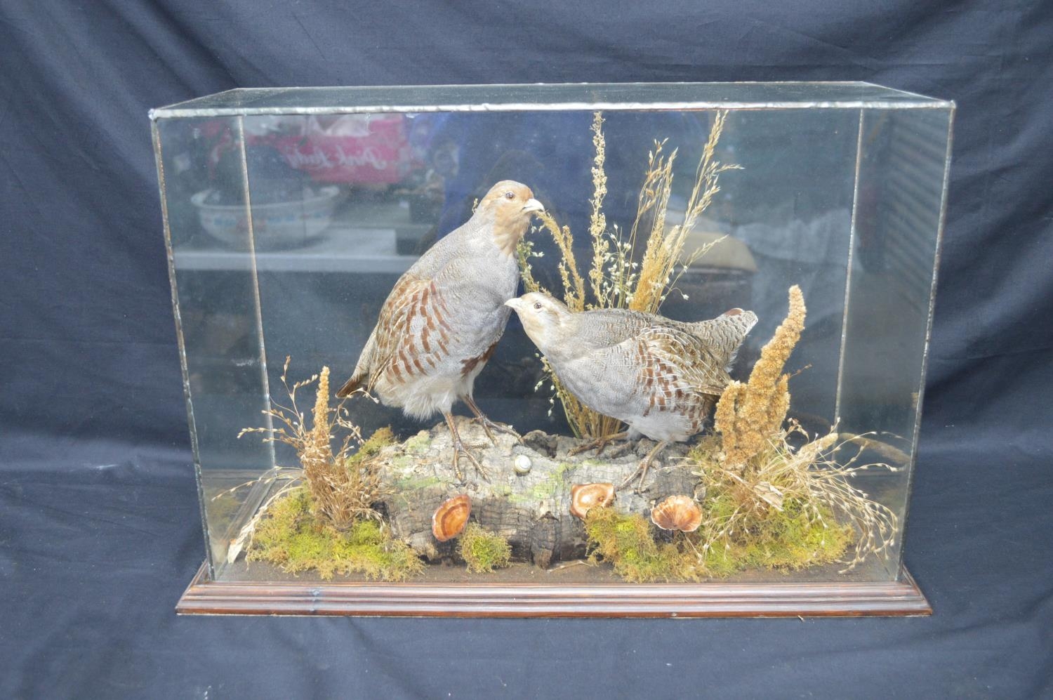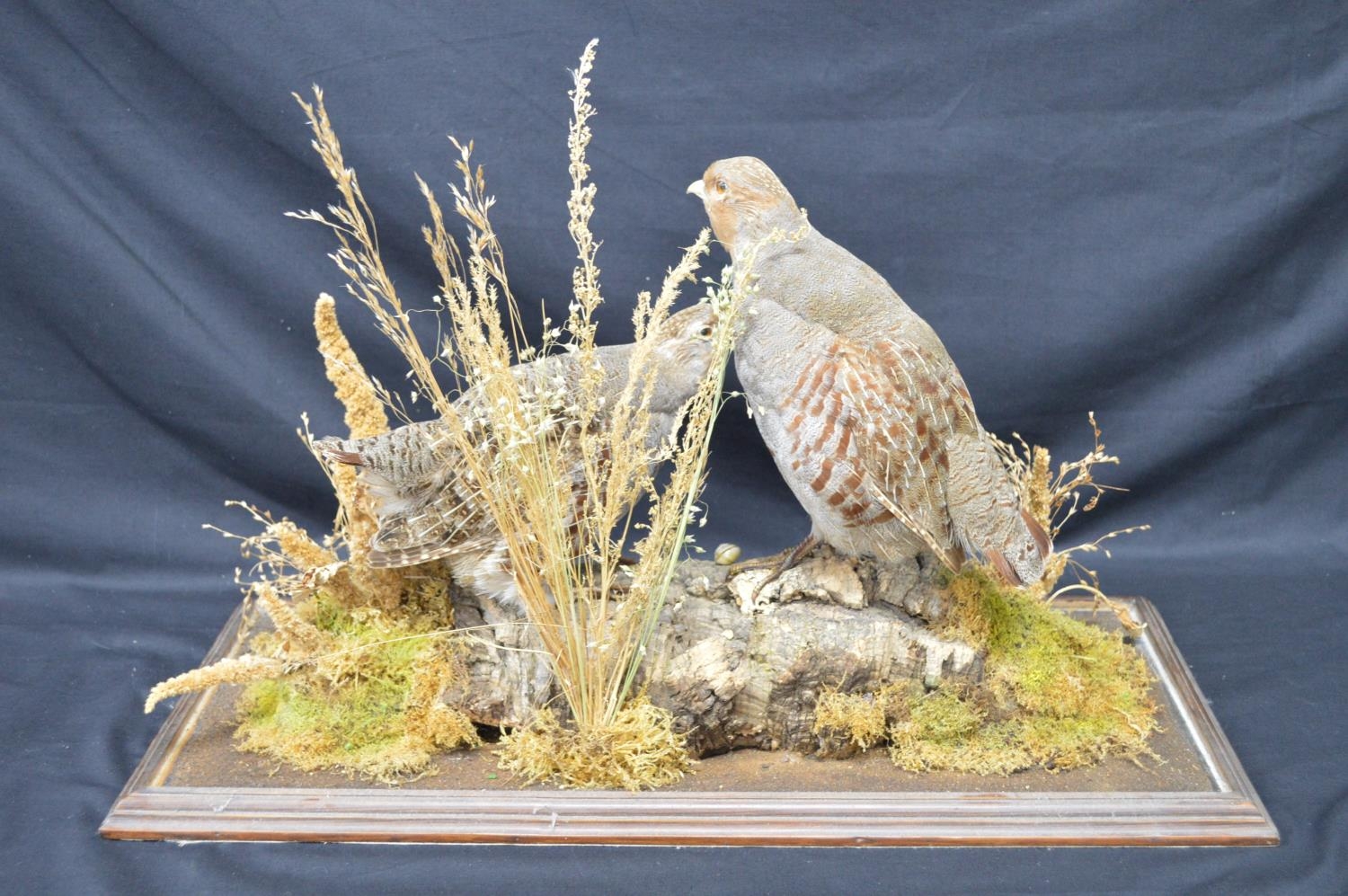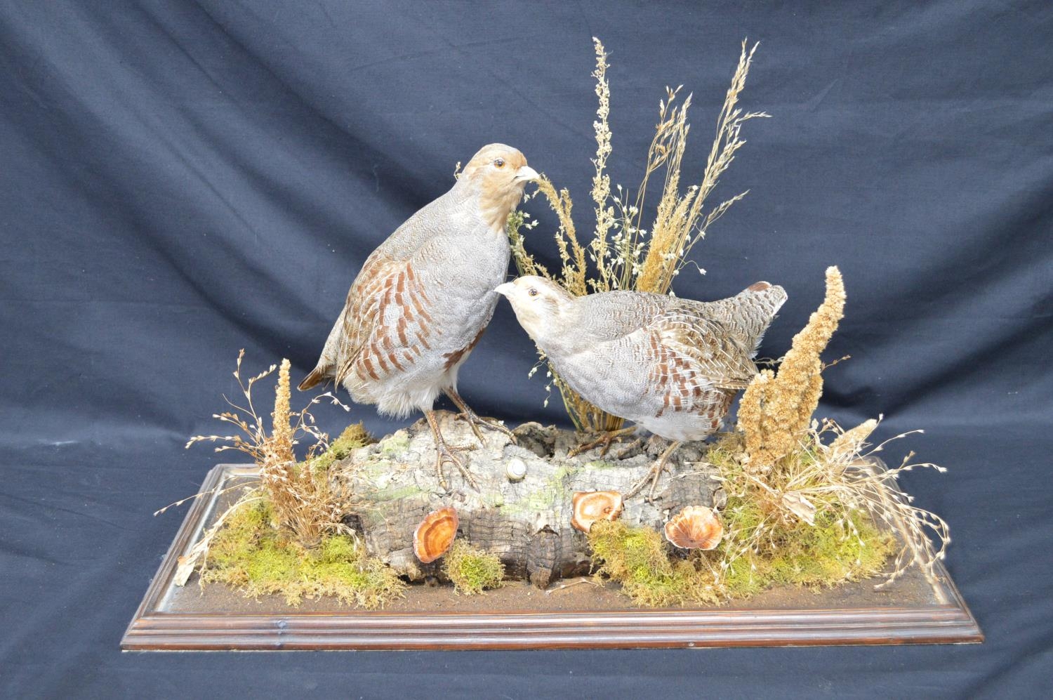 Taxidermy - two Grey Partridge in naturalistic setting and housed in glass display case, standing on wooden base - 60cm x 25cm x 40.5cm tall