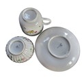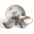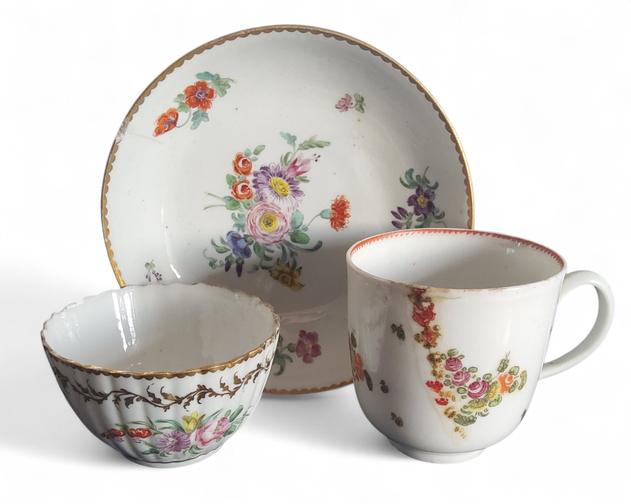 A Bristol coffee cup, decorated in polychrome with floral sprays, the interior with red rim, c.1770; a Bristol fluted tea bowl, decorated with polychrome flowers, gilt scrolling foliage band, gilt dentil rim, X mark; a Bristol saucers, with polychrome floral sprays and sprigs, gilt dentil rim, 13cm diam, crossed swords (faults)