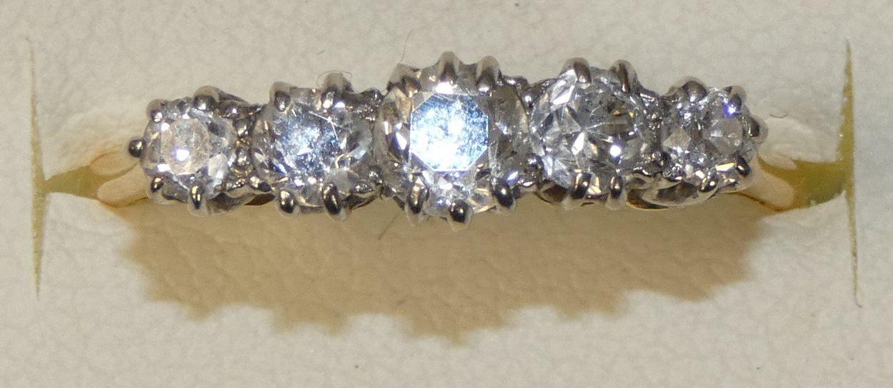 A yellow gold and diamond five stone ring, claw set with graduated old cut brilliant stones, total weight approximately 0.9 cts, size T.
