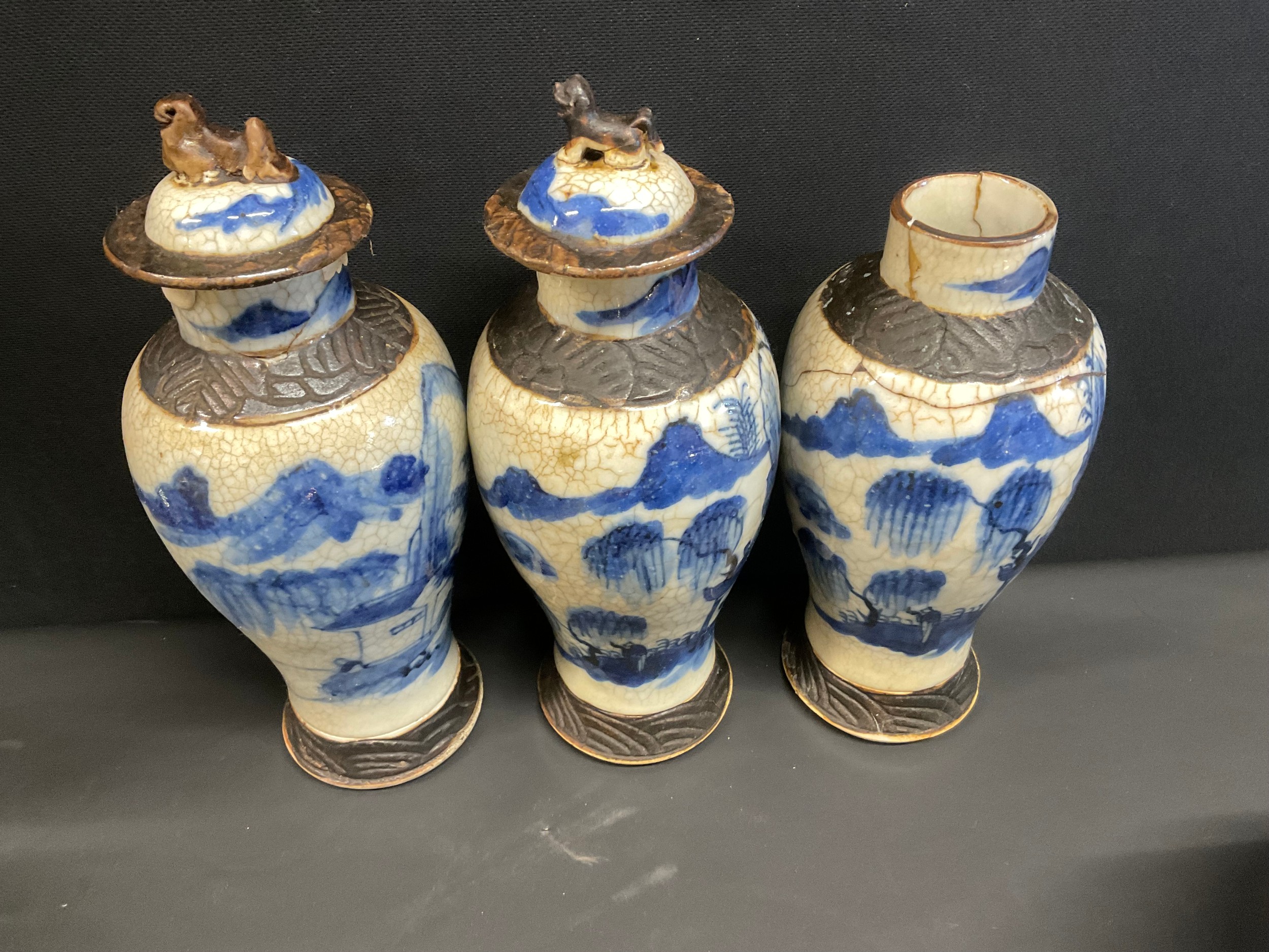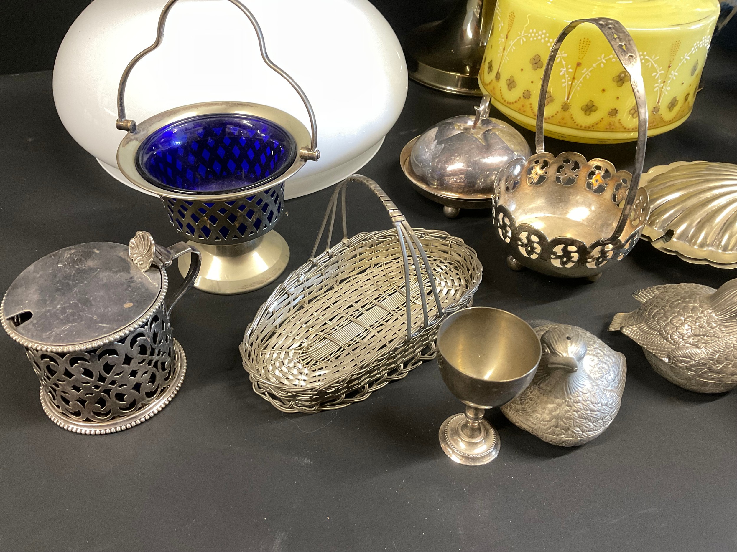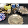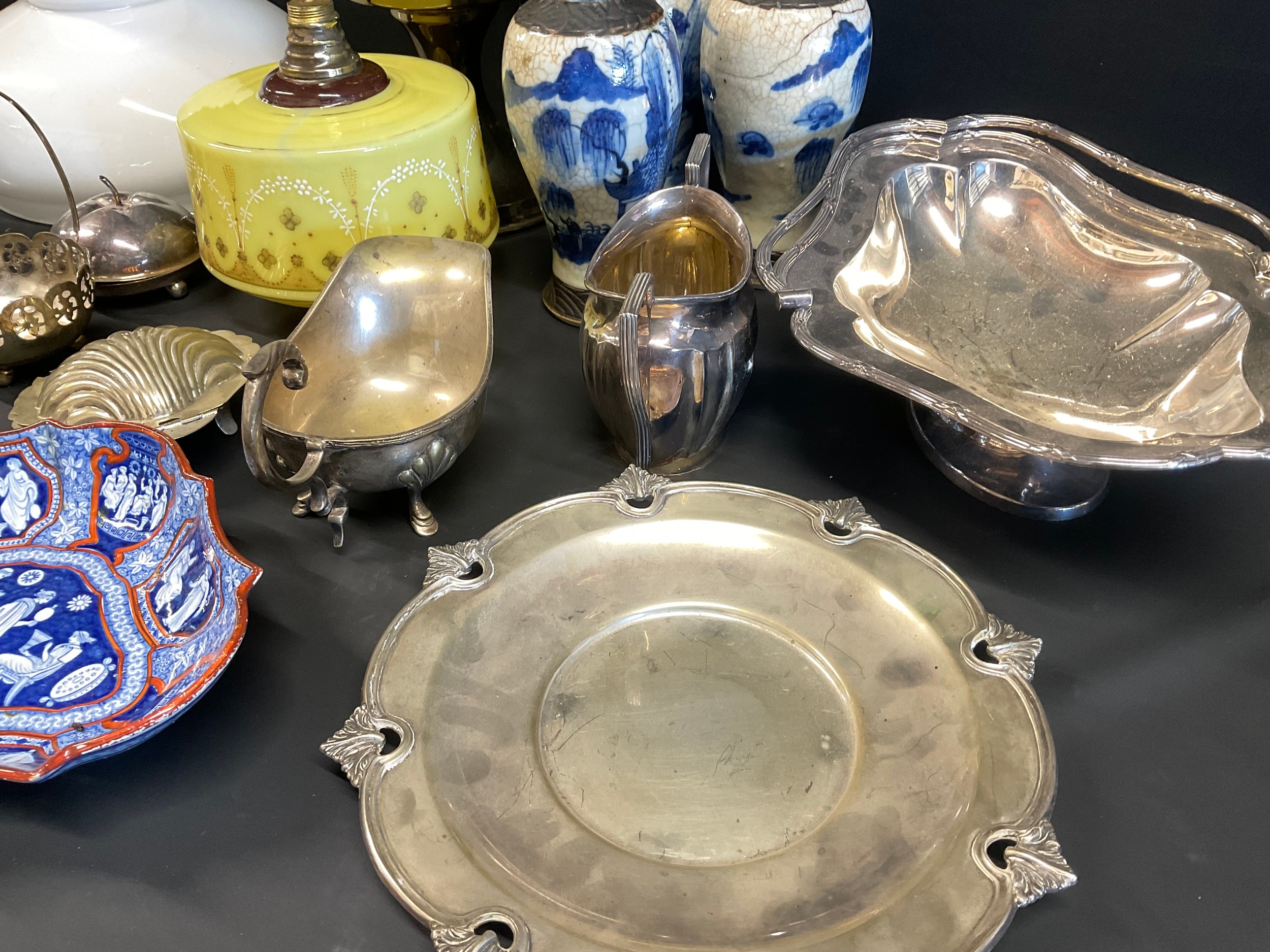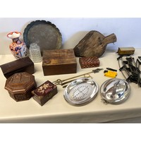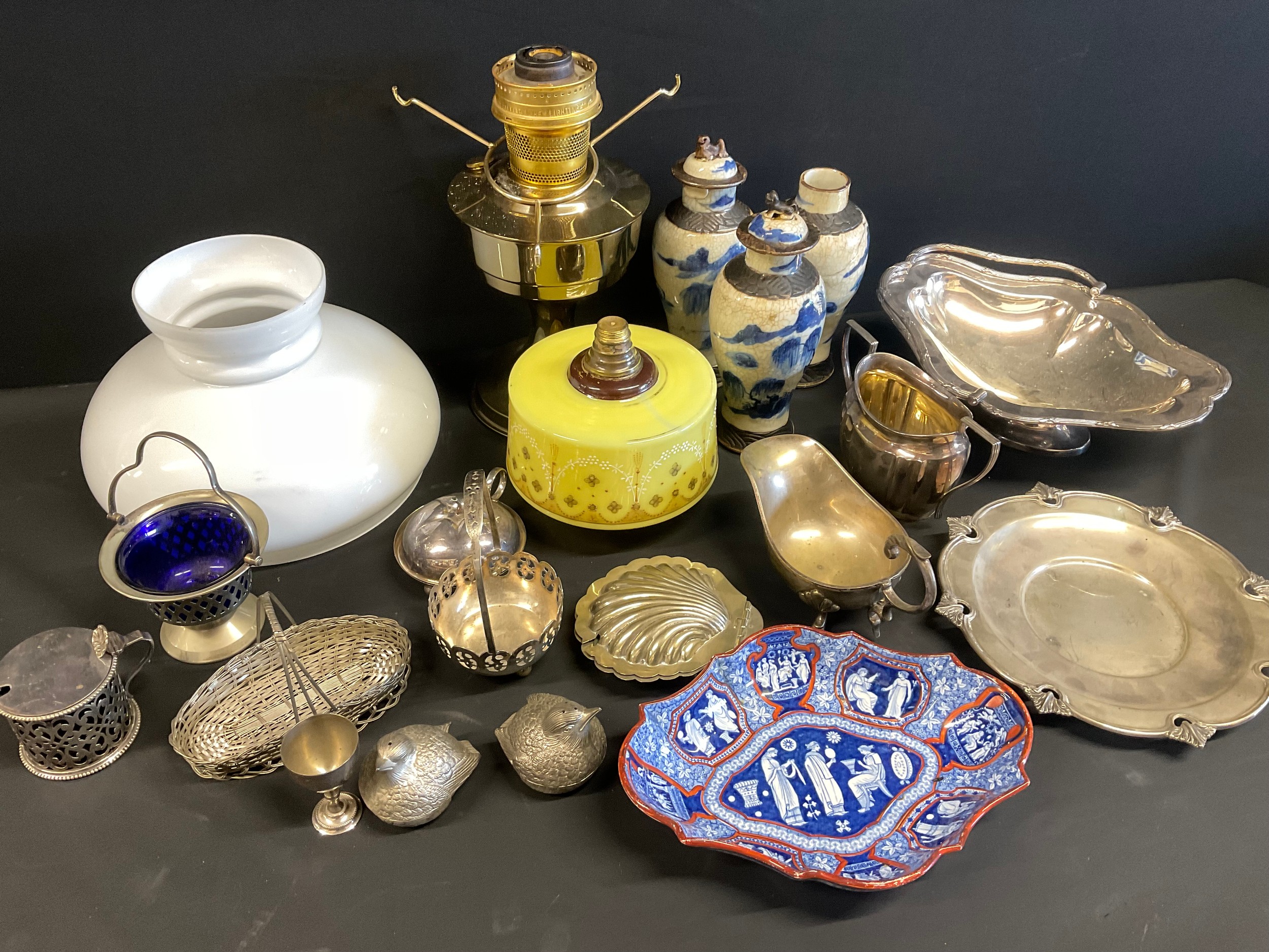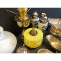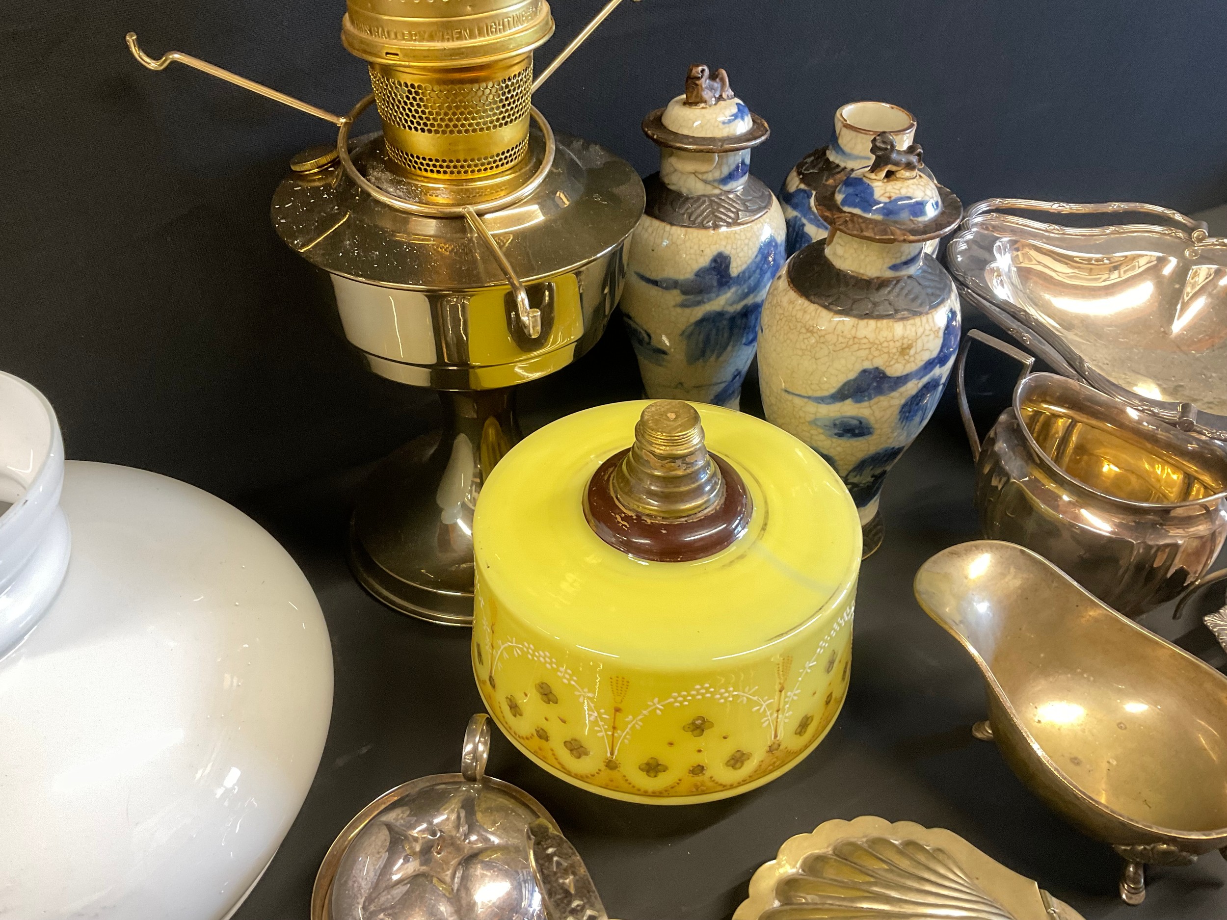 BOX OF COLECTABLES - BRASS LAMP ORIENTAL VASES ETC