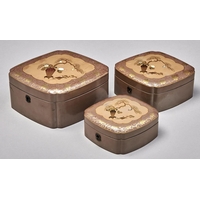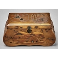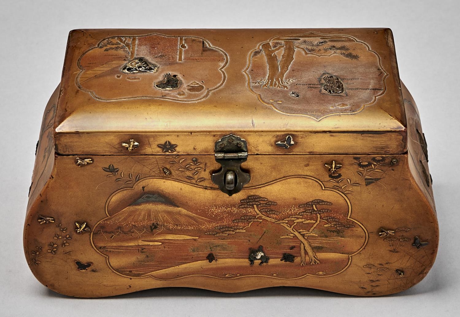A Japanese gold lacquer bag form casket, Meiji period, with travellers in an extensive landscape and subsidiary panels of figures, the interior of a house or fish over waves, 21.5cm l