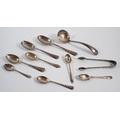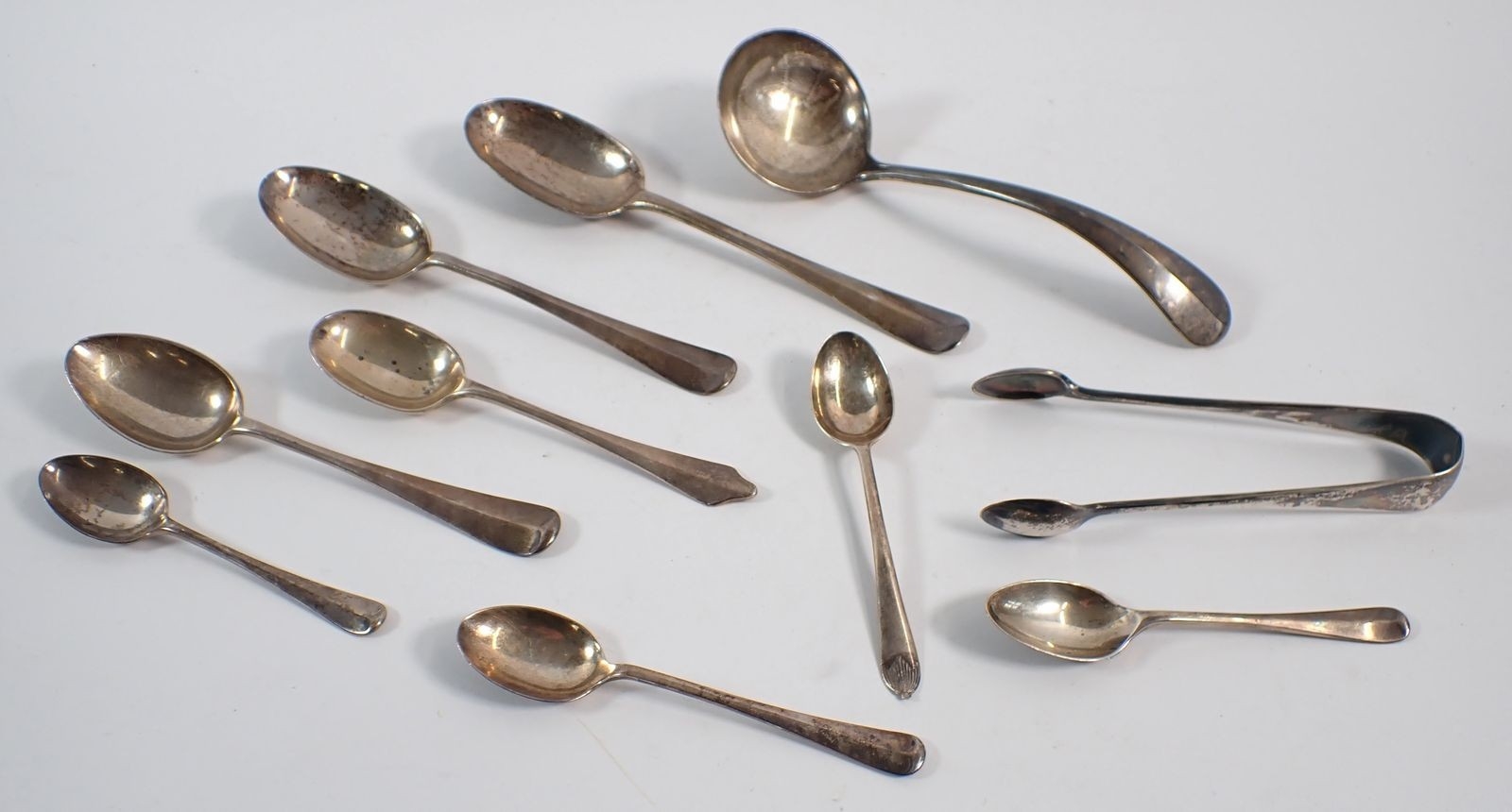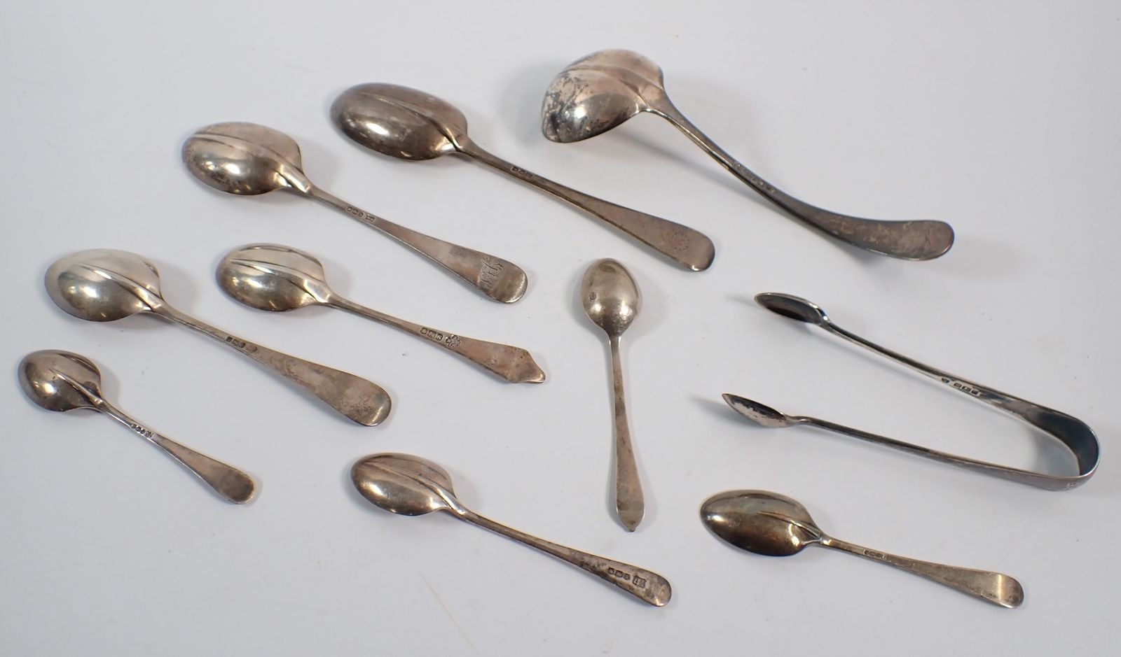 Seven various silver assorted spoons, silver sugar tongs and a small ladle, 319g