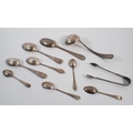 Seven various silver assorted spoons, silver sugar tongs and...